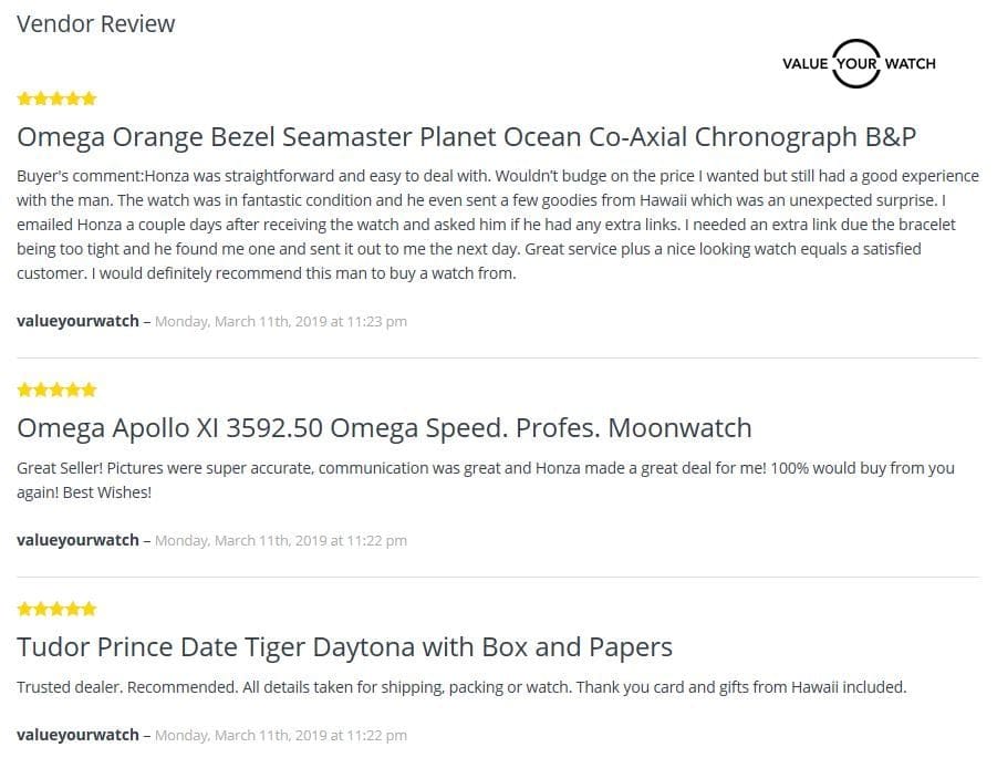 When it comes to watch dealers, you’ll probably have no need for a list of references because you’ll find reviews.