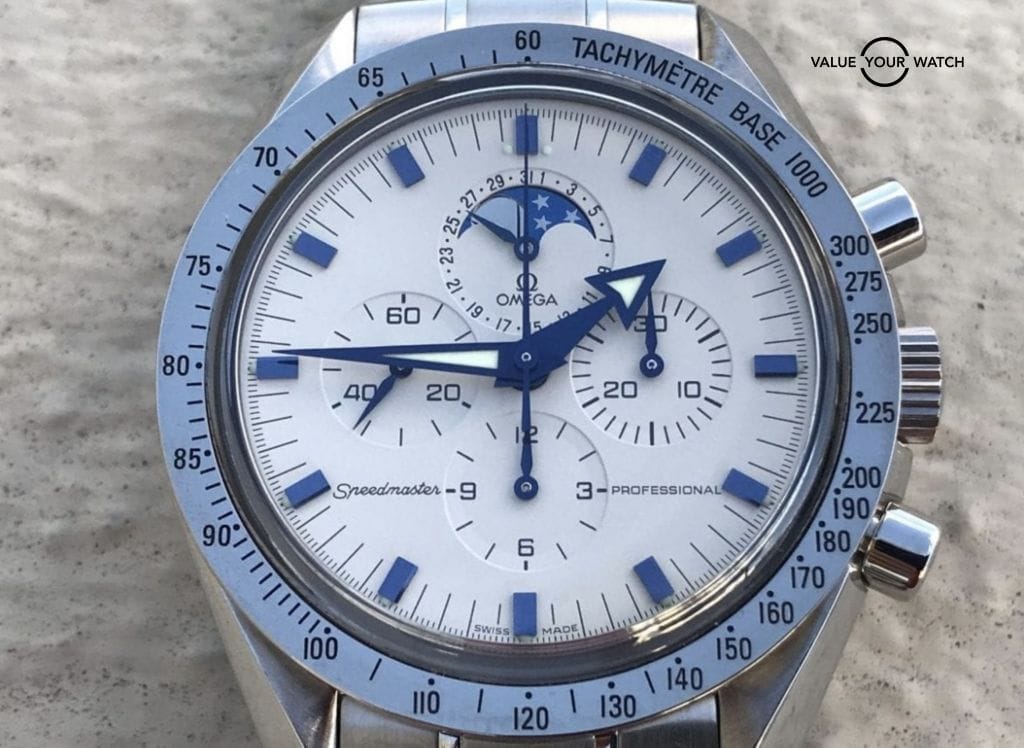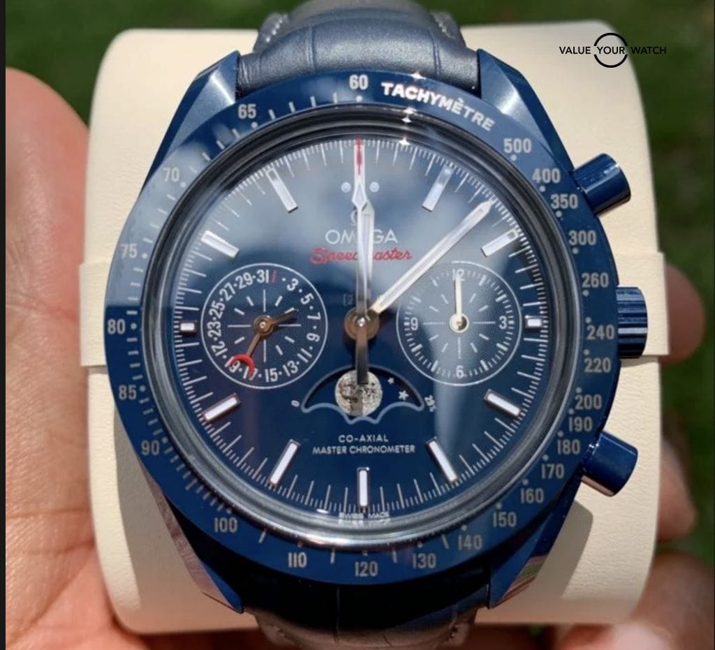 There is the Omega Speedmaster Co-Axial Master Chronometer Moonphase Chronograph 44,25mm, which is a great timepiece. This Speedmaster uses metallic crystal disc microstructured to obtain a great resolution image of the moon. This watch is powered by Caliber Omega 9904 with 60 hours of power reserve.