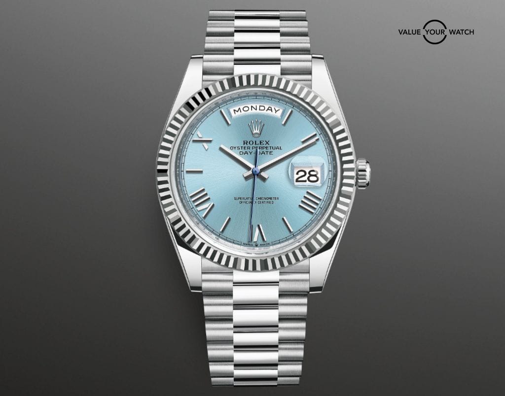To continue, we’ll cover the new Rolex Day-Date 228236. Here, the biggest change that was made was it featured a 950 Platinum fluted bezel, which was the very first time this had ever been done by Rolex. It is a big change when compared to the previous year because the prior Day-Date featured a round bezel even though both casings were still made of platinum. Outside of the bezel, there’s not really too many changes to the Day-Date: it still has the icy-blue dial, the roman numeral dial numbers, and it’s the exact same size as the previous model. Given how similar the new model is to the previous year’s model and how successful the previous year’s model was, it’s expected that the new 2022 Day-Date should be extremely successful for Rolex.