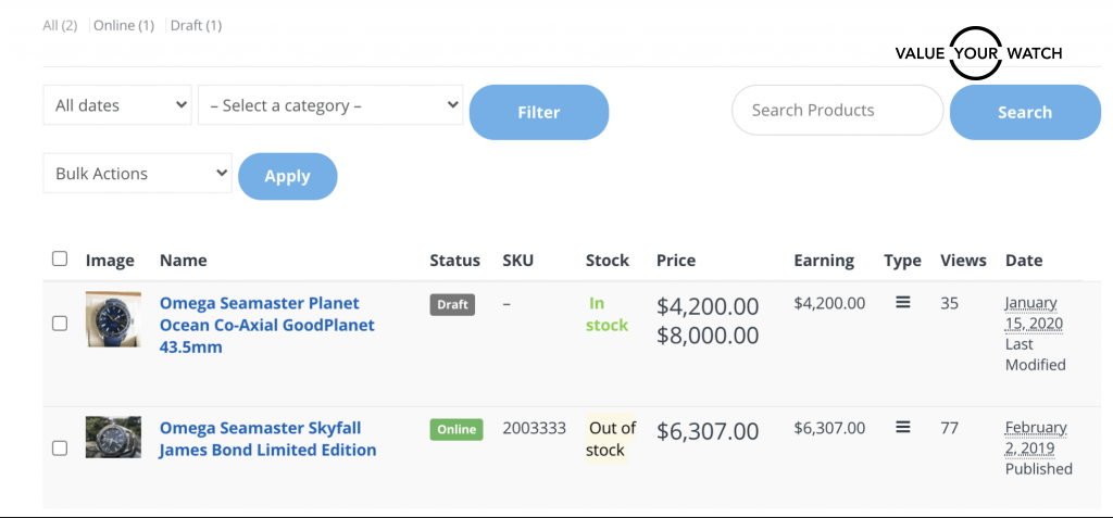 Listing your watch for sale is very easy. You can do it from your phone or your computer. The process is identical. On your dashboard, if you click at “Products” you will be able to see the entire dashboard and also how many more products you can add.