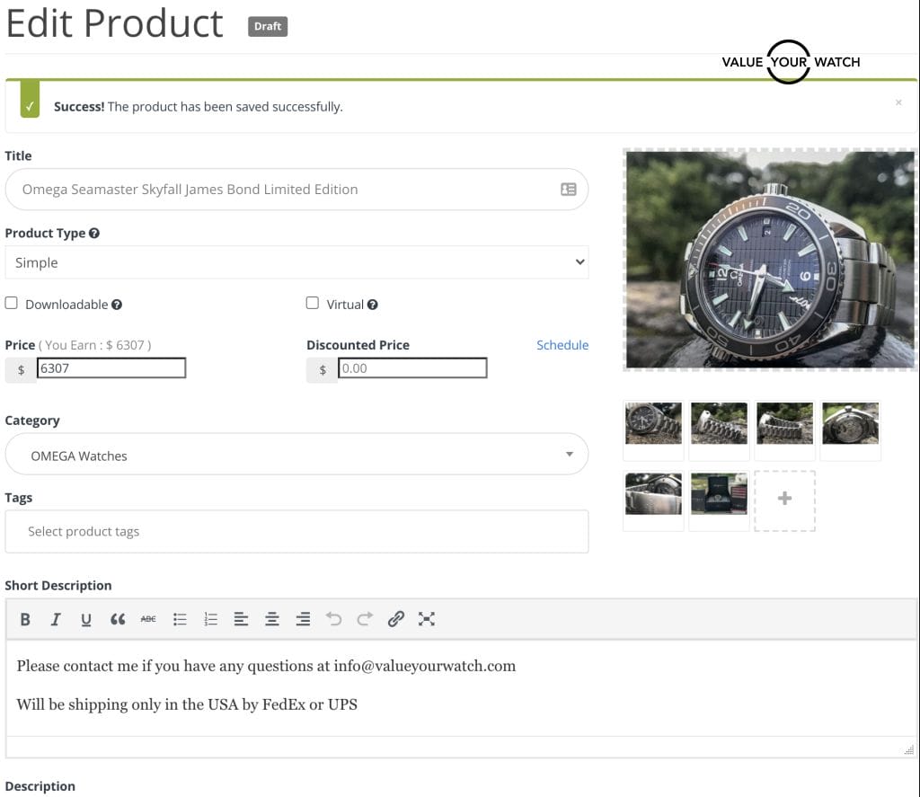 When you get to the “Edit Product” you are able to see what pictures you have uploaded as well as the information from the previous site. Right under the “Short Description”, there is “Description which is the main description to describe your watches for sale.
