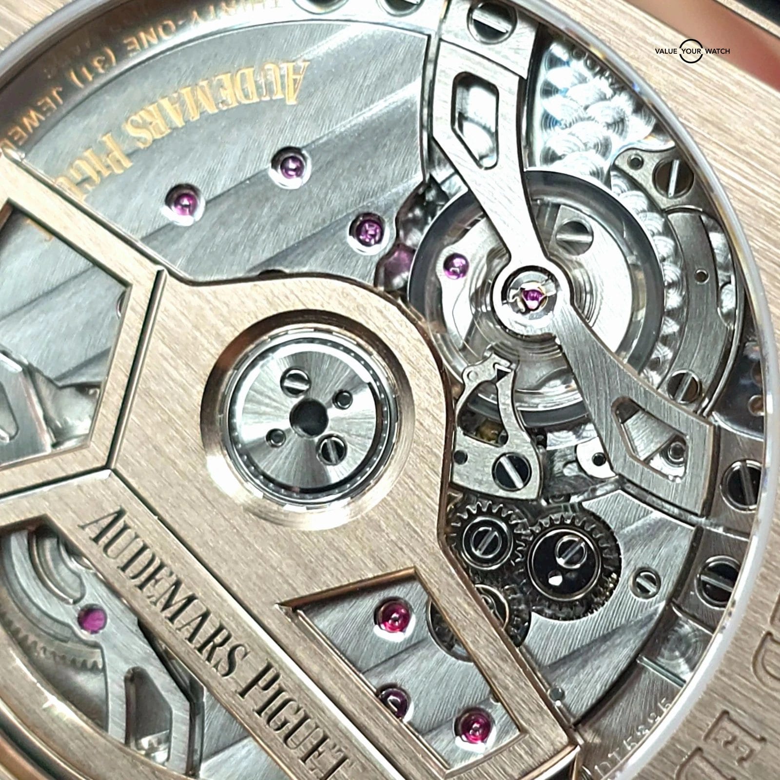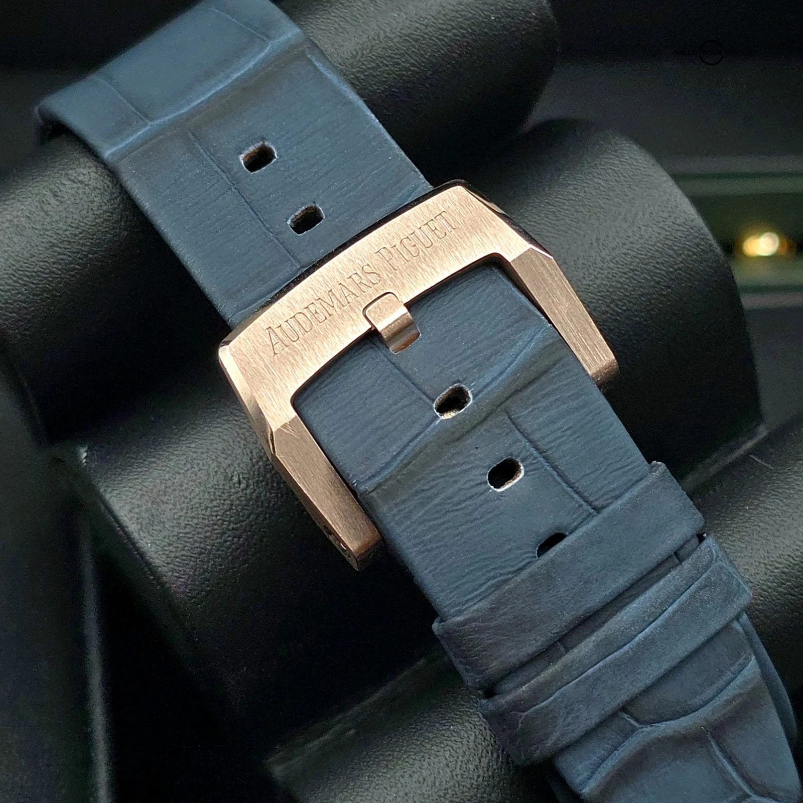 The case is made from a new alloy by AP called Sand Gold- not quite white gold, and not quite rose. The hue of this gold, coupled with the fully brushed facets on every angled surface, give the whole watch a very downplayed sort of elegance- which I prefer. The idea of this being a brutalist creation is certainly warranted.