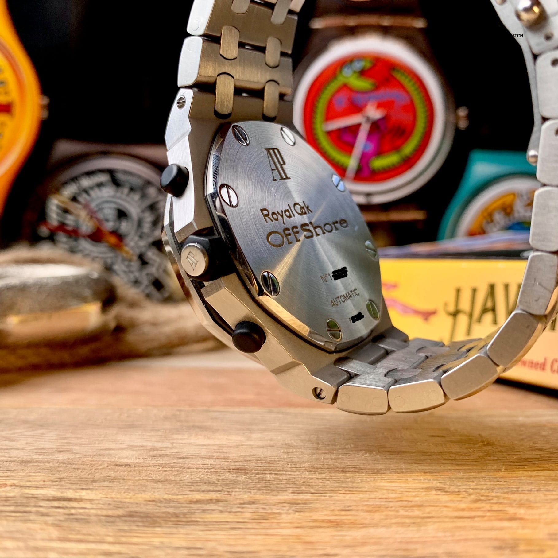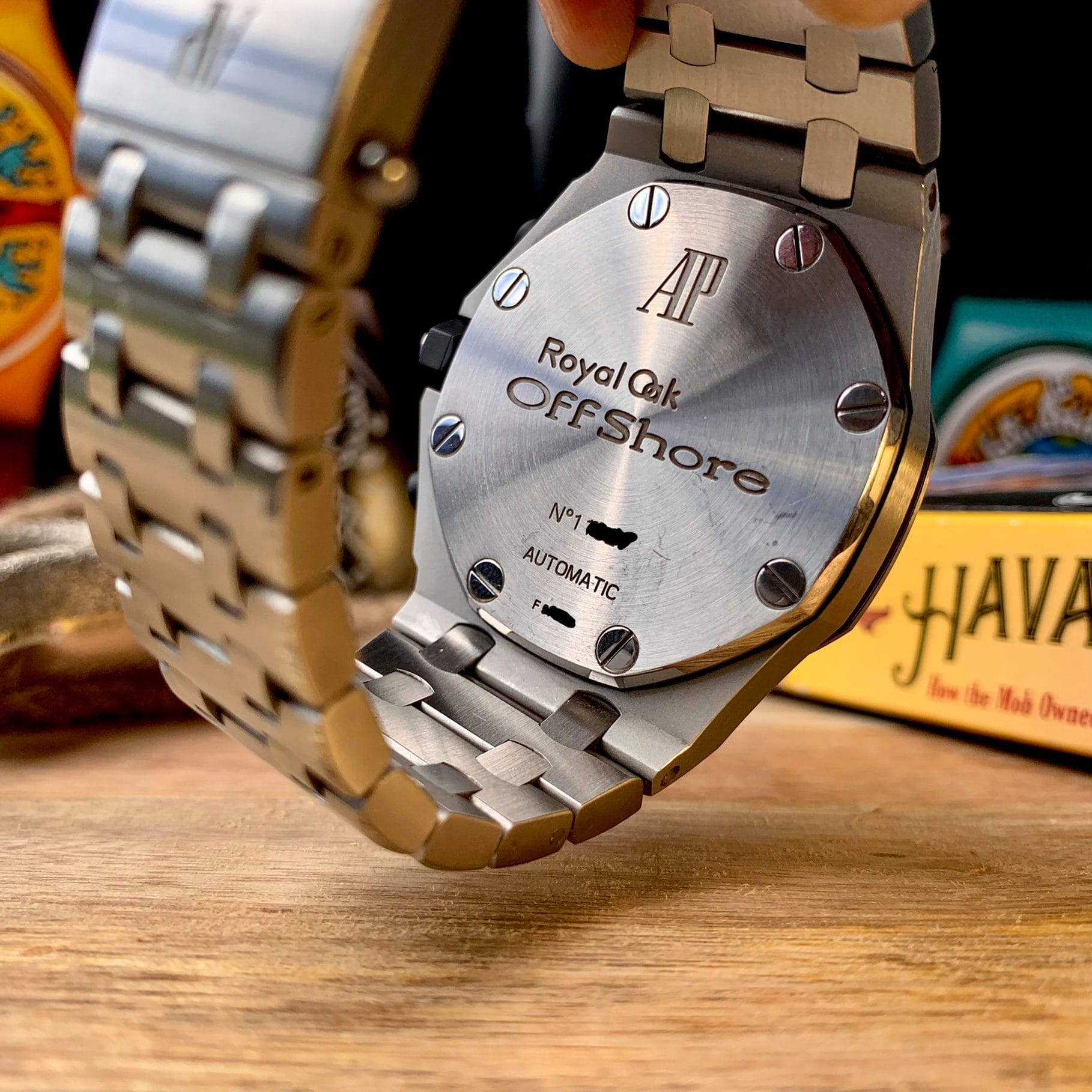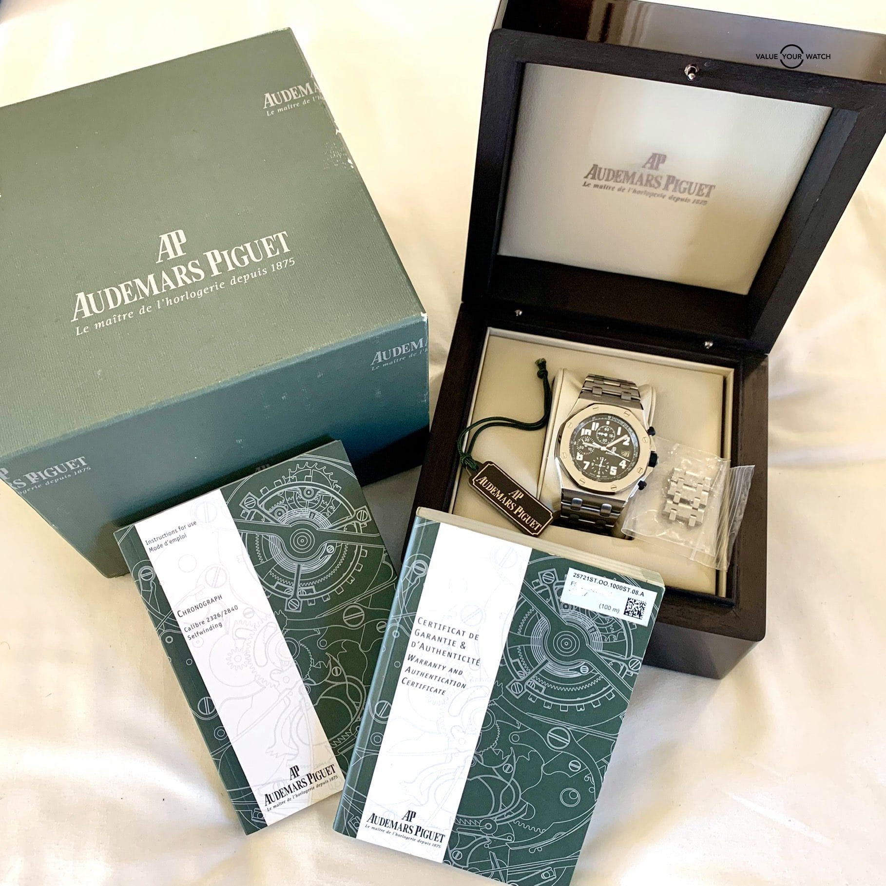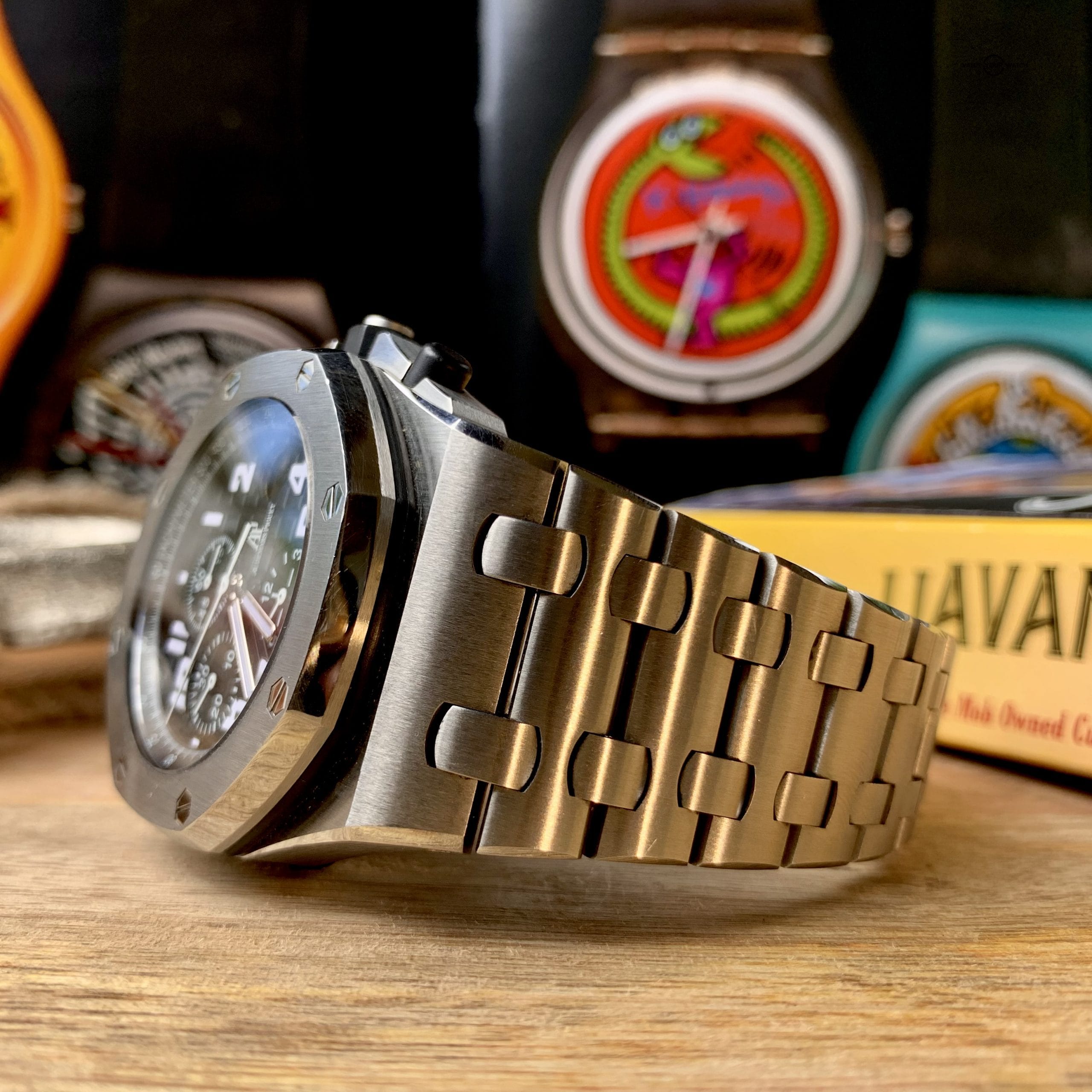 Audemars Piguet Royal Oak Offshore 25721ST “The Beast”. Possibly the most beautiful sports watch Audemars Piguet has ever made, it features a 42mm case size on stainless steel bracelet. Sporty while exuding class and elegance, the design is unmistakeable. Very rare to find with the Guilloche Black Dial and Black Subdials. It is in very good condition and shows only minor signs of normal wear. This timepiece has a self winding automatic movement, date indication, and full function chronograph. Includes full links to fit any size wrist. This is a complete set with original Audemars Piguet presentation boxes, hang tag, extra links, instruction booklet, and Audemars Piguet Certificate of Guaranty/Authentication Certificate. $31,750