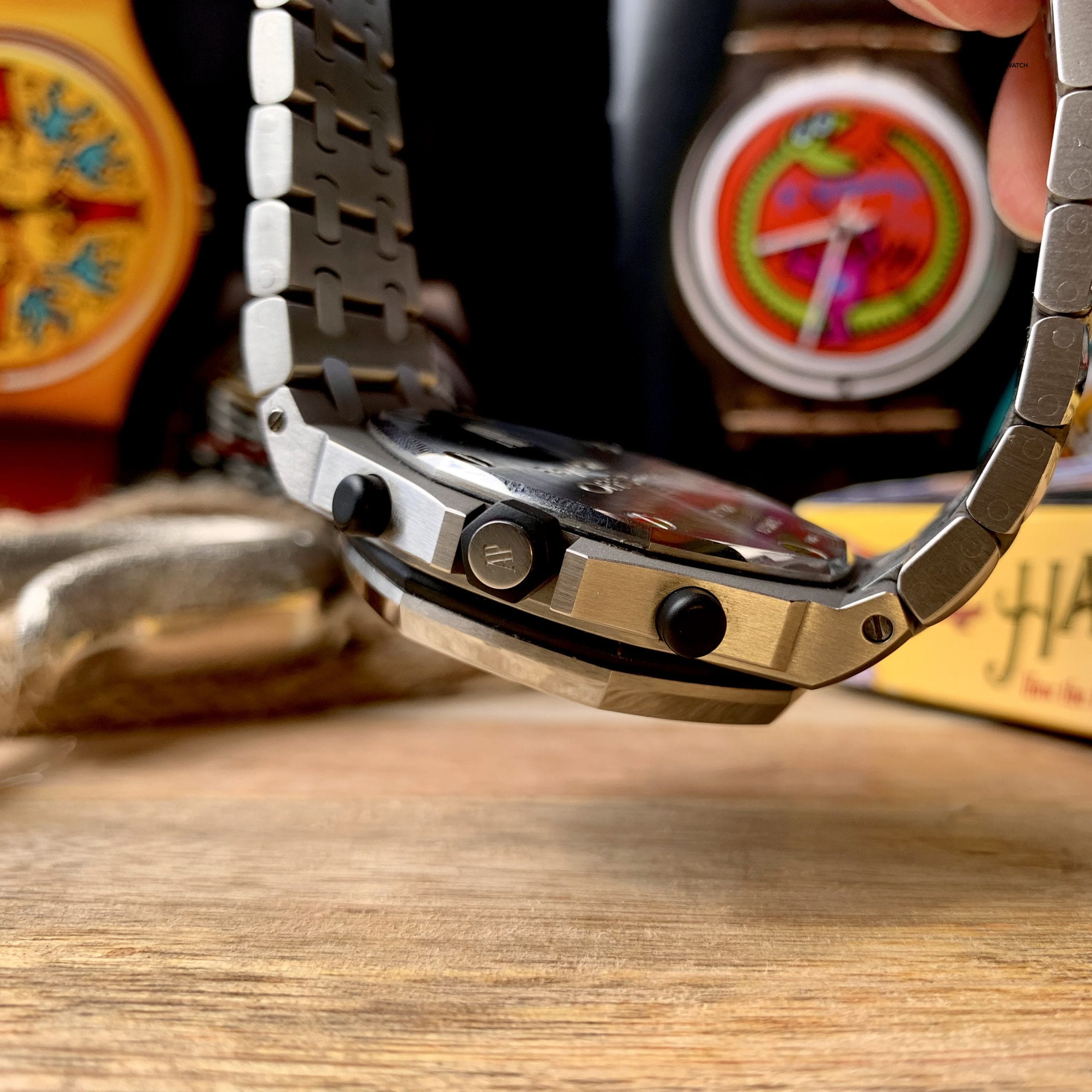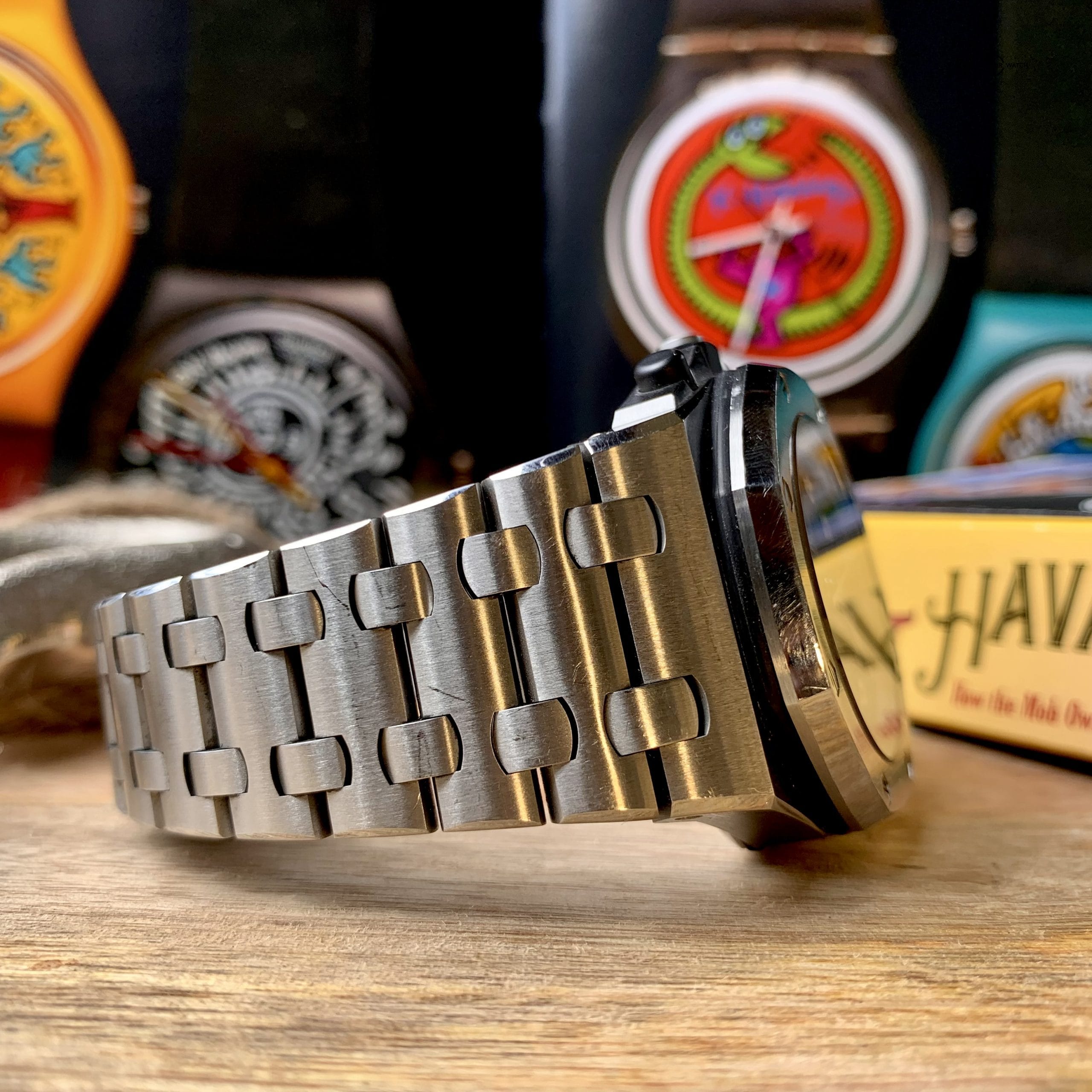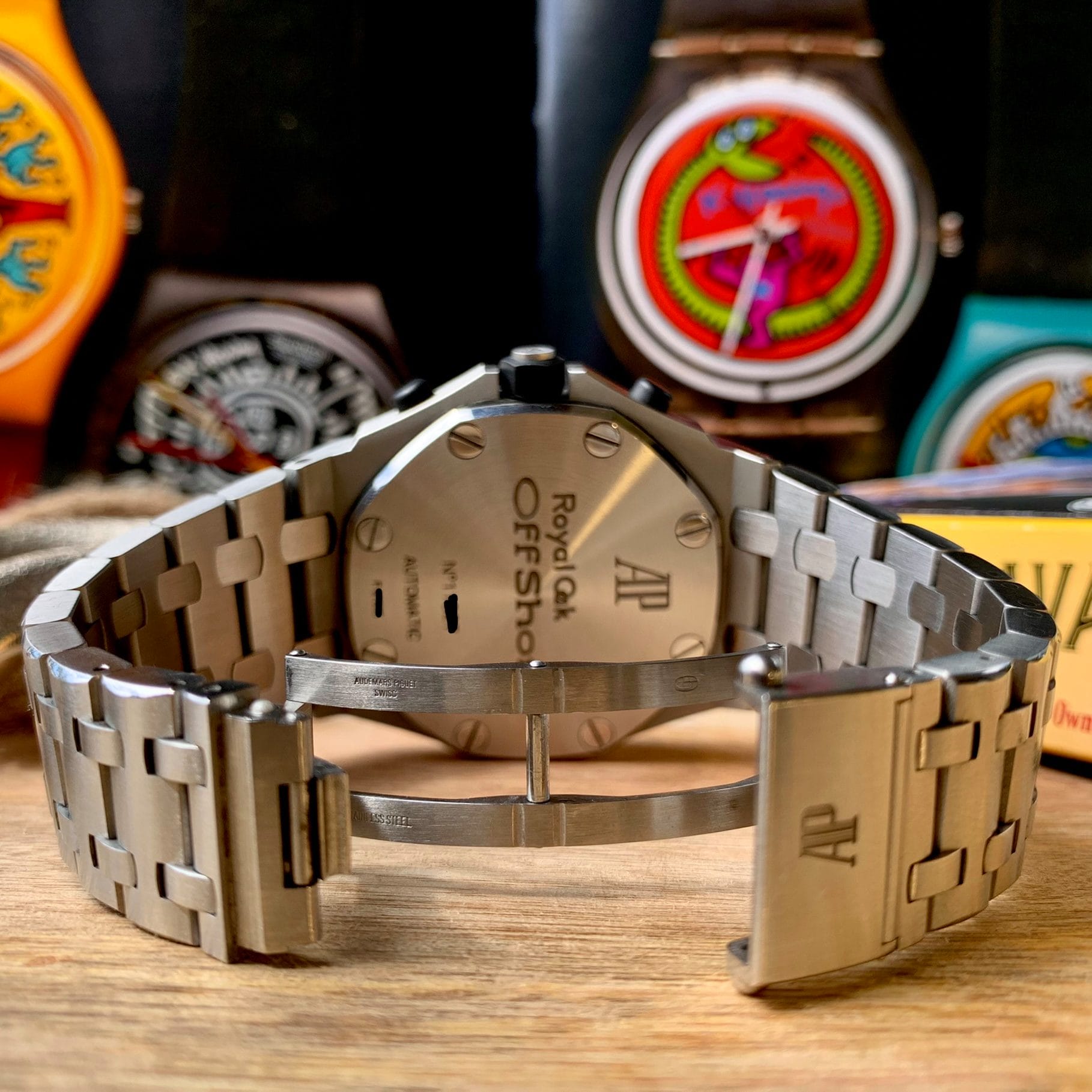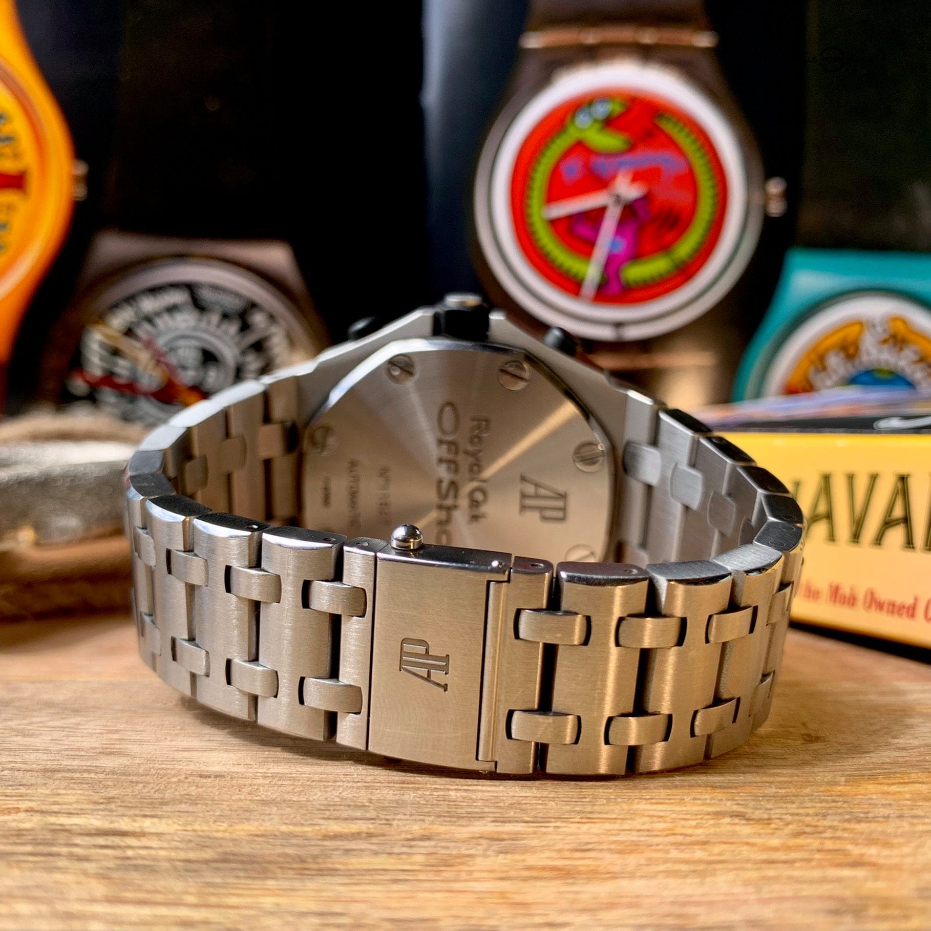 Audemars Piguet Royal Oak Offshore 25721ST “The Beast”. Possibly the most beautiful sports watch Audemars Piguet has ever made, it features a 42mm case size on stainless steel bracelet. Sporty while exuding class and elegance, the design is unmistakeable. Very rare to find with the Guilloche Black Dial and Black Subdials. It is in very good condition and shows only minor signs of normal wear. This timepiece has a self winding automatic movement, date indication, and full function chronograph. Includes full links to fit any size wrist. This is a complete set with original Audemars Piguet presentation boxes, hang tag, extra links, instruction booklet, and Audemars Piguet Certificate of Guaranty/Authentication Certificate. $31,750
