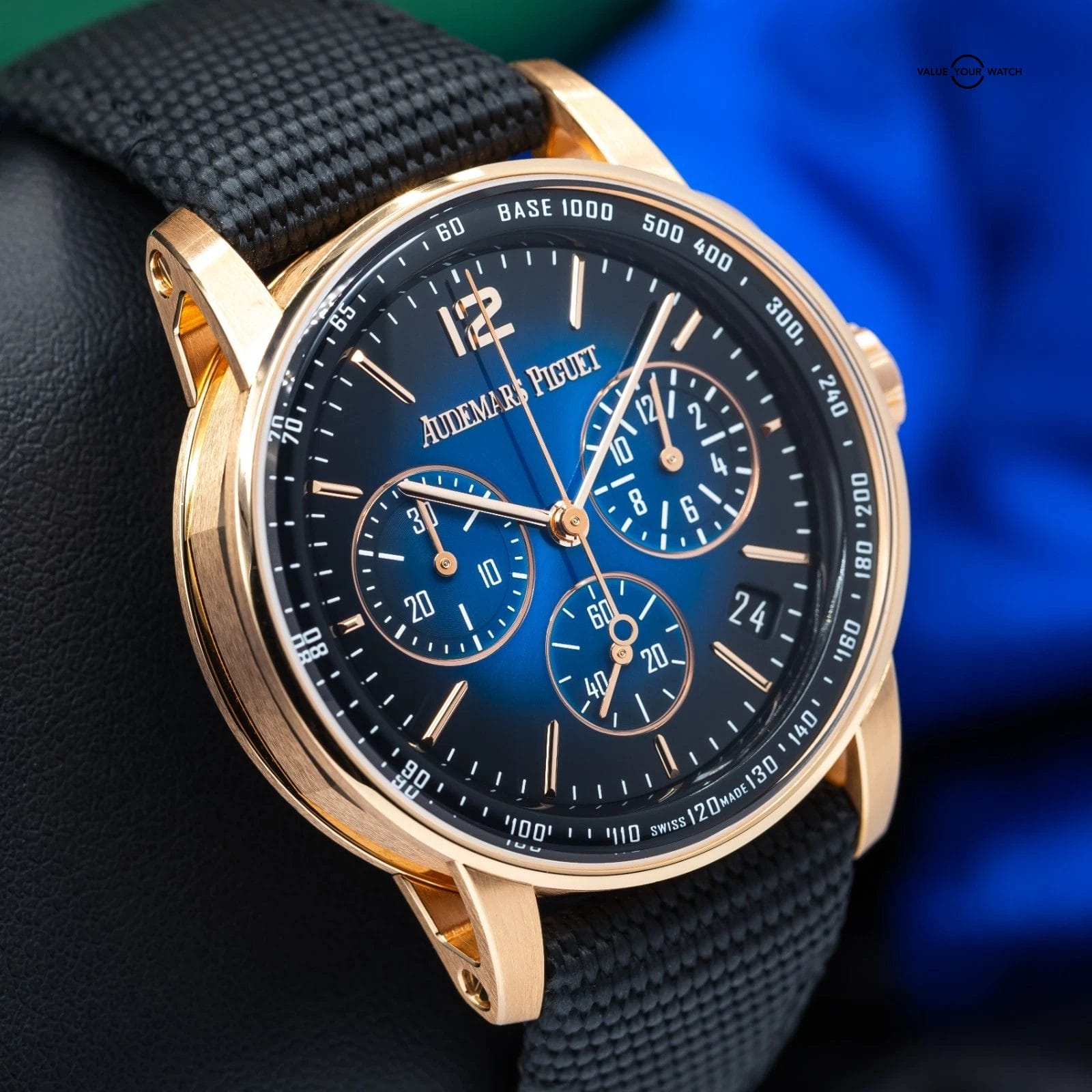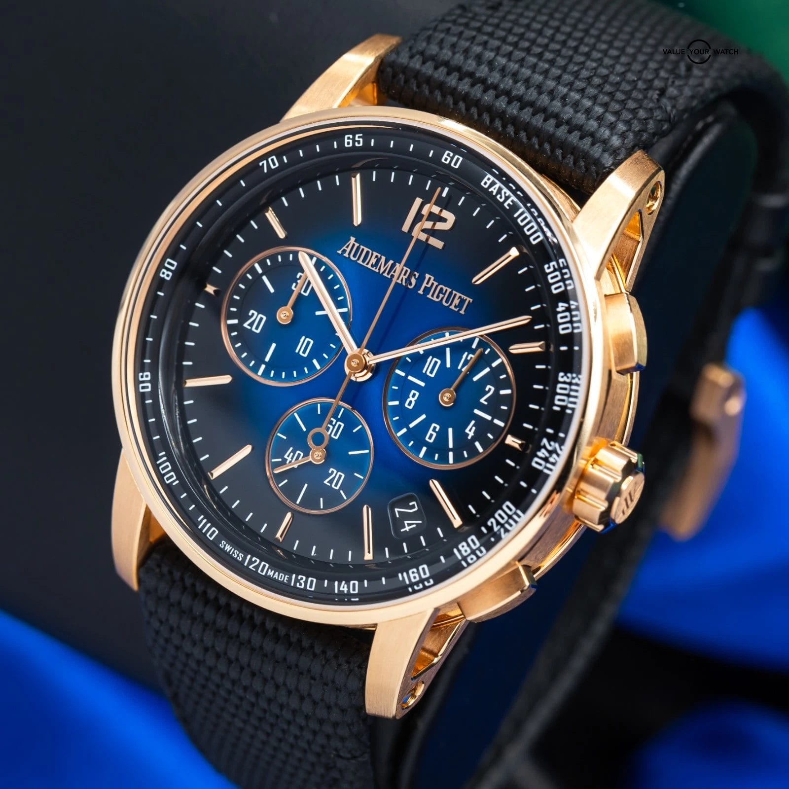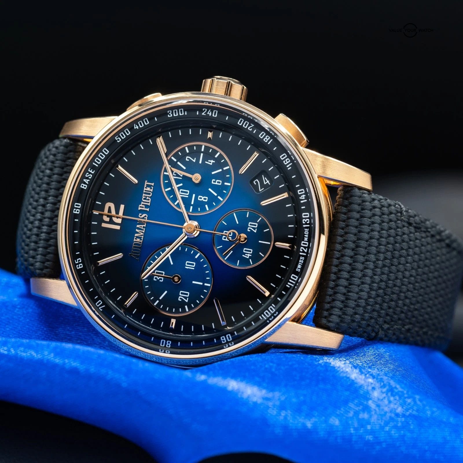 Bold, refined, and unmistakably modern, the Audemars Piguet Code 11.59 Chronograph 26393OR.OO.A002KB.03 is a striking expression of contemporary haute horlogerie. The beautiful gradient blue dial is nothing short of stunning—deep, dynamic, and constantly shifting with the light—perfectly contrasted by the warmth of the rose gold case. Paired with a black rubber-coated strap, this configuration delivers wrist presence and versatility like no other on the market.