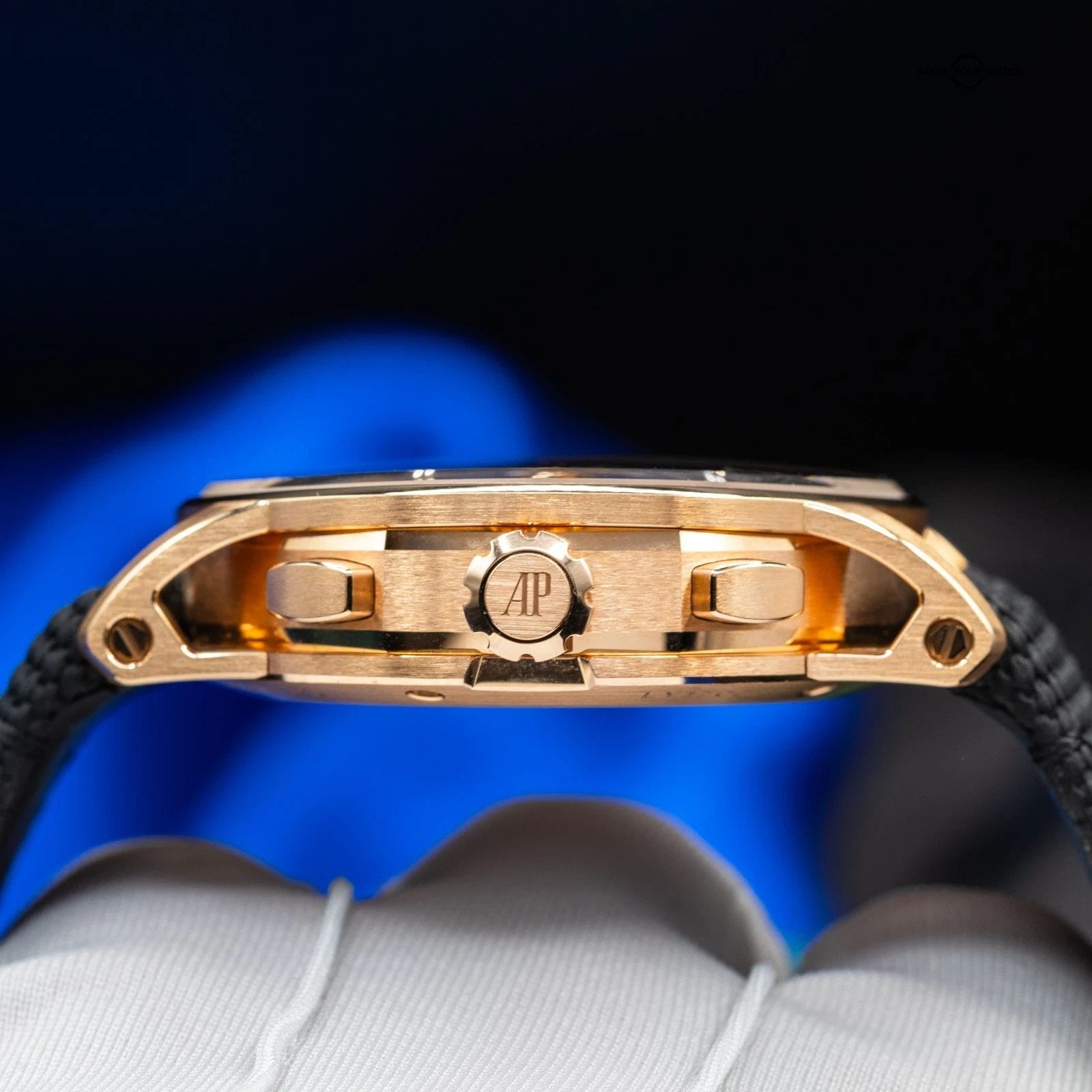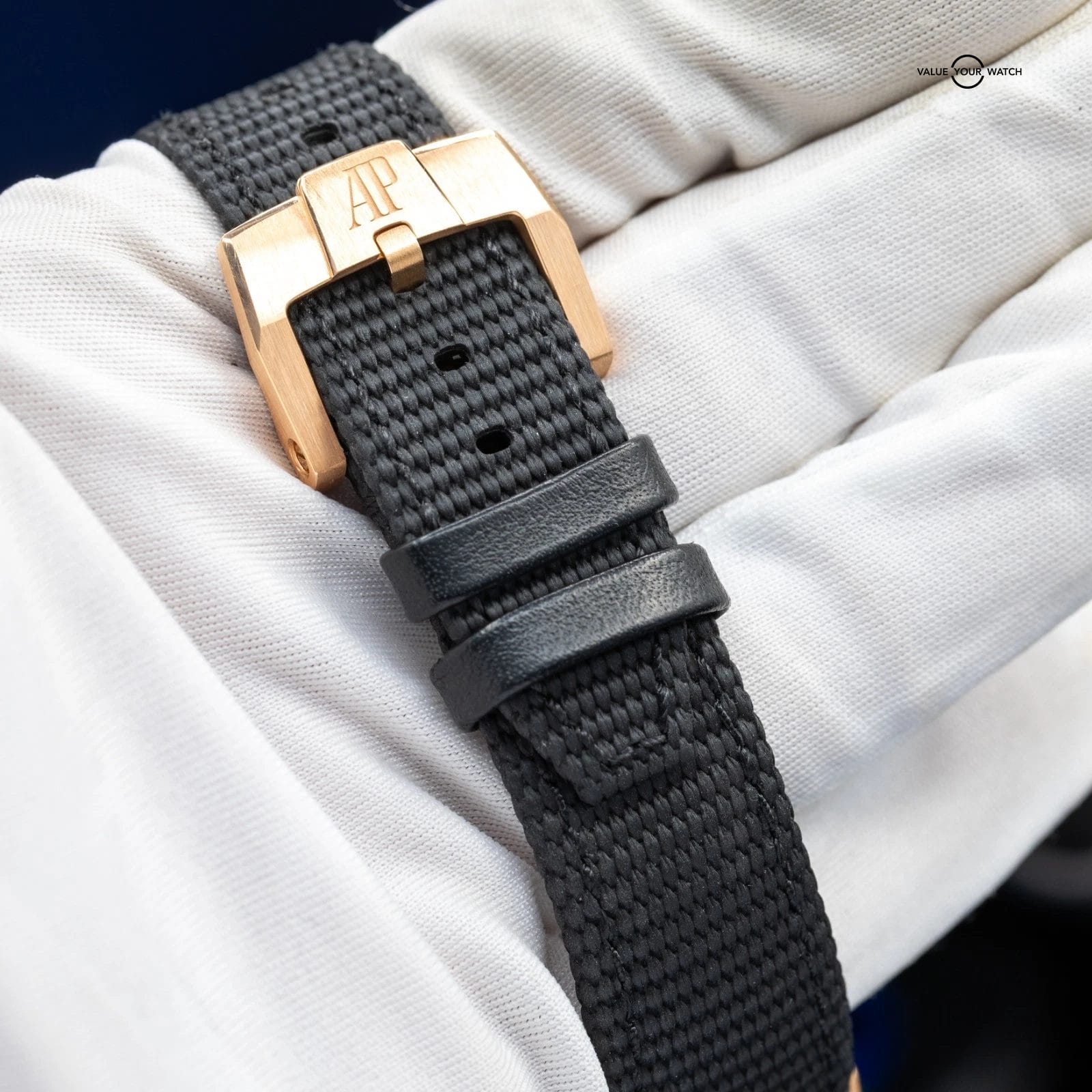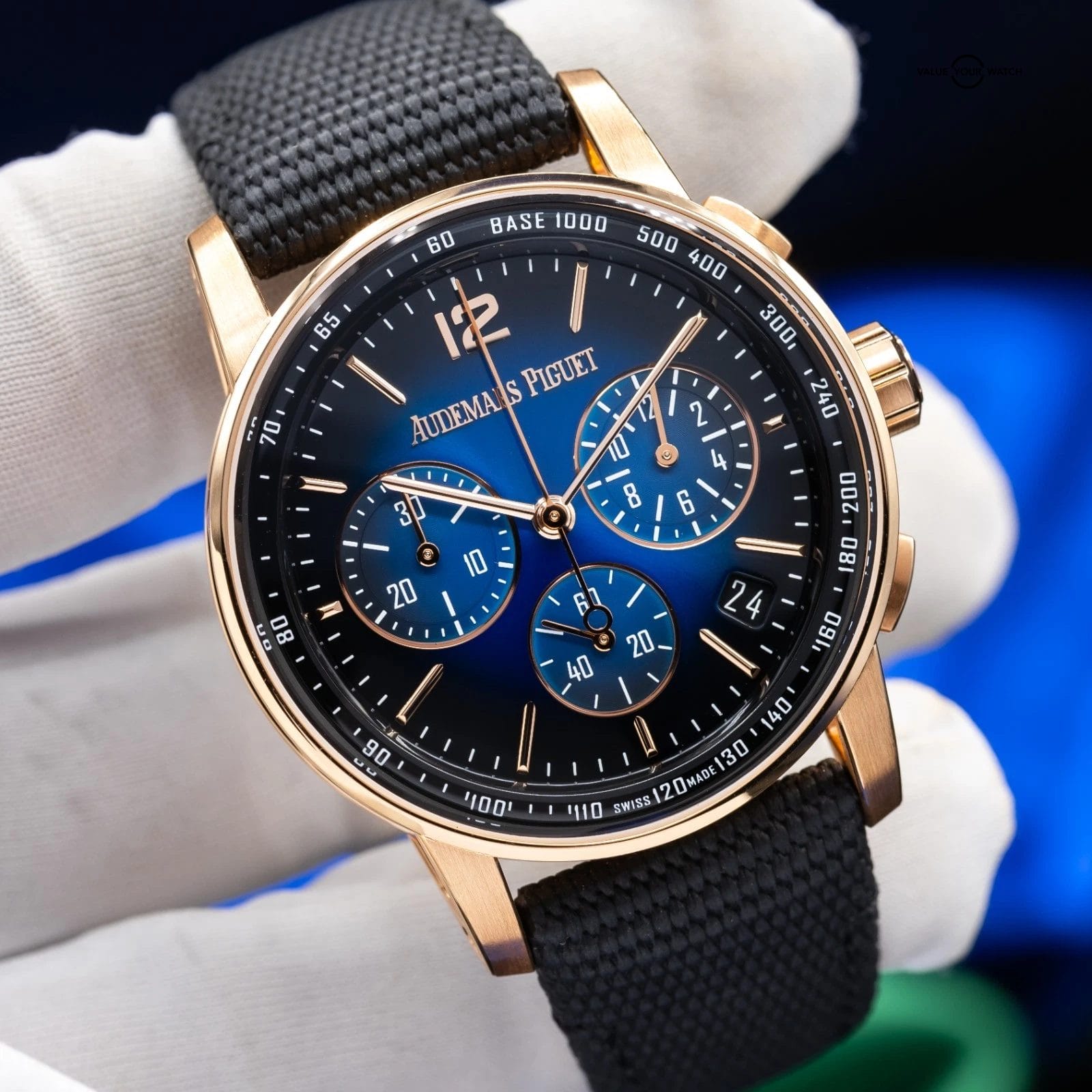 Bold, refined, and unmistakably modern, the Audemars Piguet Code 11.59 Chronograph 26393OR.OO.A002KB.03 is a striking expression of contemporary haute horlogerie. The beautiful gradient blue dial is nothing short of stunning—deep, dynamic, and constantly shifting with the light—perfectly contrasted by the warmth of the rose gold case. Paired with a black rubber-coated strap, this configuration delivers wrist presence and versatility like no other on the market.