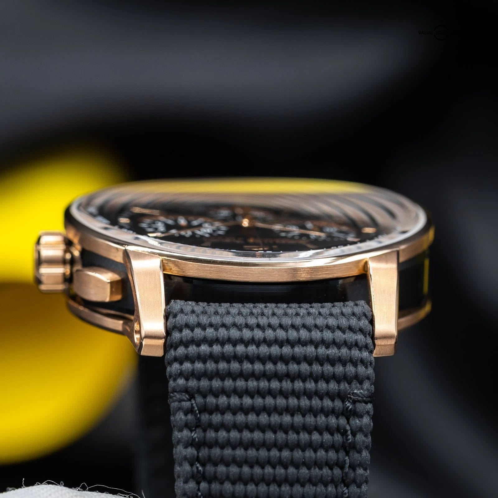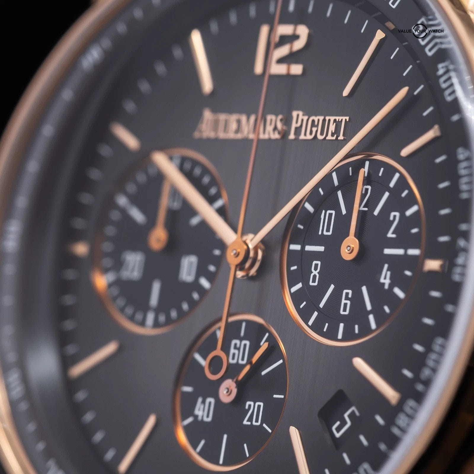 · Dial: Smoked grey dial with vertical satin-brushed finish; rose gold applied hour-markers and hands; black inner bezel