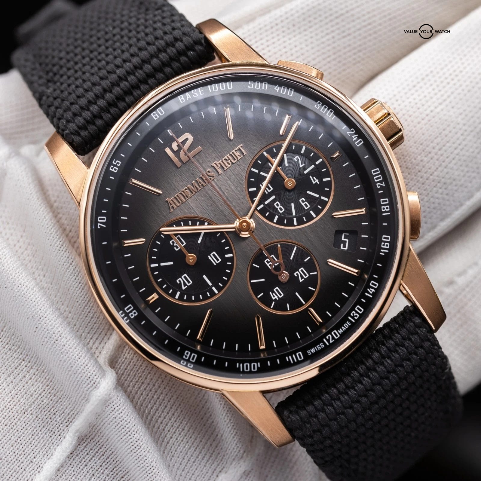 Audemars Piguet continues to redefine modern watchmaking with this exceptional Code 11.59 Chronograph 26393NR.OO.A002KB.01—a striking fusion of 18-carat rose gold, black ceramic, and a smoked grey vertically brushed dial that instantly commands attention. Five years after the Code 11.59 collection launched, AP continues to evolve its most contemporary line, and this reference stands at the forefront of that evolution. Its unique architectural case design, two-tone construction, and refined finishing deliver the perfect blend of sporty elegance and high-end craftsmanship. The color scheme offers undeniable wrist presence, making it an outstanding choice for collectors seeking something truly distinctive.