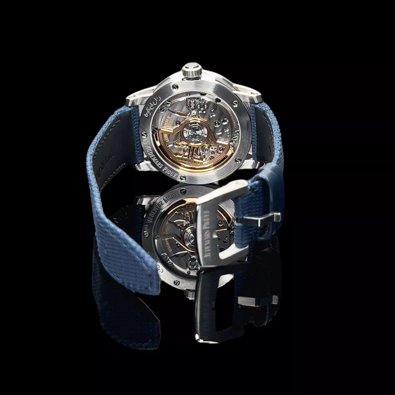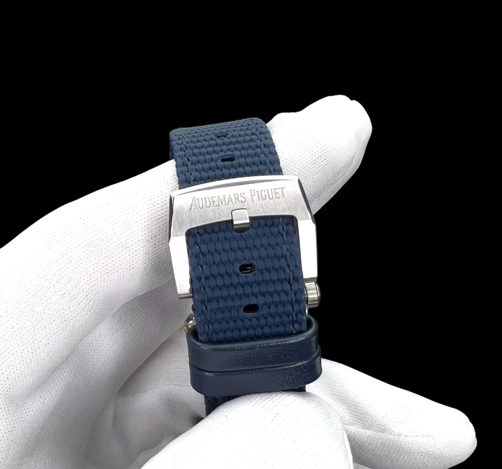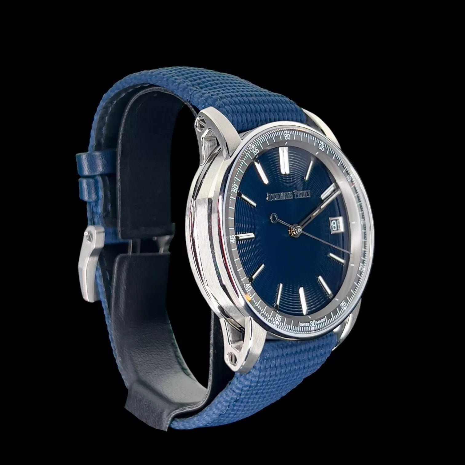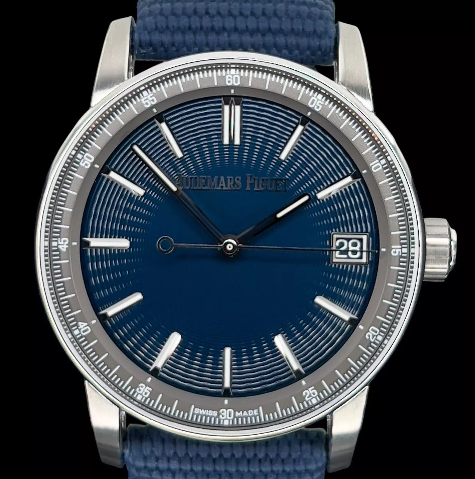 The Audemars Piguet Code 11.59 15210ST.OO.A348KB.01 is a luxurious timepiece that masterfully combines superb craftsmanship and design. It features a 41mm steel case paired with a matching blue bezel graduated up to a Base1000 scale that emanates elegance and sophistication. It showcases a unique blue “Bleu Nuit, Nuage 50” dial that houses luminous hour markers, hands, and has a date window between 4 and 5 o’clock for increased practicality. Look into the transparent case back that grants a glimpse into the intricate workings of this magnificent timepiece. This timepiece is completed with a canvas/nylon strap for a comfortable and stylish look that adds a touch of distinctive flair.