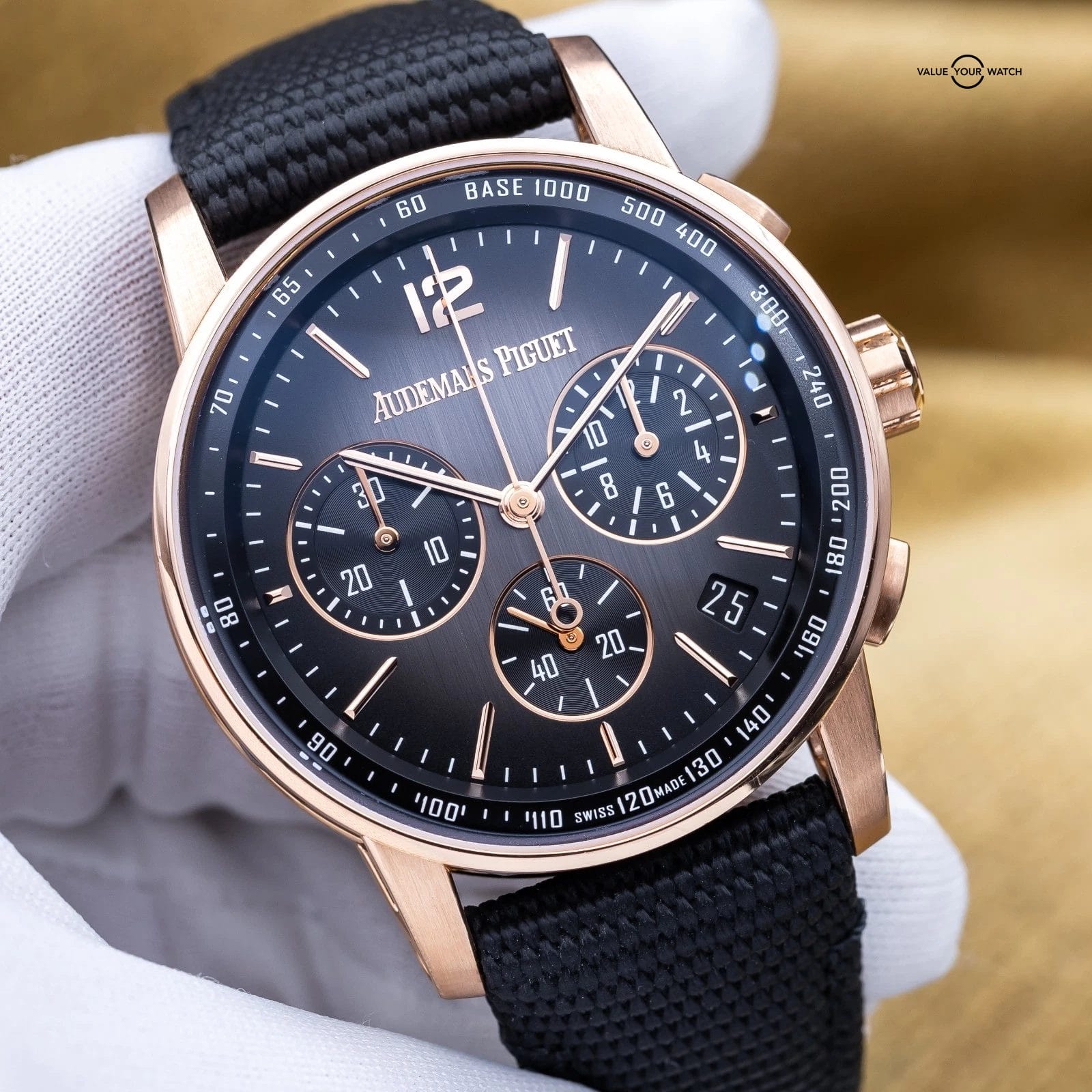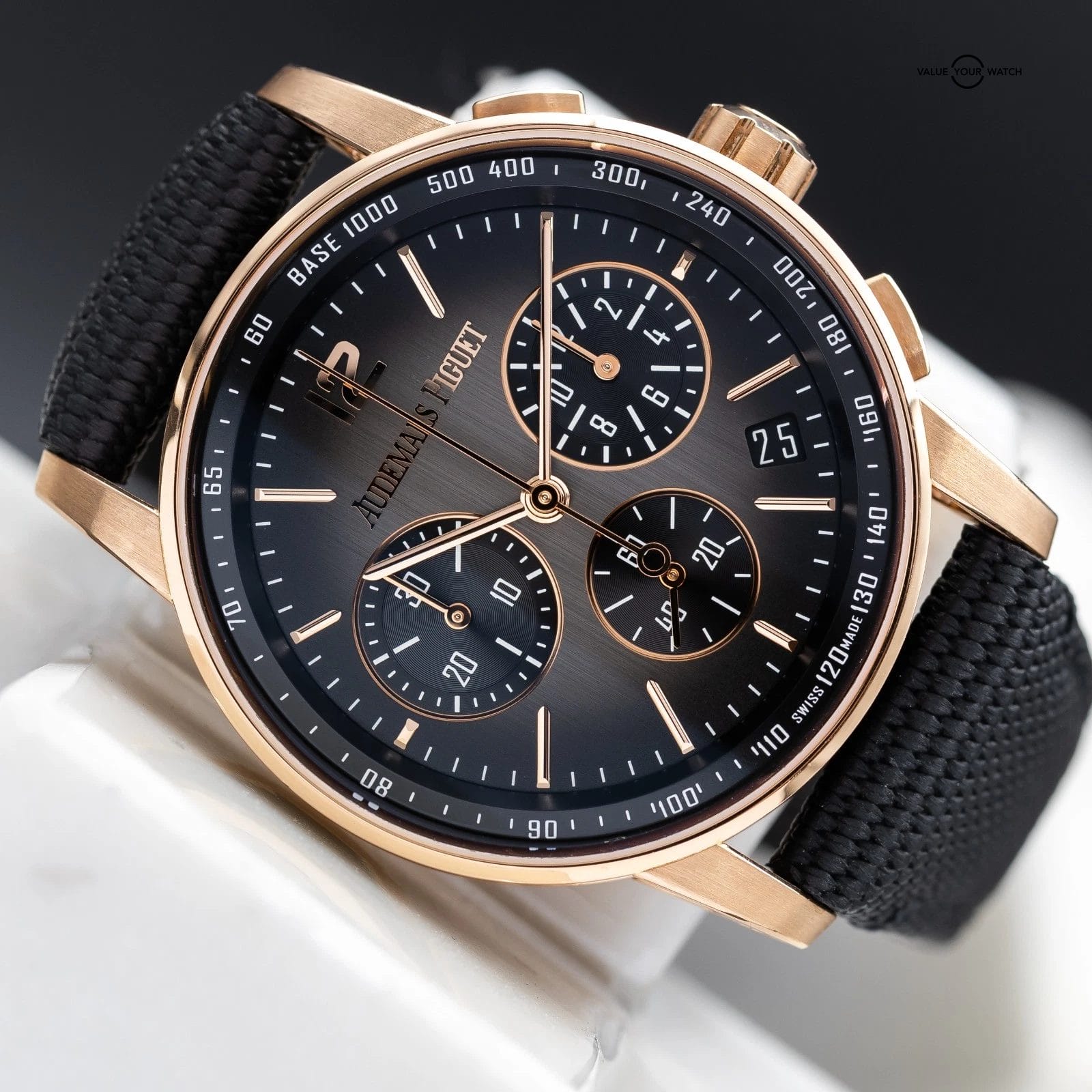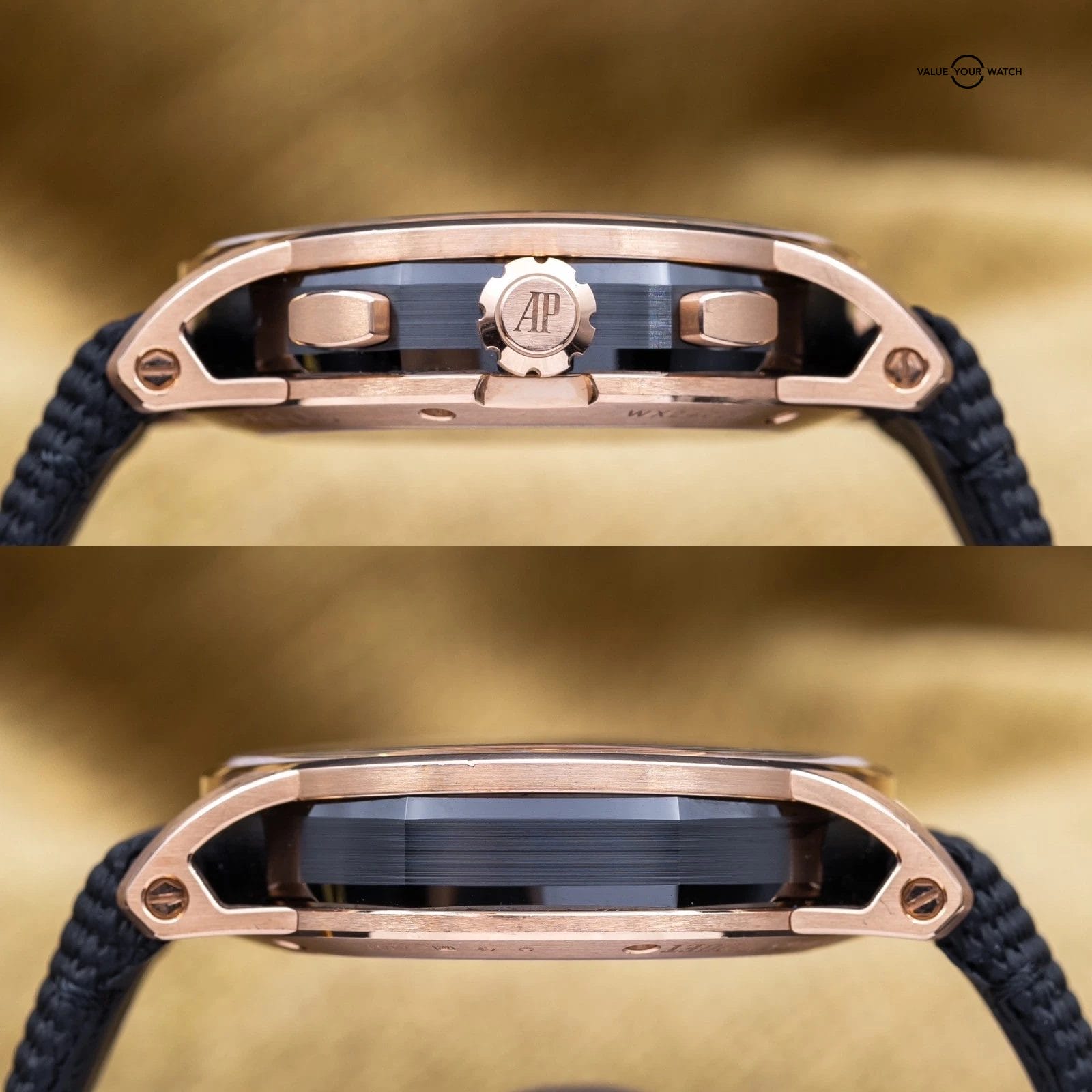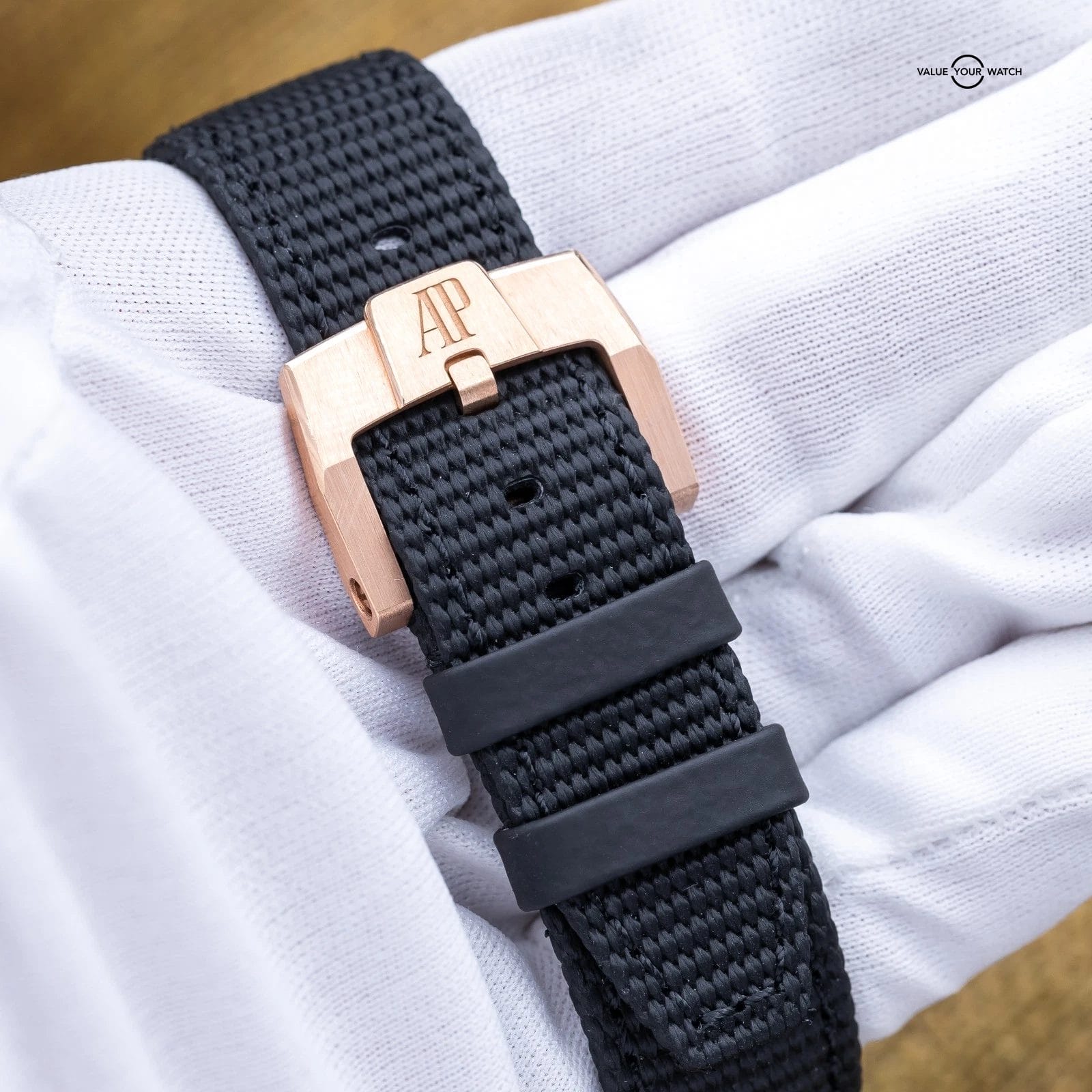Up for sale is this badass Rose Gold Code 11.59 chronograph. The rose gold ceramic sandwich case design with the concave crystal and innovative lugs are a marvel. The smoked grey dial with vertical satin brushing will keep you occupied for hours on end! The case houses the calibre 4401 Flyback Chronograph movement, a more complicated version of the standard chronograph that allows on-the-fly resetting while it’s running. You can see the intricacies of this complicated movement through the open case back. AP has hit a home run with the new Code 11.59’s. Don’t miss your chance to get this one below retail and without the boutique wait!