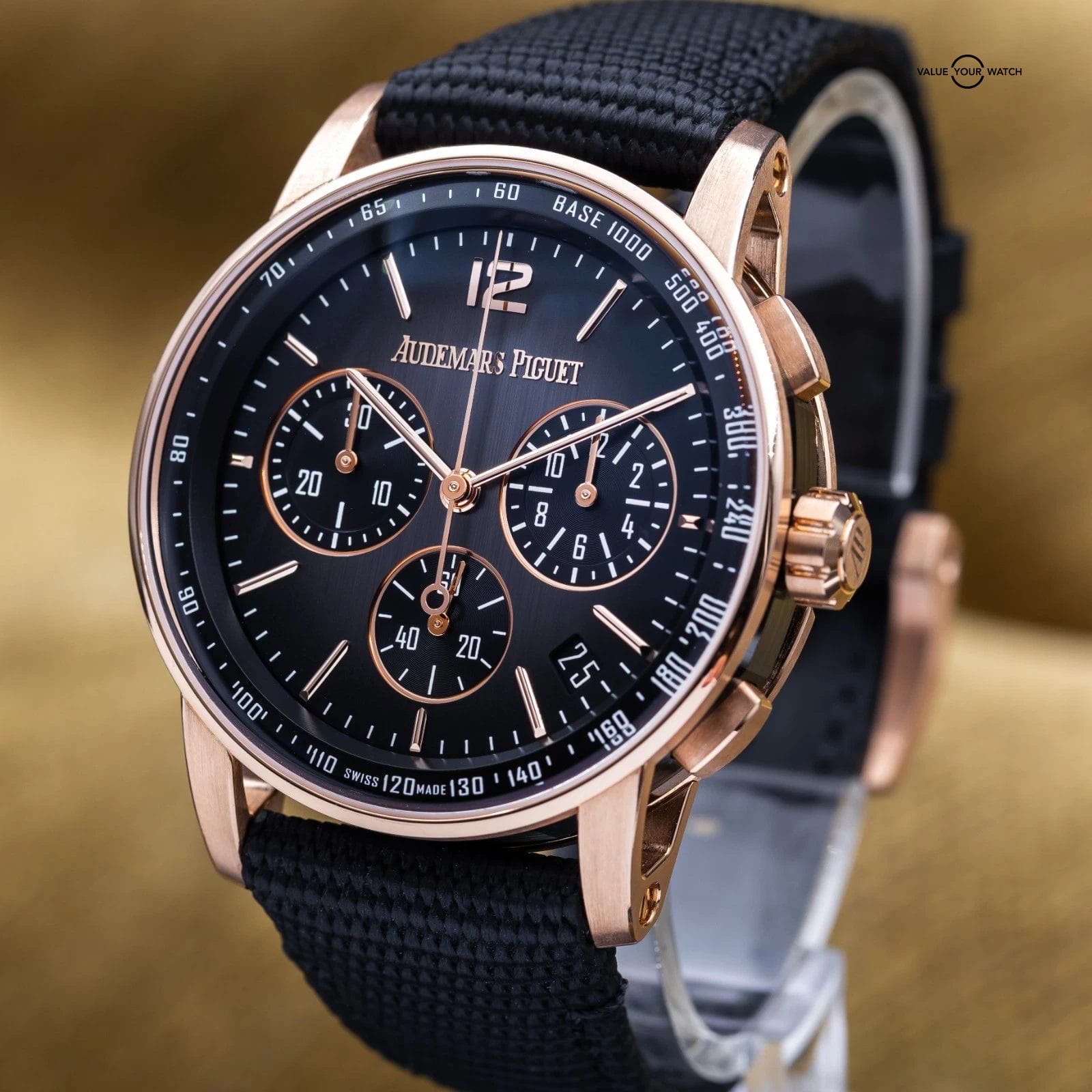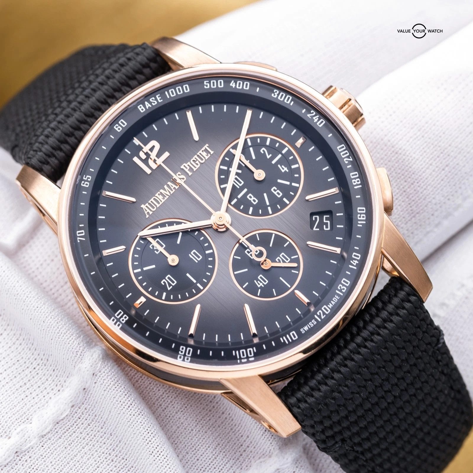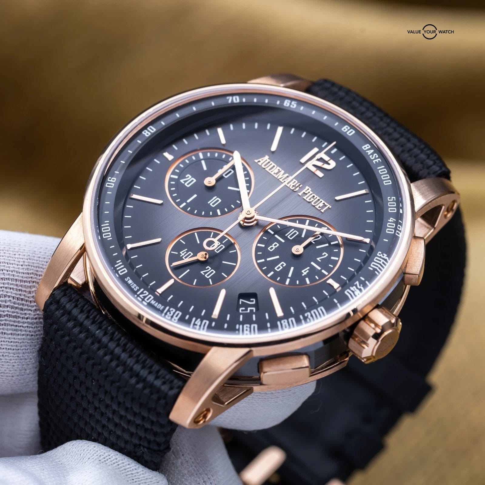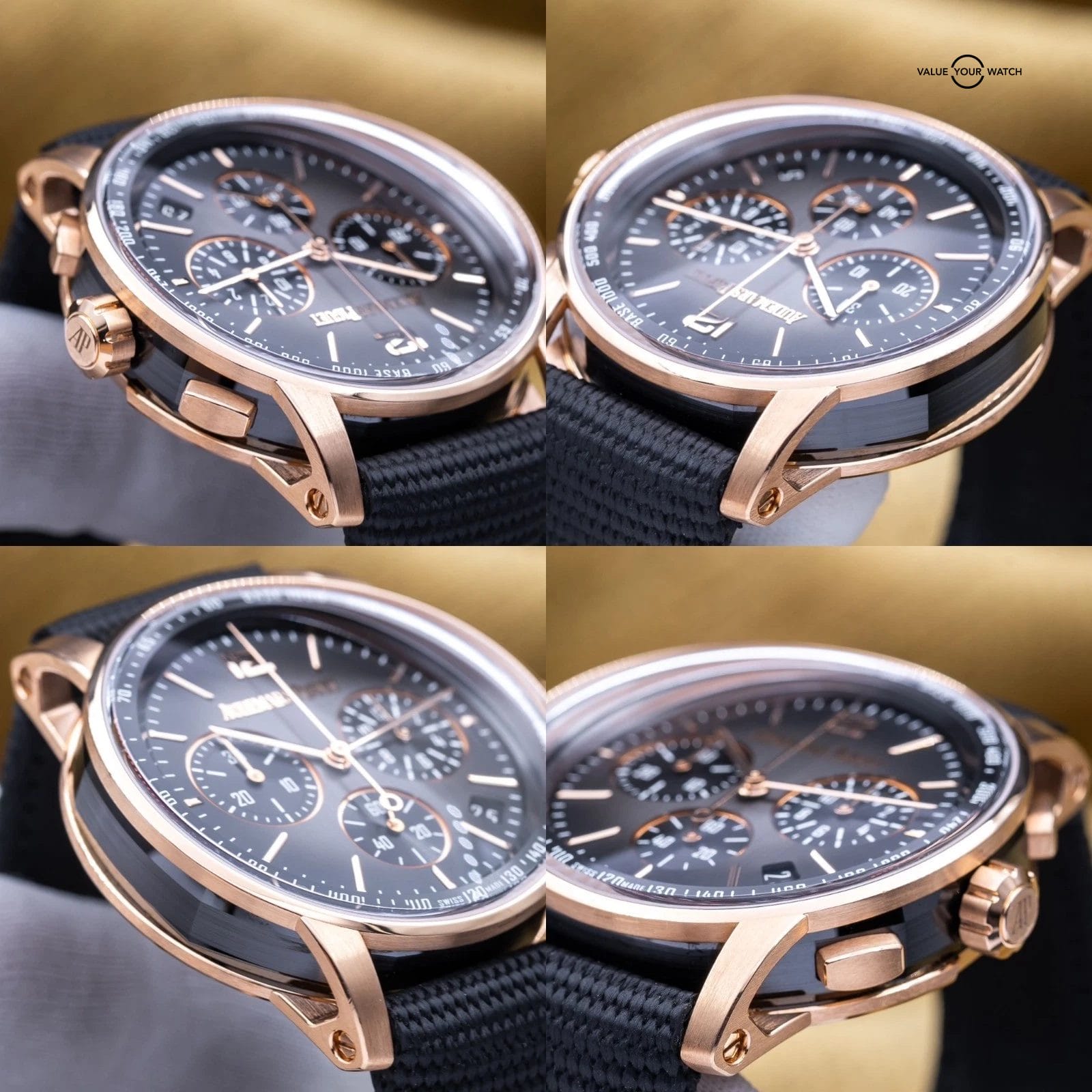 Up for sale is this badass Rose Gold Code 11.59 chronograph. The rose gold ceramic sandwich case design with the concave crystal and innovative lugs are a marvel. The smoked grey dial with vertical satin brushing will keep you occupied for hours on end! The case houses the calibre 4401 Flyback Chronograph movement, a more complicated version of the standard chronograph that allows on-the-fly resetting while it’s running. You can see the intricacies of this complicated movement through the open case back. AP has hit a home run with the new Code 11.59’s. Don’t miss your chance to get this one below retail and without the boutique wait!