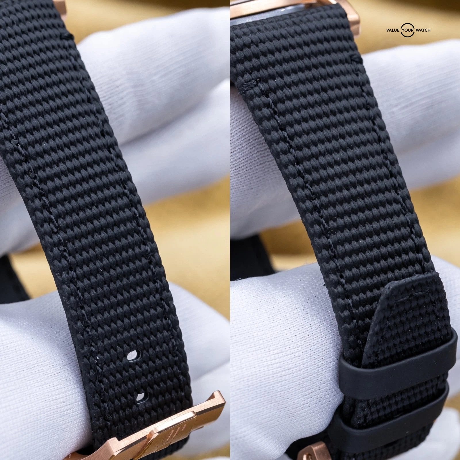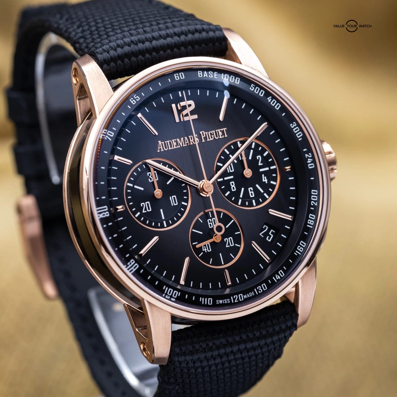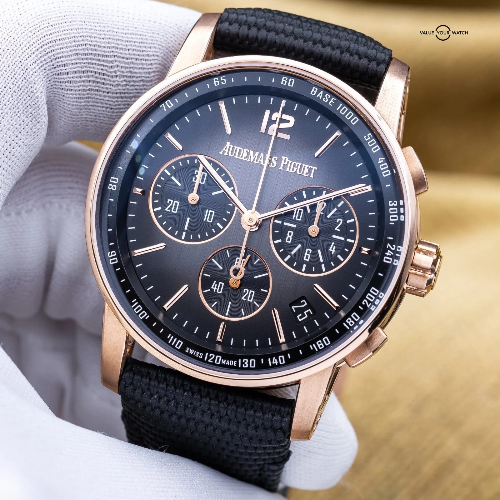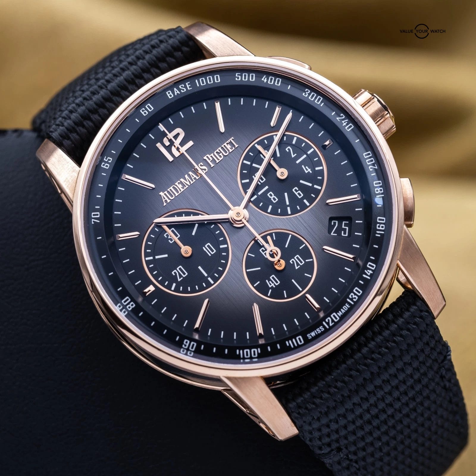 Up for sale is this badass Rose Gold Code 11.59 chronograph. The rose gold ceramic sandwich case design with the concave crystal and innovative lugs are a marvel. The smoked grey dial with vertical satin brushing will keep you occupied for hours on end! The case houses the calibre 4401 Flyback Chronograph movement, a more complicated version of the standard chronograph that allows on-the-fly resetting while it’s running. You can see the intricacies of this complicated movement through the open case back. AP has hit a home run with the new Code 11.59’s. Don’t miss your chance to get this one below retail and without the boutique wait!