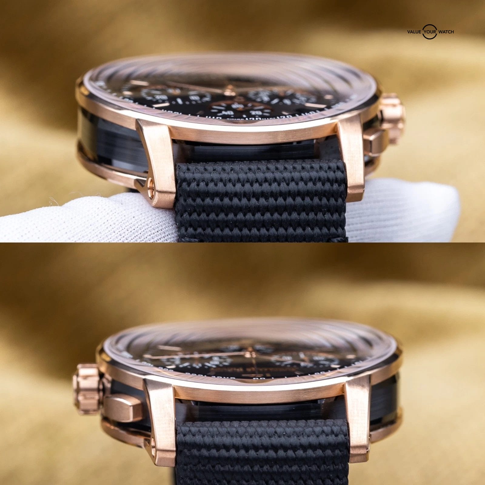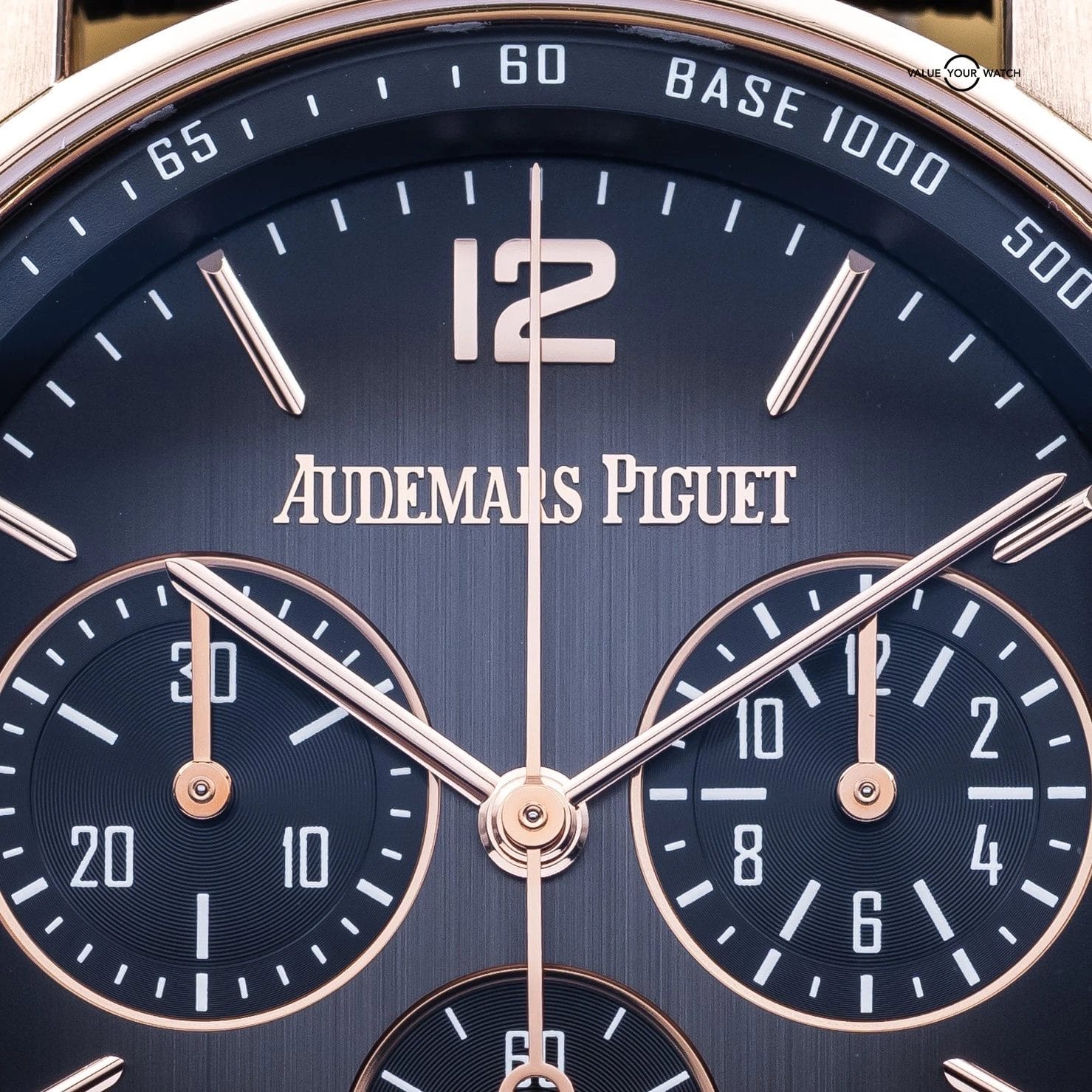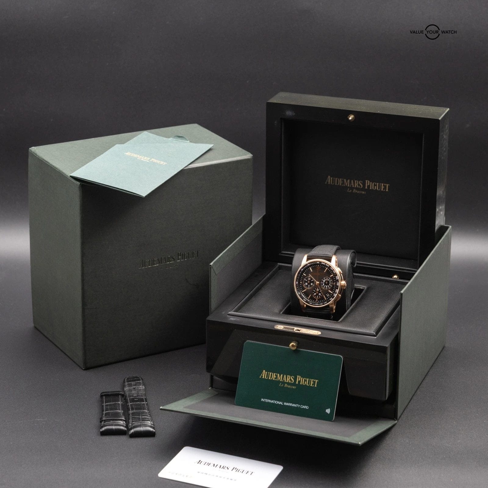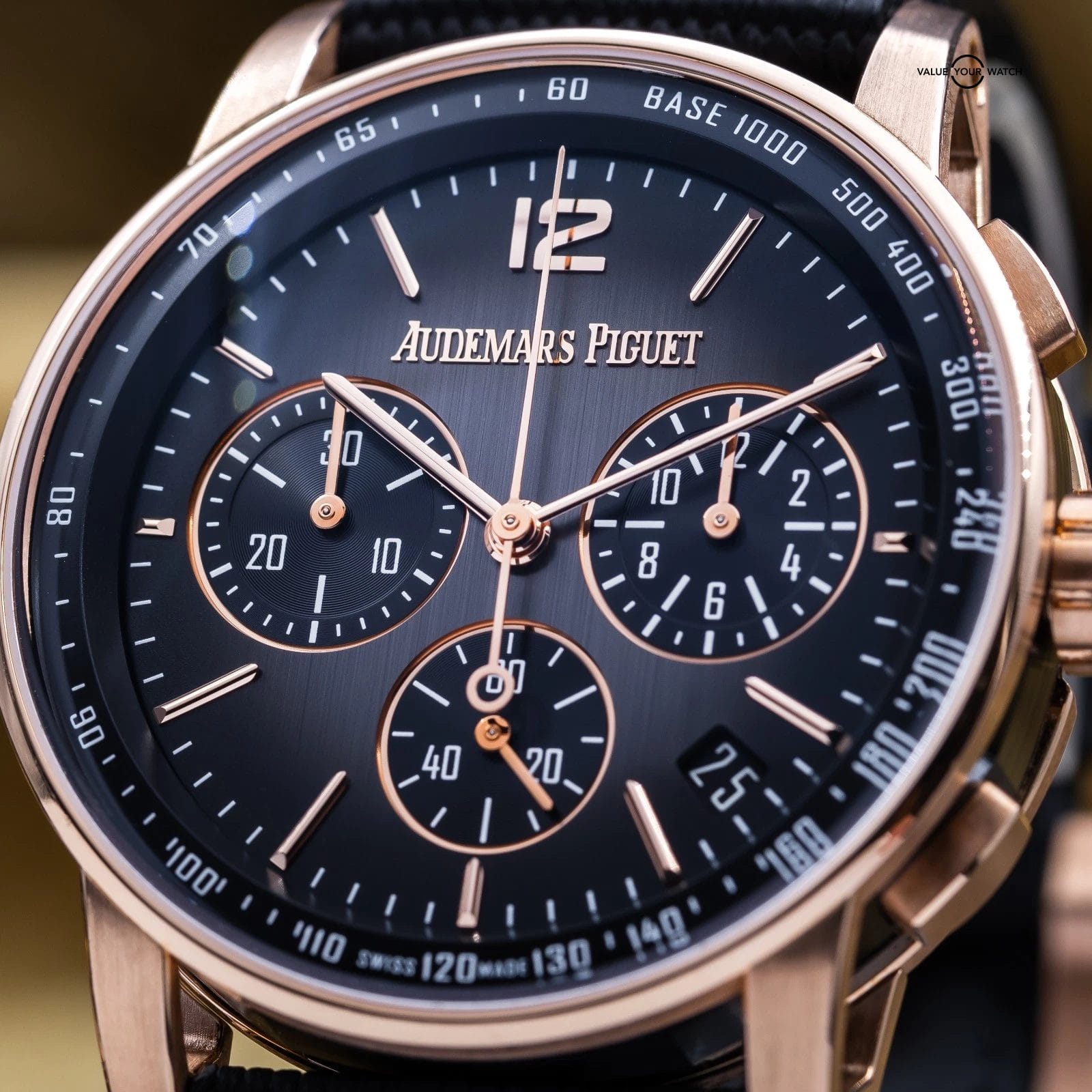 Up for sale is this badass Rose Gold Code 11.59 chronograph. The rose gold ceramic sandwich case design with the concave crystal and innovative lugs are a marvel. The smoked grey dial with vertical satin brushing will keep you occupied for hours on end! The case houses the calibre 4401 Flyback Chronograph movement, a more complicated version of the standard chronograph that allows on-the-fly resetting while it’s running. You can see the intricacies of this complicated movement through the open case back. AP has hit a home run with the new Code 11.59’s. Don’t miss your chance to get this one below retail and without the boutique wait!