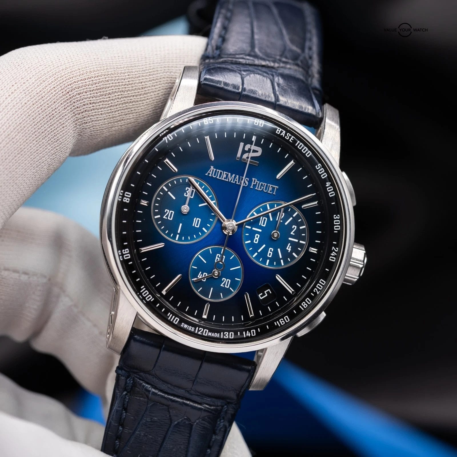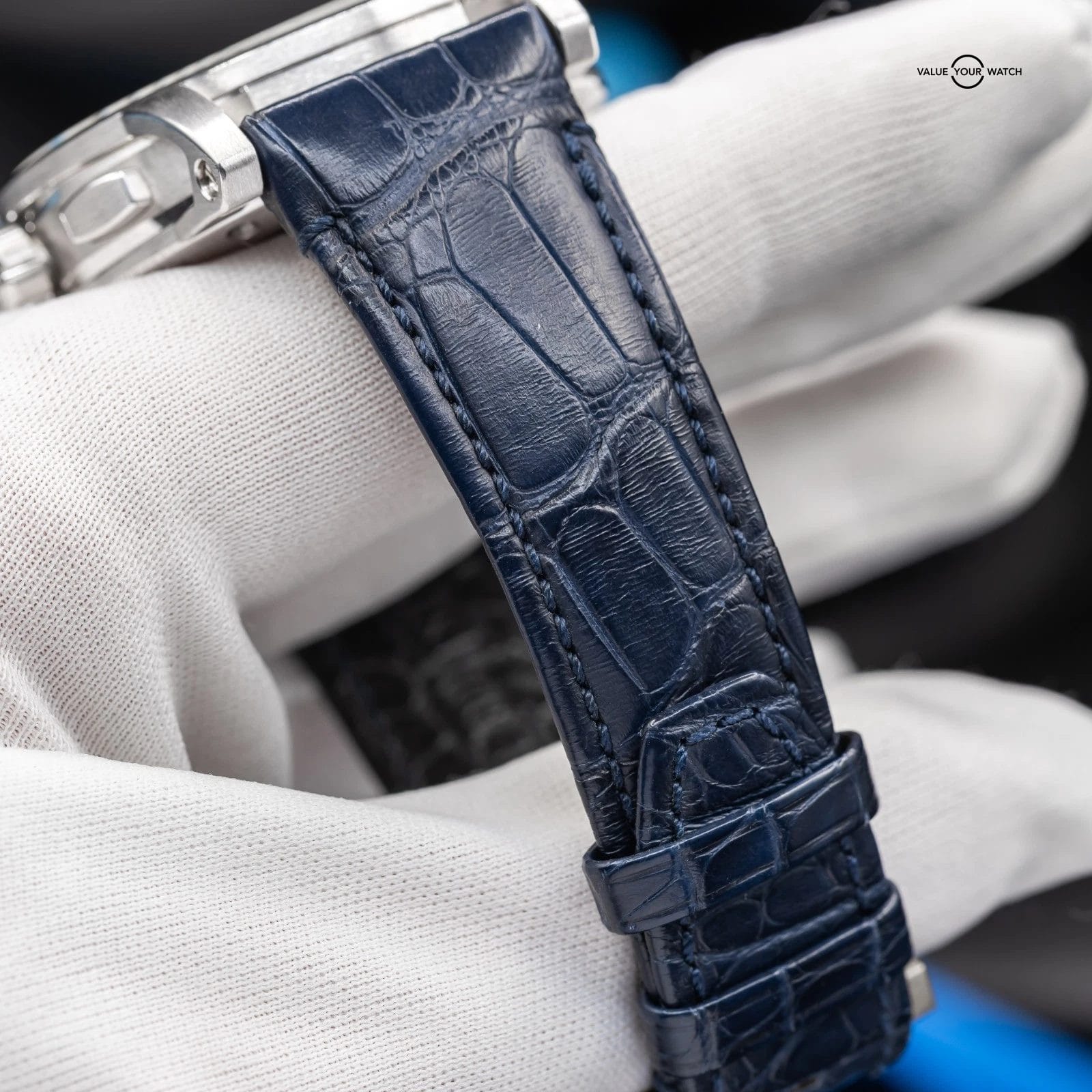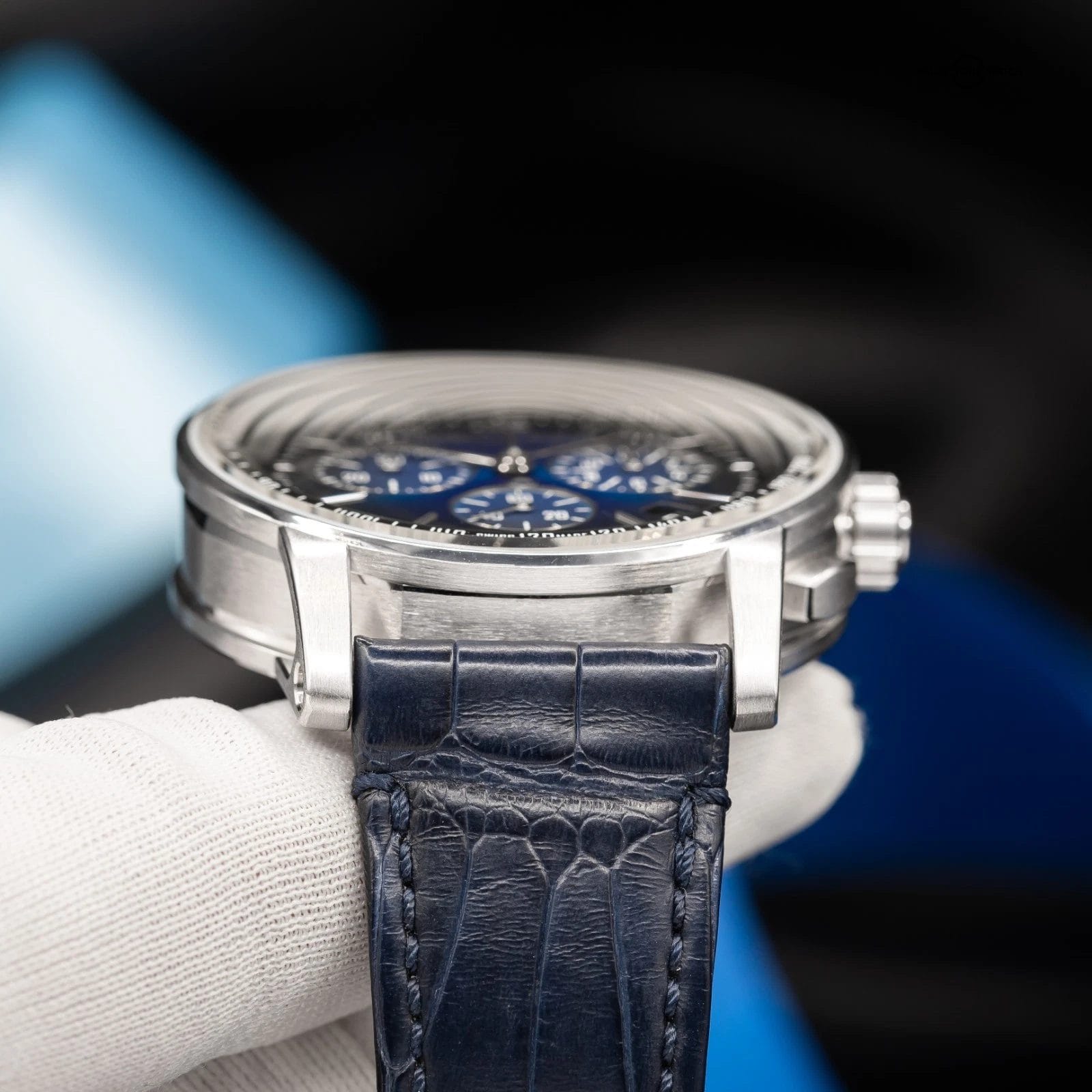 · Dial: Stunning smoked blue lacquered sunburst dial with applied white gold hour markers and chronograph sub-dials