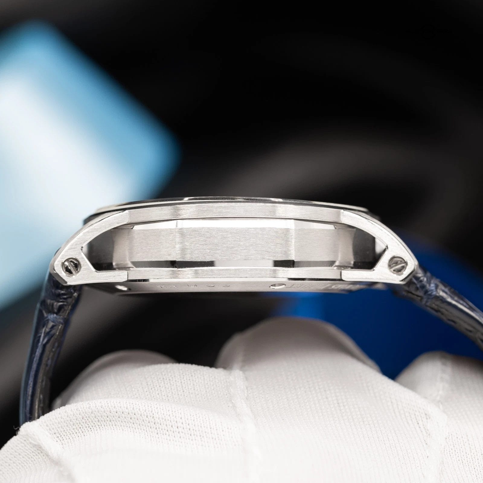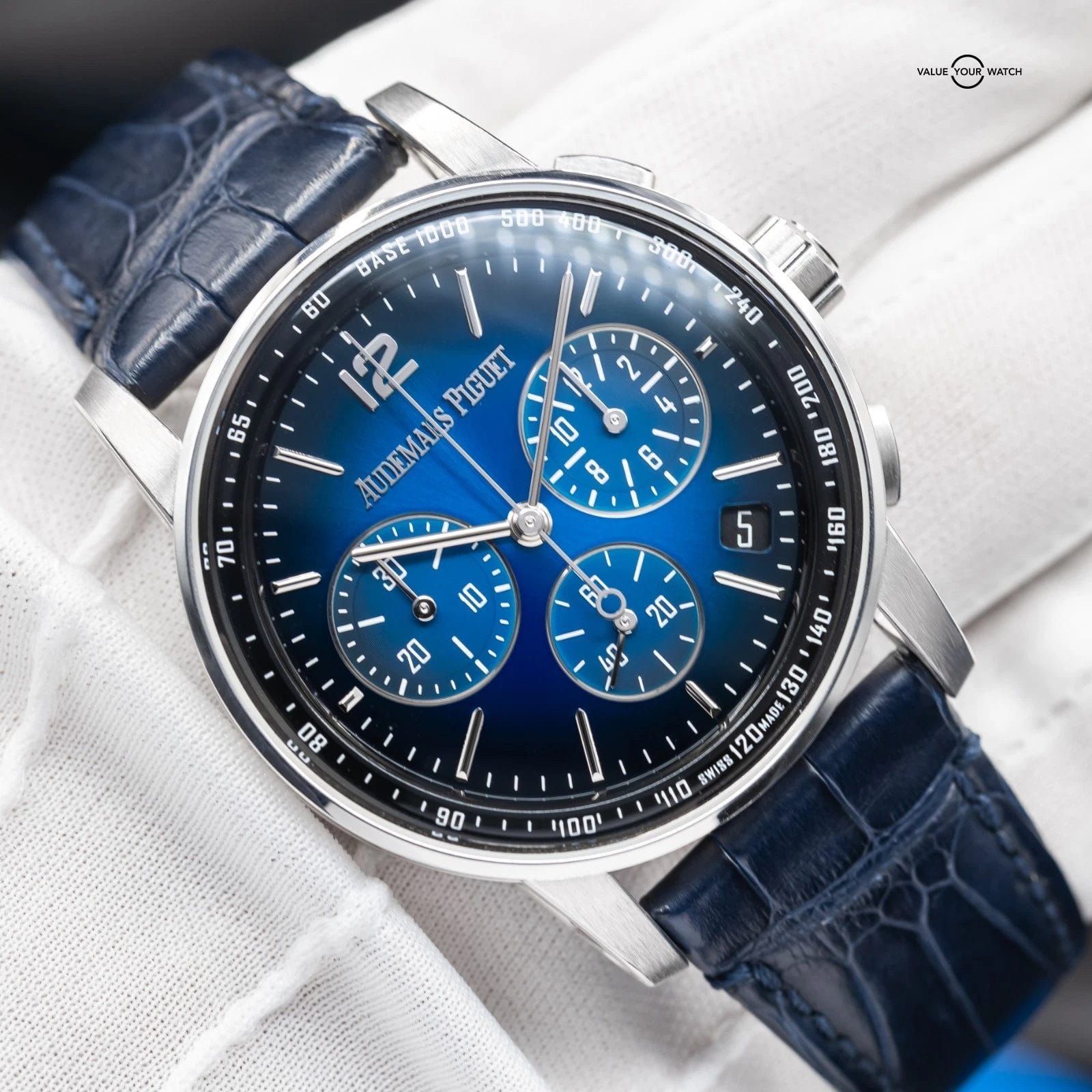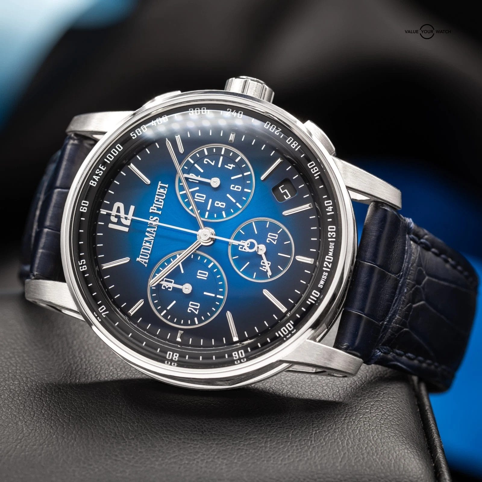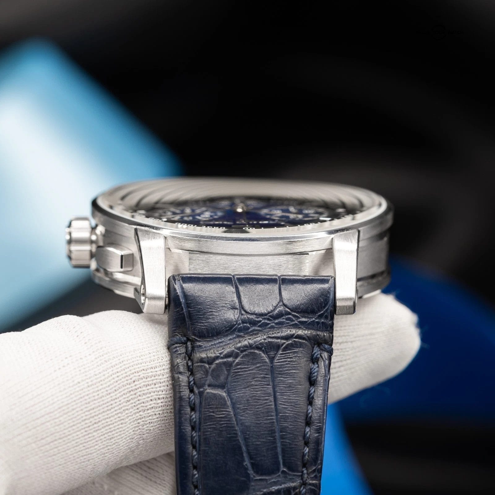 · Dial: Stunning smoked blue lacquered sunburst dial with applied white gold hour markers and chronograph sub-dials