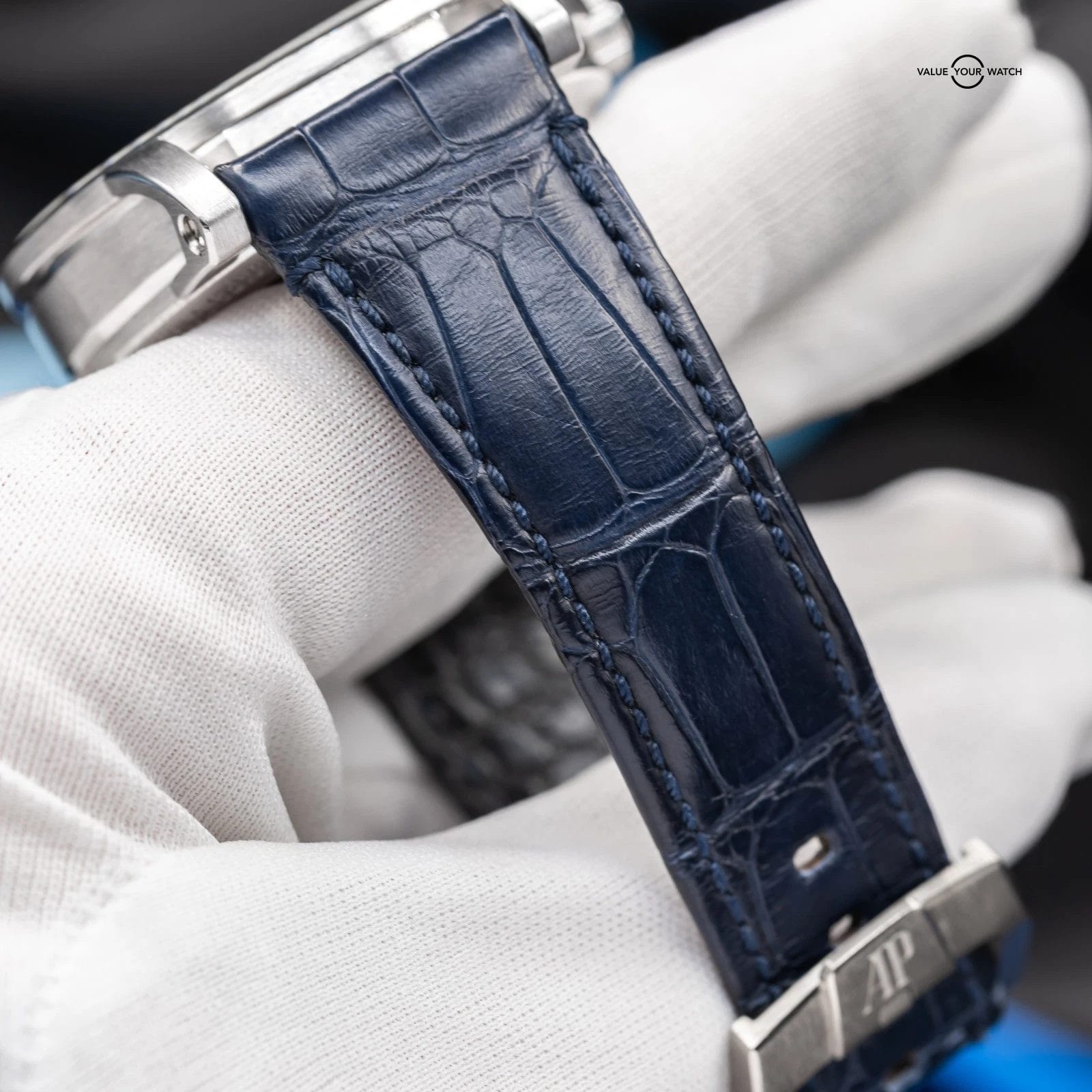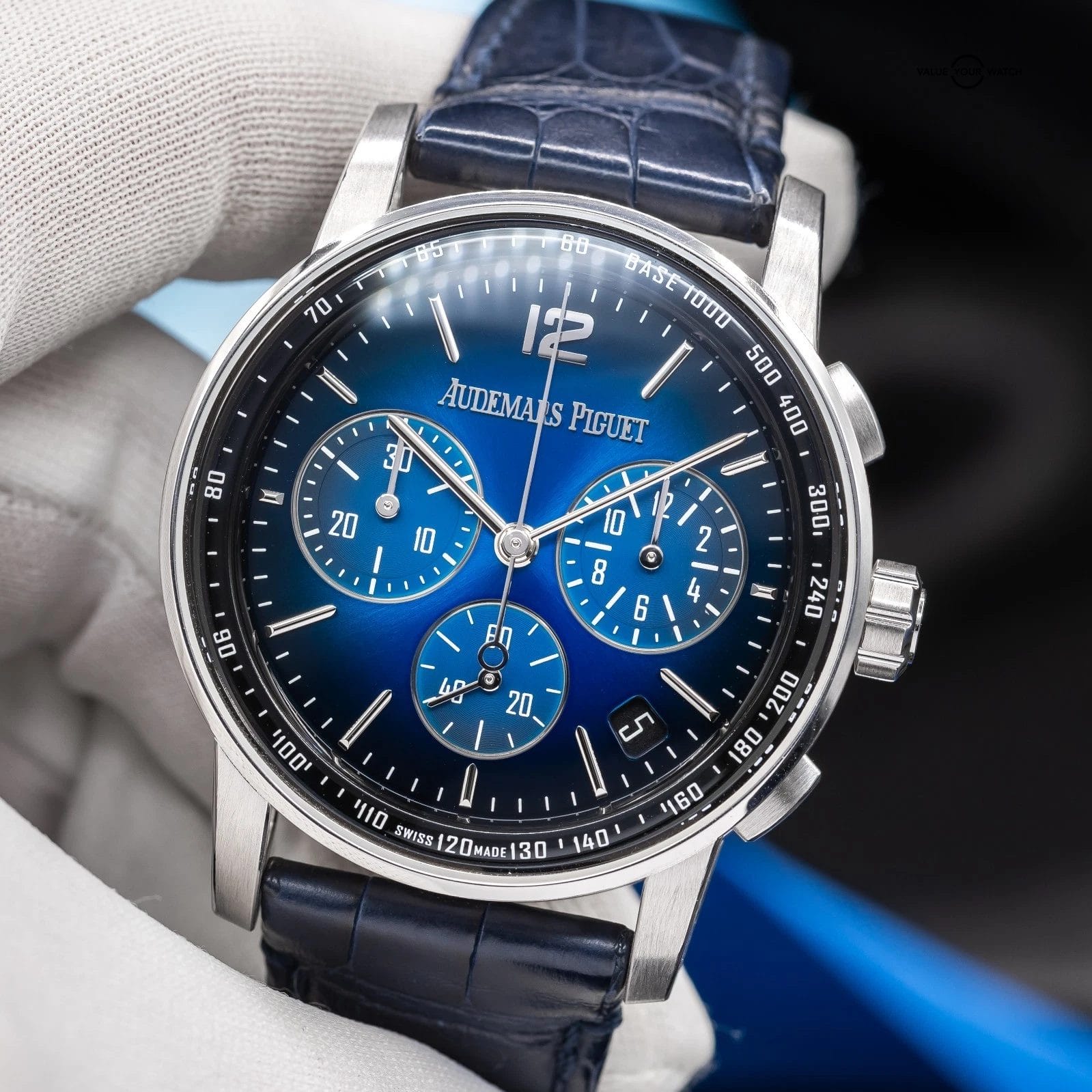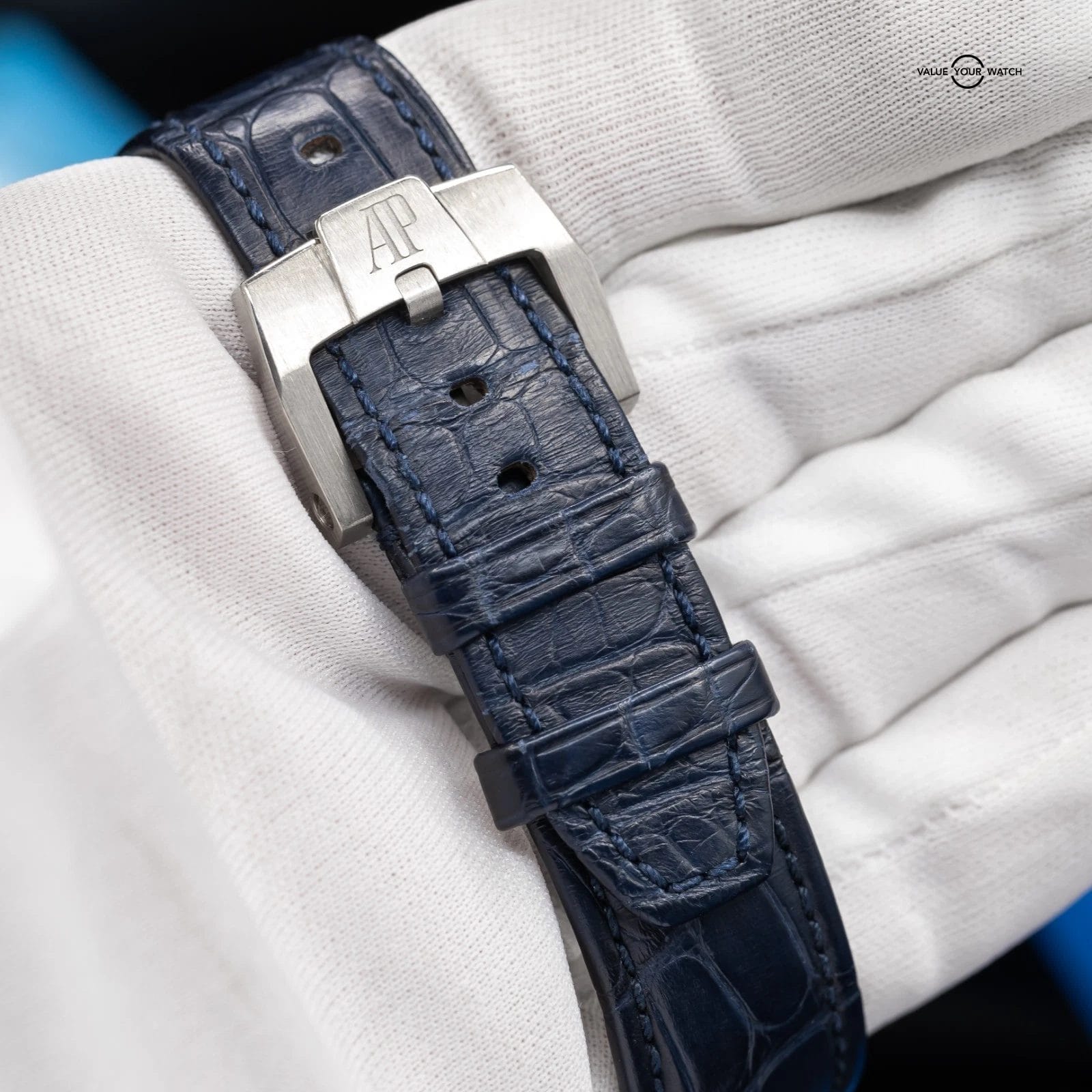 This Audemars Piguet Code 11.59 Chronograph 26393BC is a statement of refined strength and modern elegance. Crafted in 18K white gold, its sleek, sculpted case showcases the bold lines and architectural precision that set this collection apart. The smoked blue lacquered dial offers extraordinary depth and a mesmerizing gradient that shifts with the light—commanding attention without saying a word. Paired with a navy-blue crocodile strap, this piece is incredibly versatile, effortlessly transitioning from an elevated dress look to a sharp, casual statement. It’s a timepiece like no other, merging AP’s technical excellence with unmistakable style.