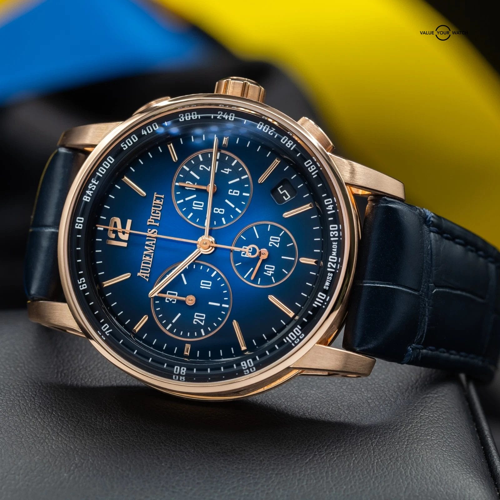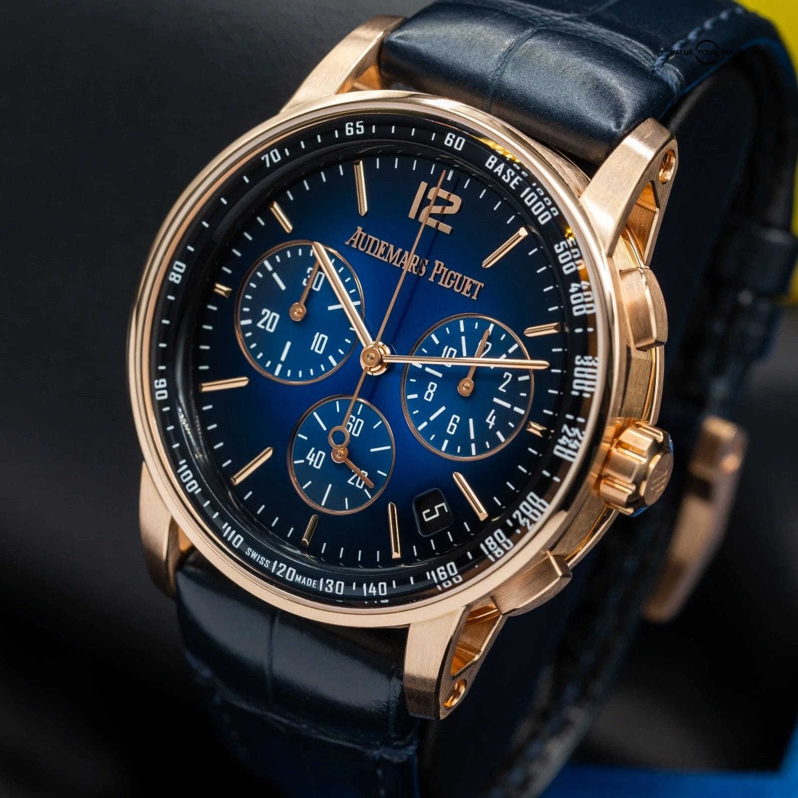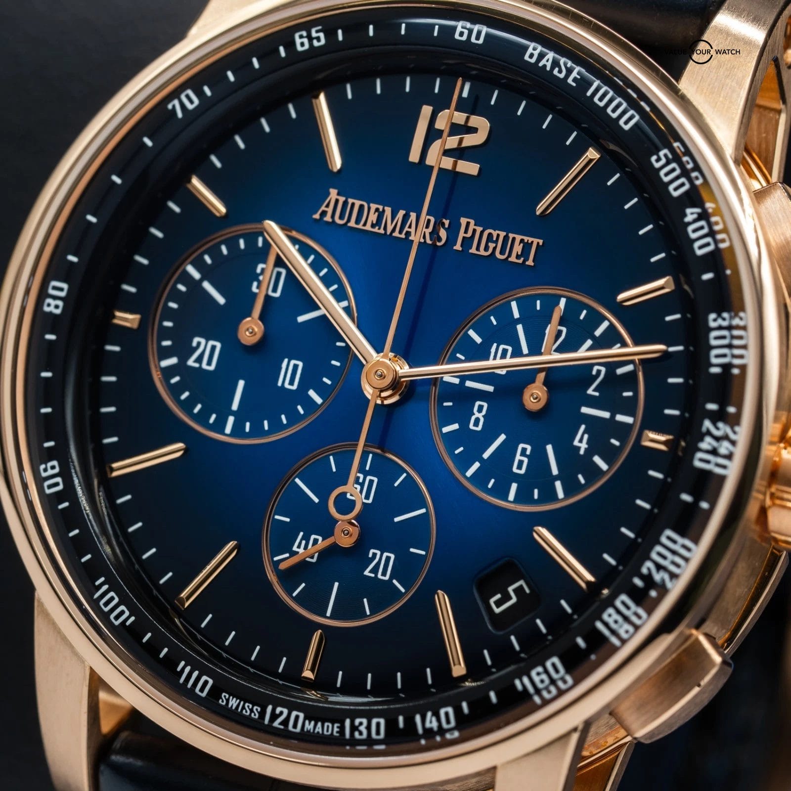· Dial: Gradient blue lacquered dial with applied rose gold markers and chronograph sub-dials