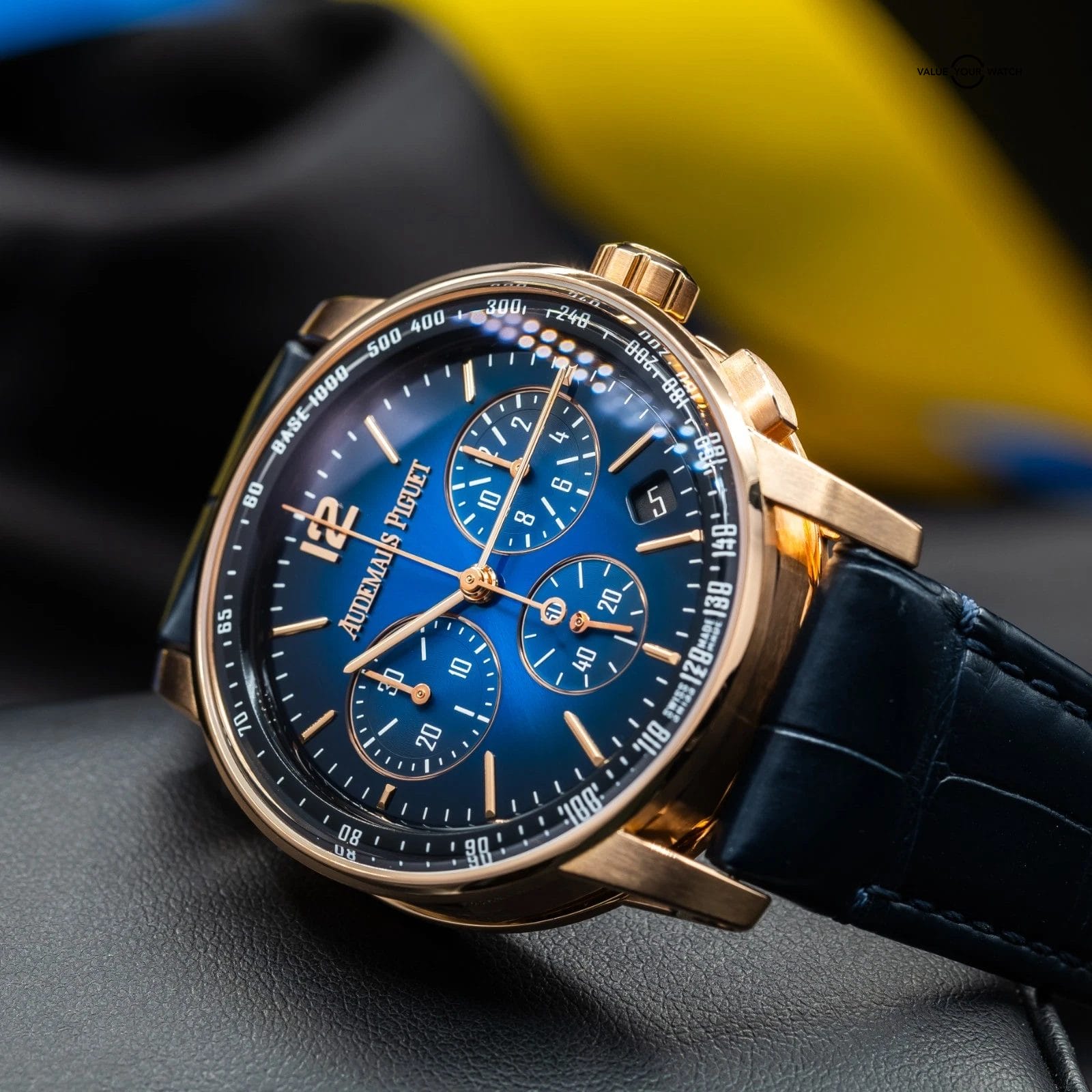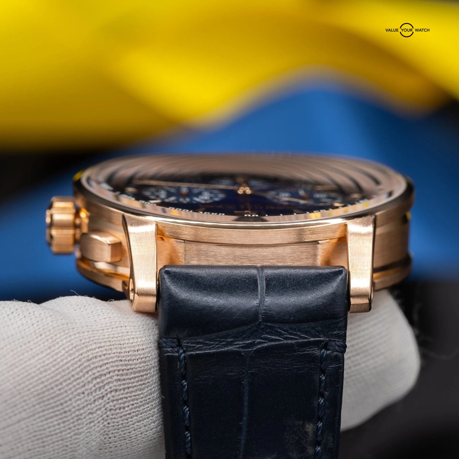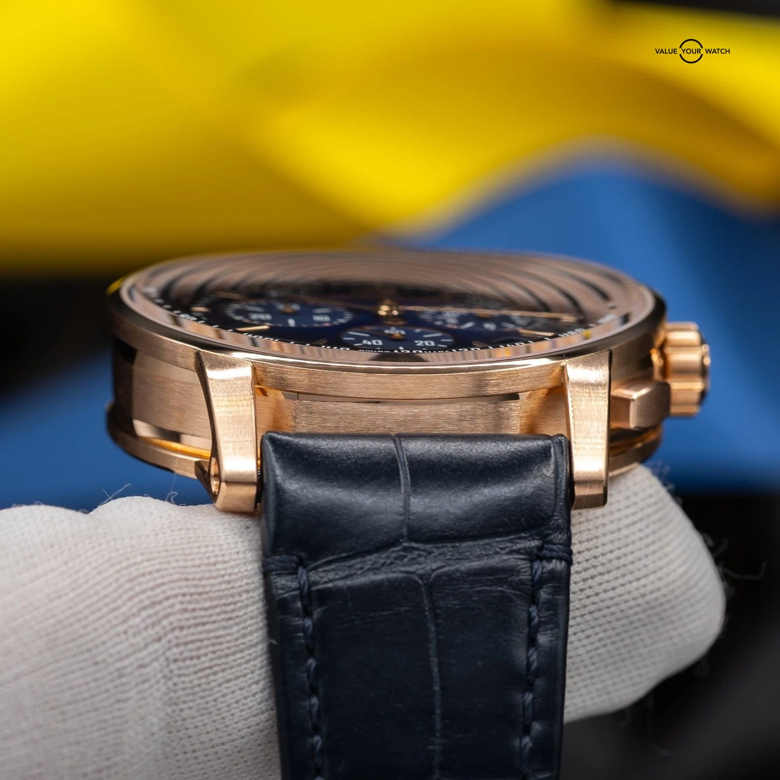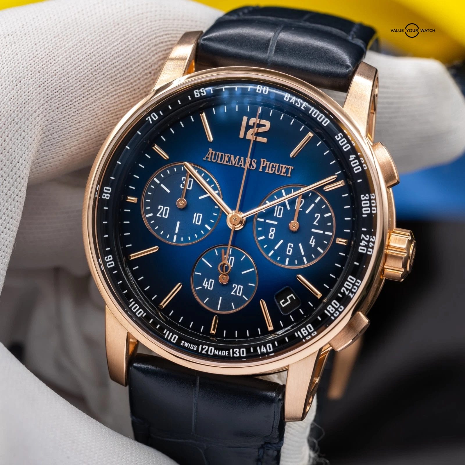 · Dial: Gradient blue lacquered dial with applied rose gold markers and chronograph sub-dials