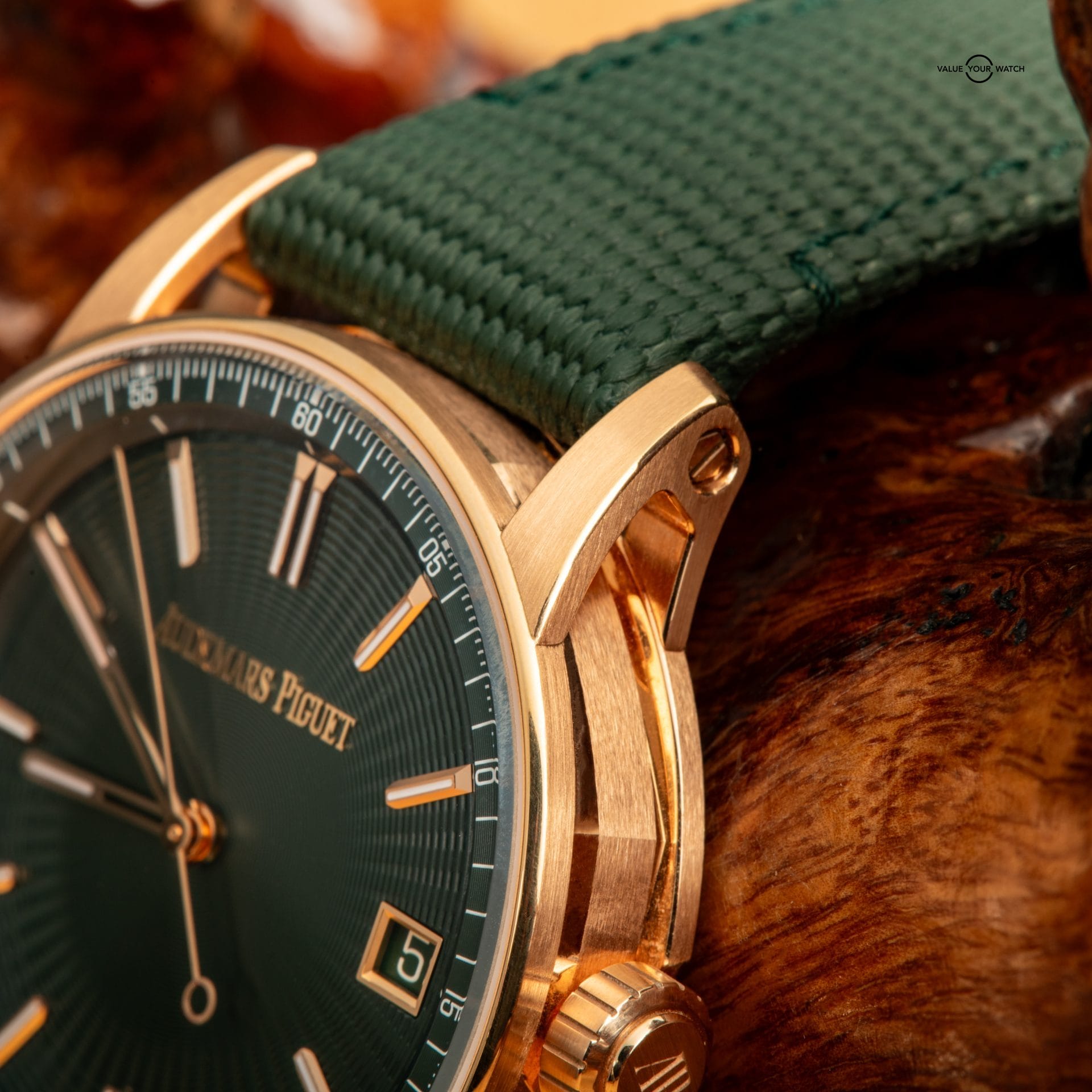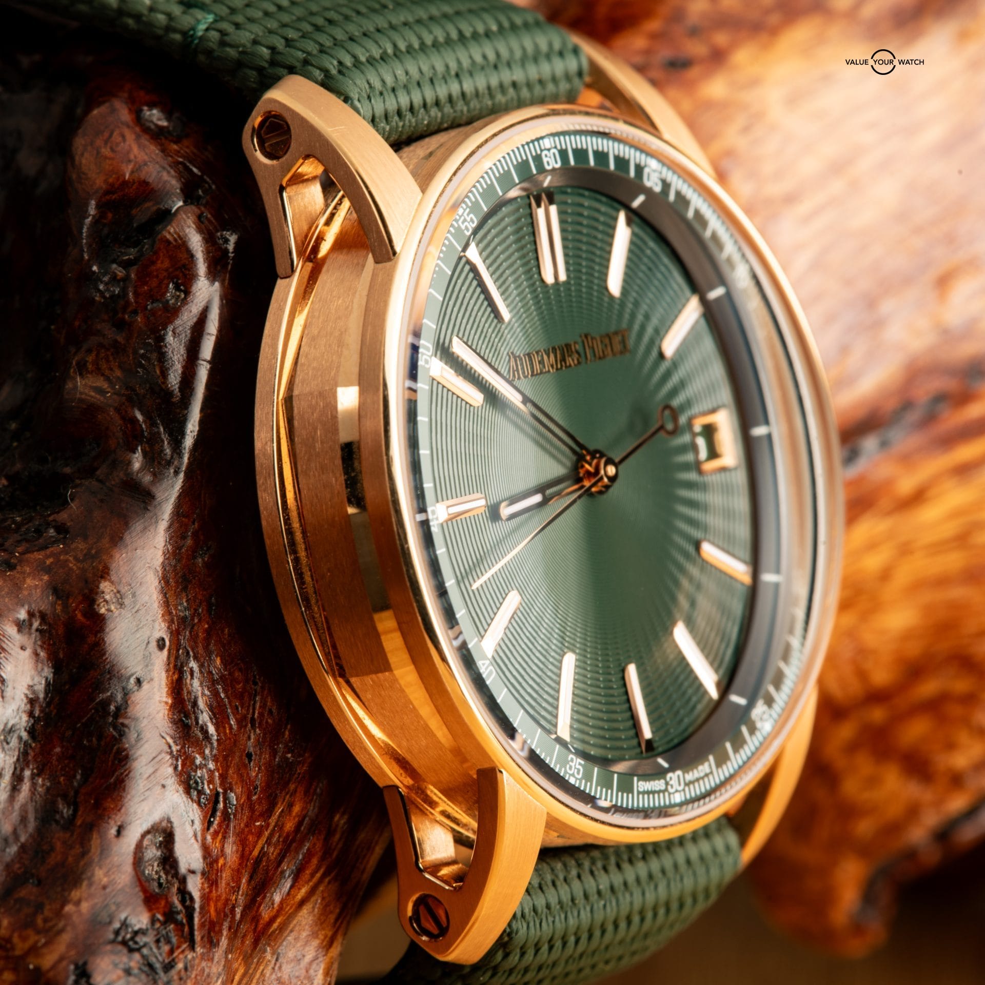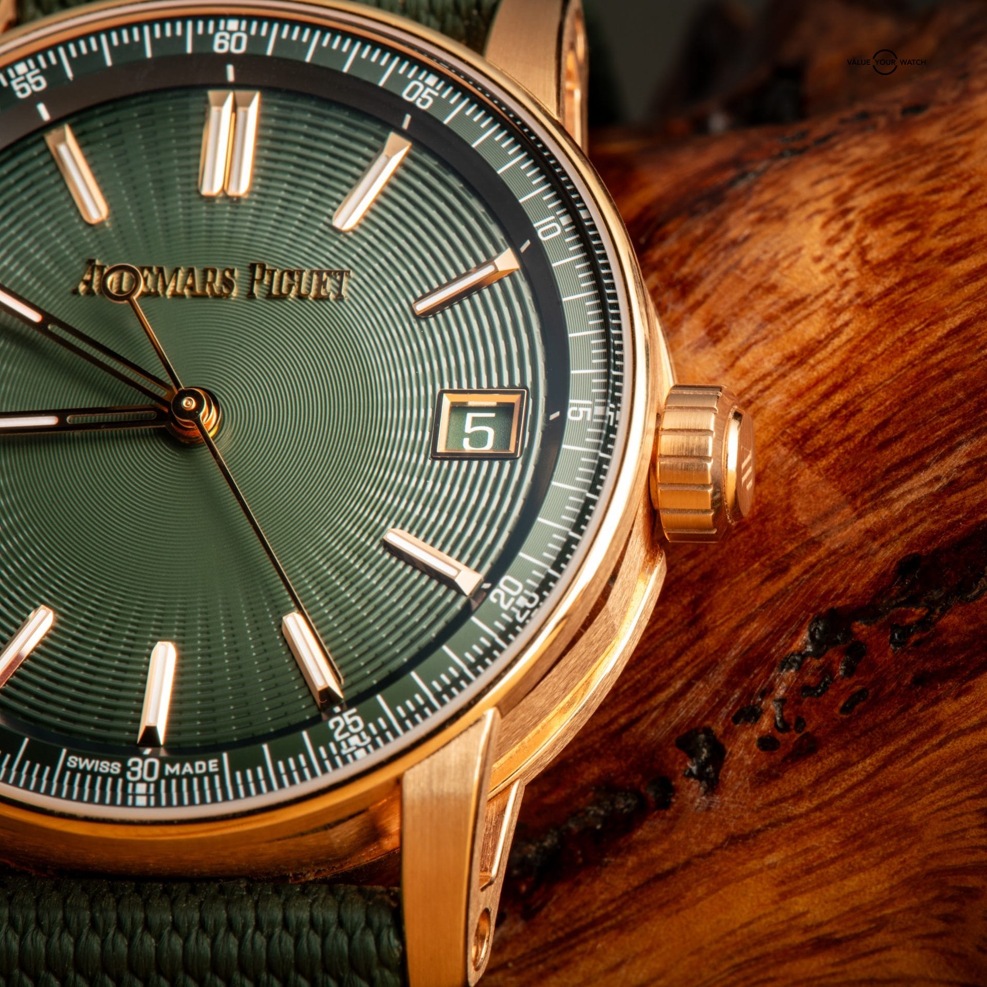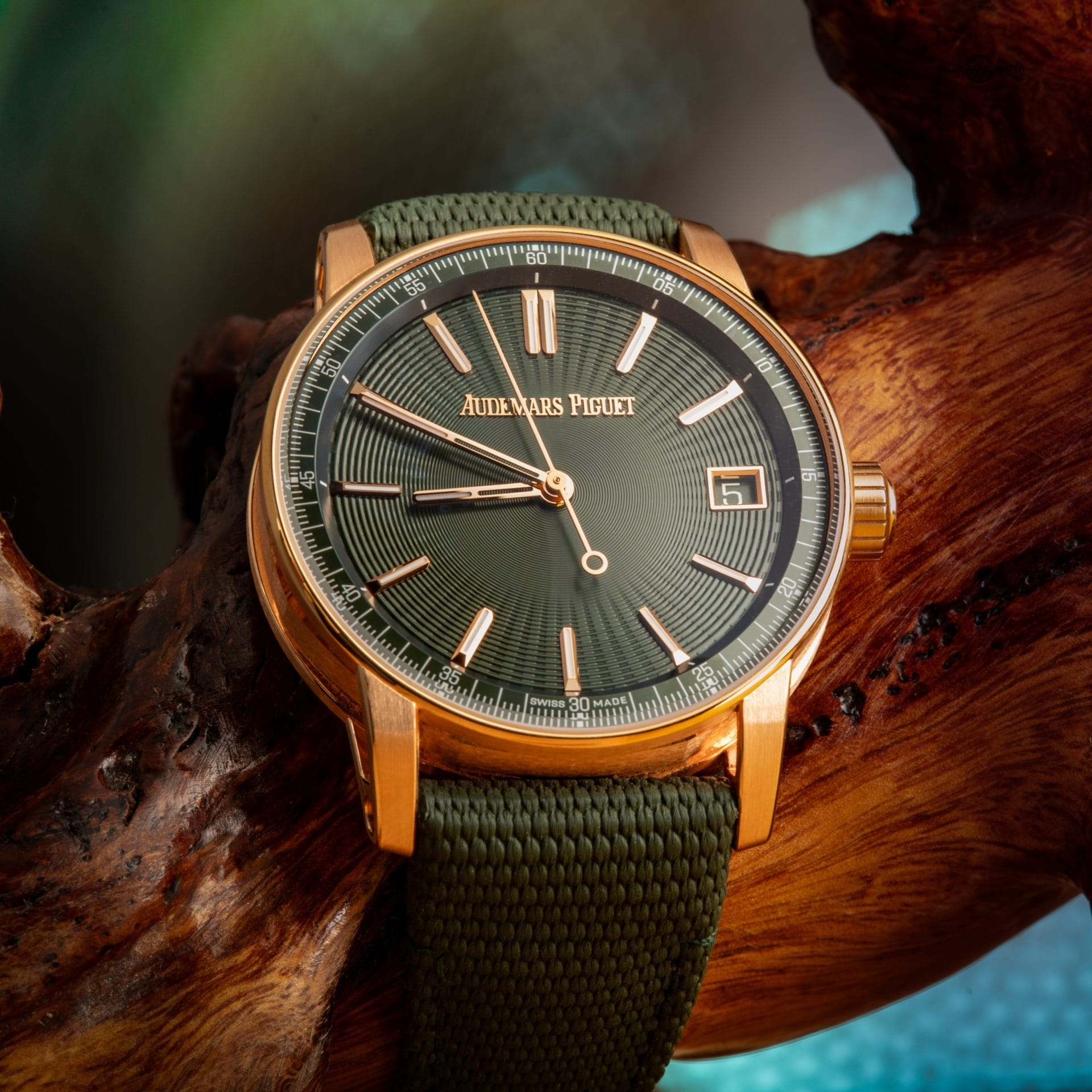 The AP Code 11.59 Selfwinding is a modern and elegant timepiece from AP’s contemporary collection. It features a 41mm pink (rose) gold case with a double-curved glareproof sapphire crystal that gives the dial extra depth. This watch has a green lacquered dial, paired with a matching green rubber-coated strap and an 18-carat pink gold pin buckle for a comfortable fit.