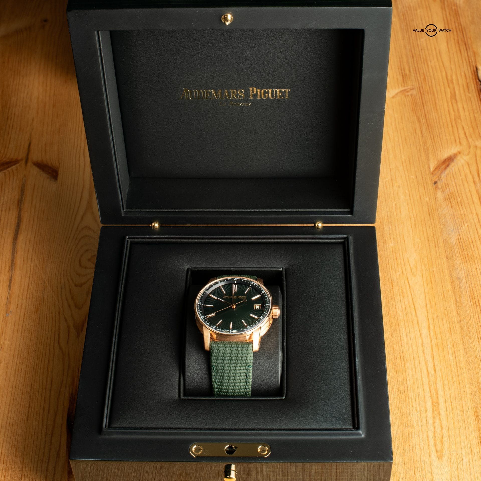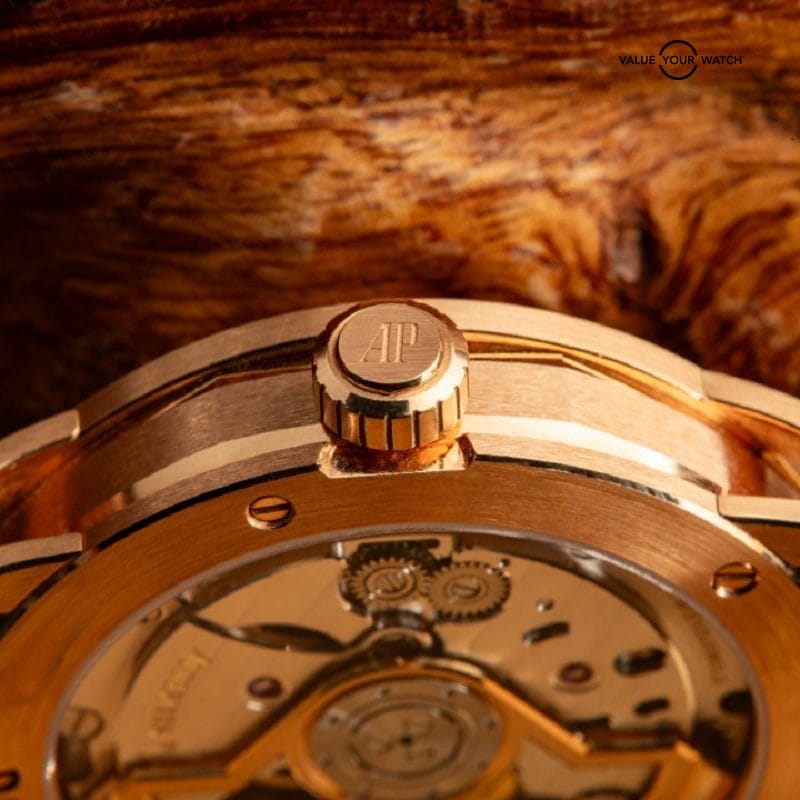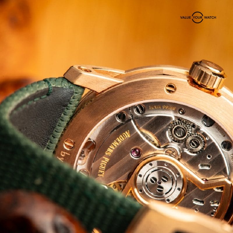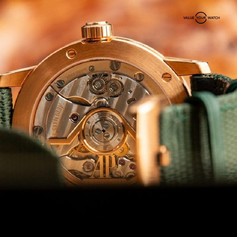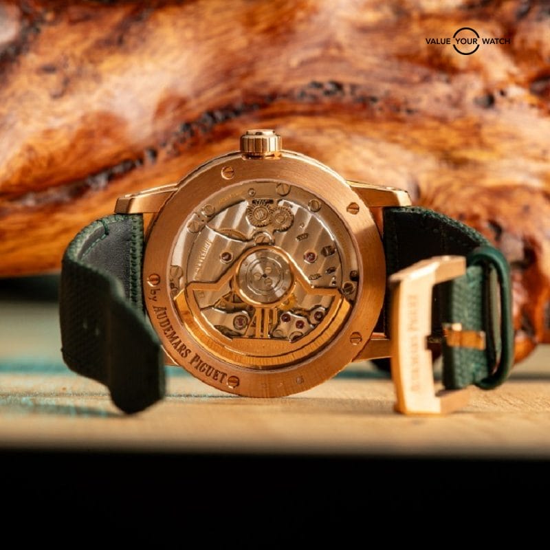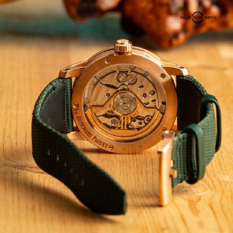 Inside, the watch runs on AP’s Cal. 4302 automatic movement with 32 jewels, offering a 70-hour power reserve and smooth timekeeping. It includes a date window at 3 o’clock and an exhibition sapphire caseback showcasing the refined finishing of the movement.