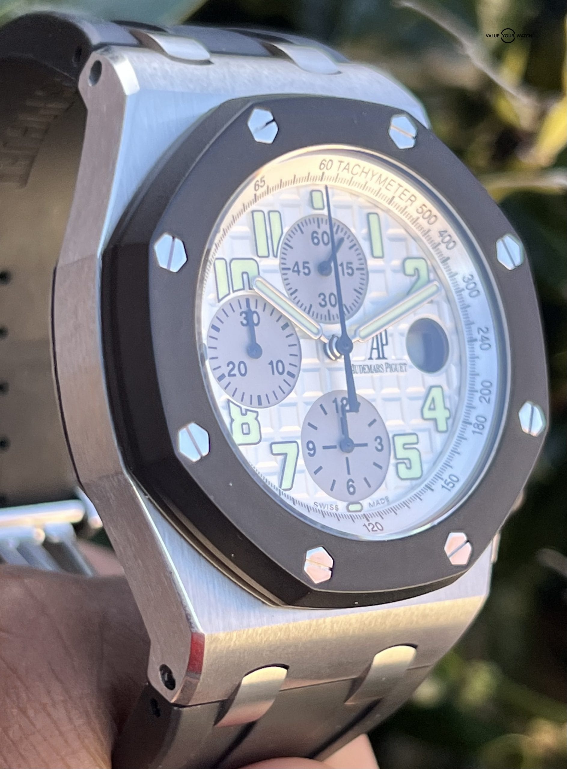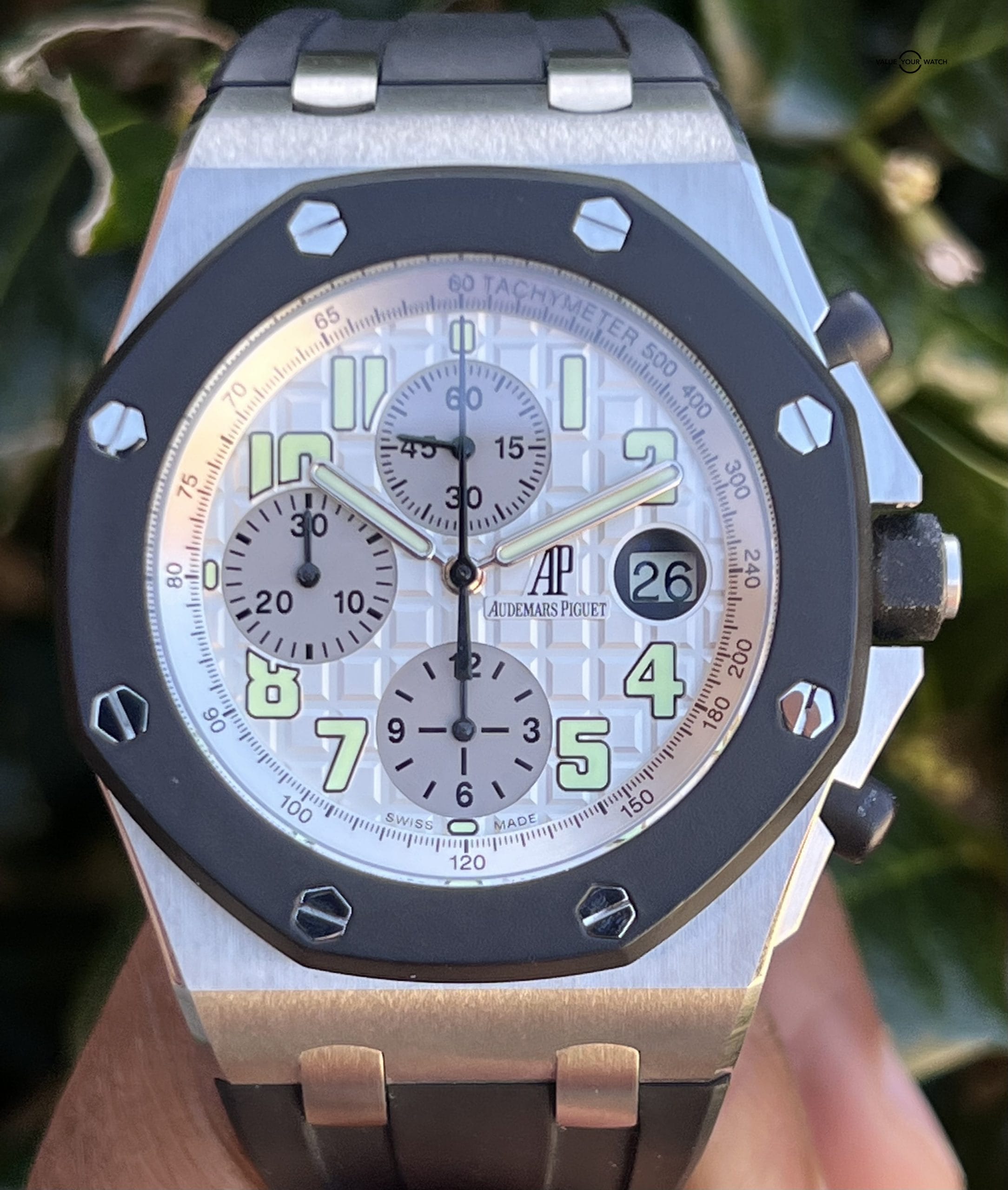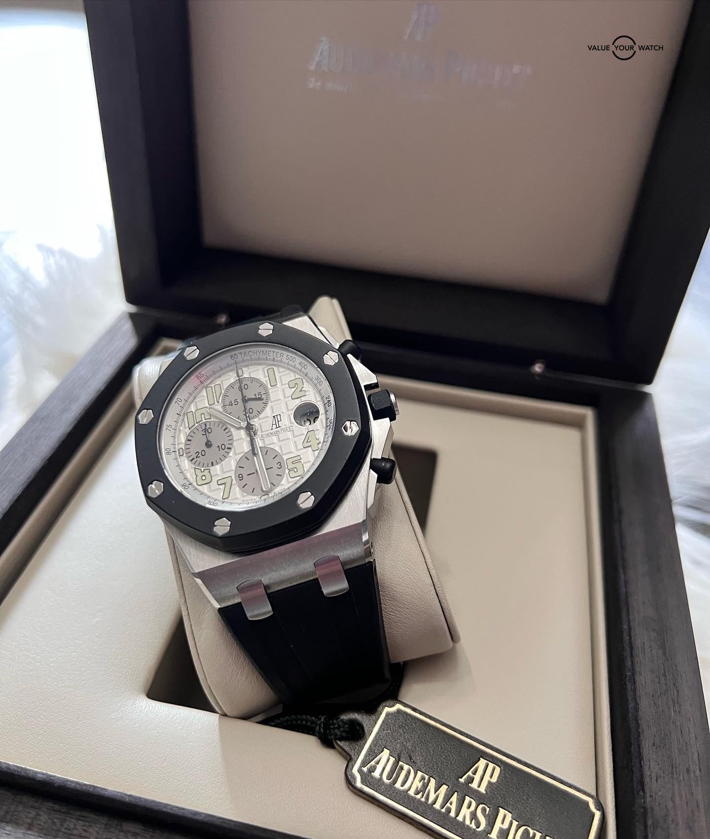 This AP has a stainless case with rubber clad bezel surrounding a white dial that’s finished on a AP rubber strap with stainless steel deployant buckle. Functions include hours, minutes, small seconds, date, and chronograph. Watch measures in 42mm case size, 14.6mm in thickness, 54mm lug-to-lug.
