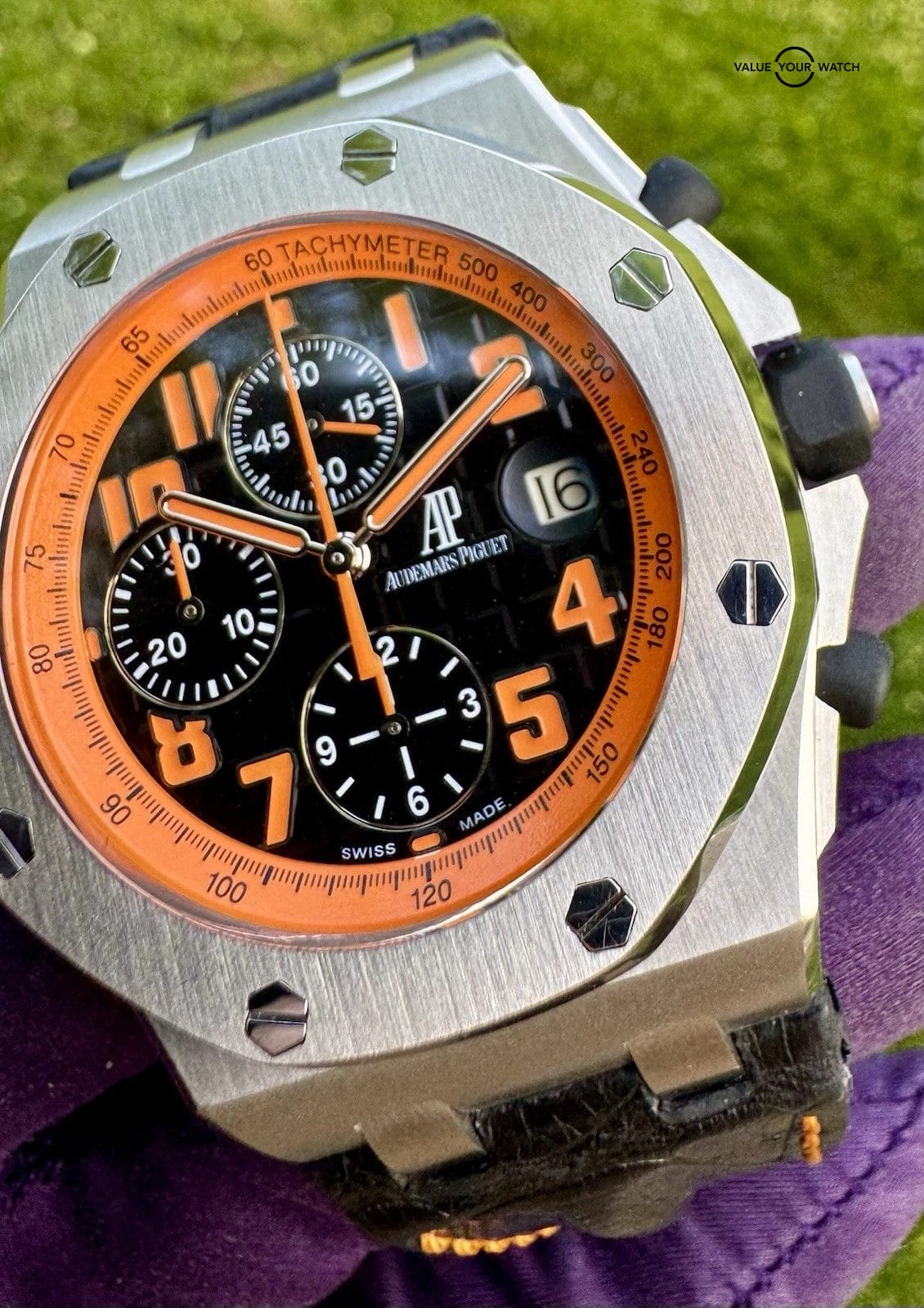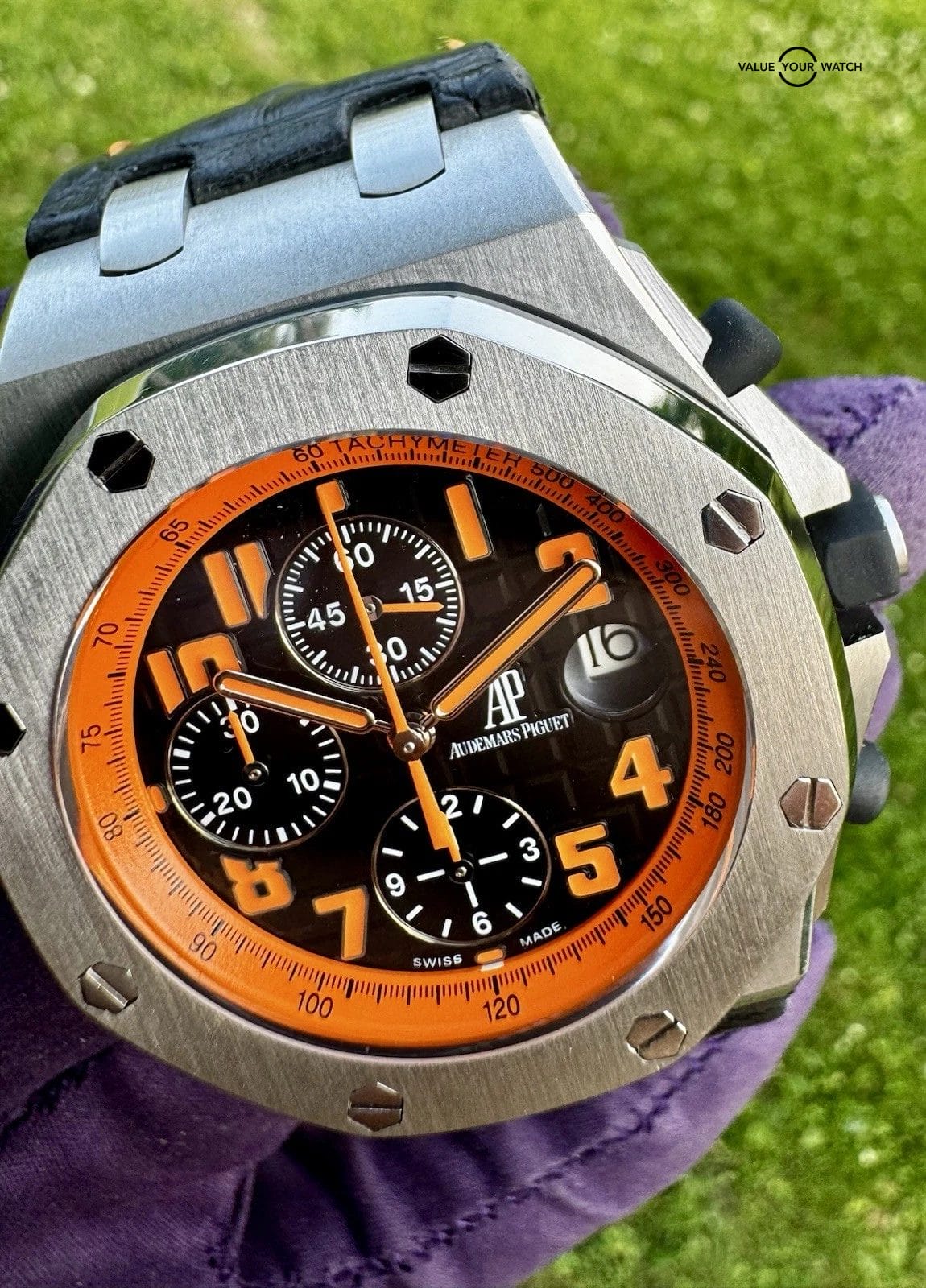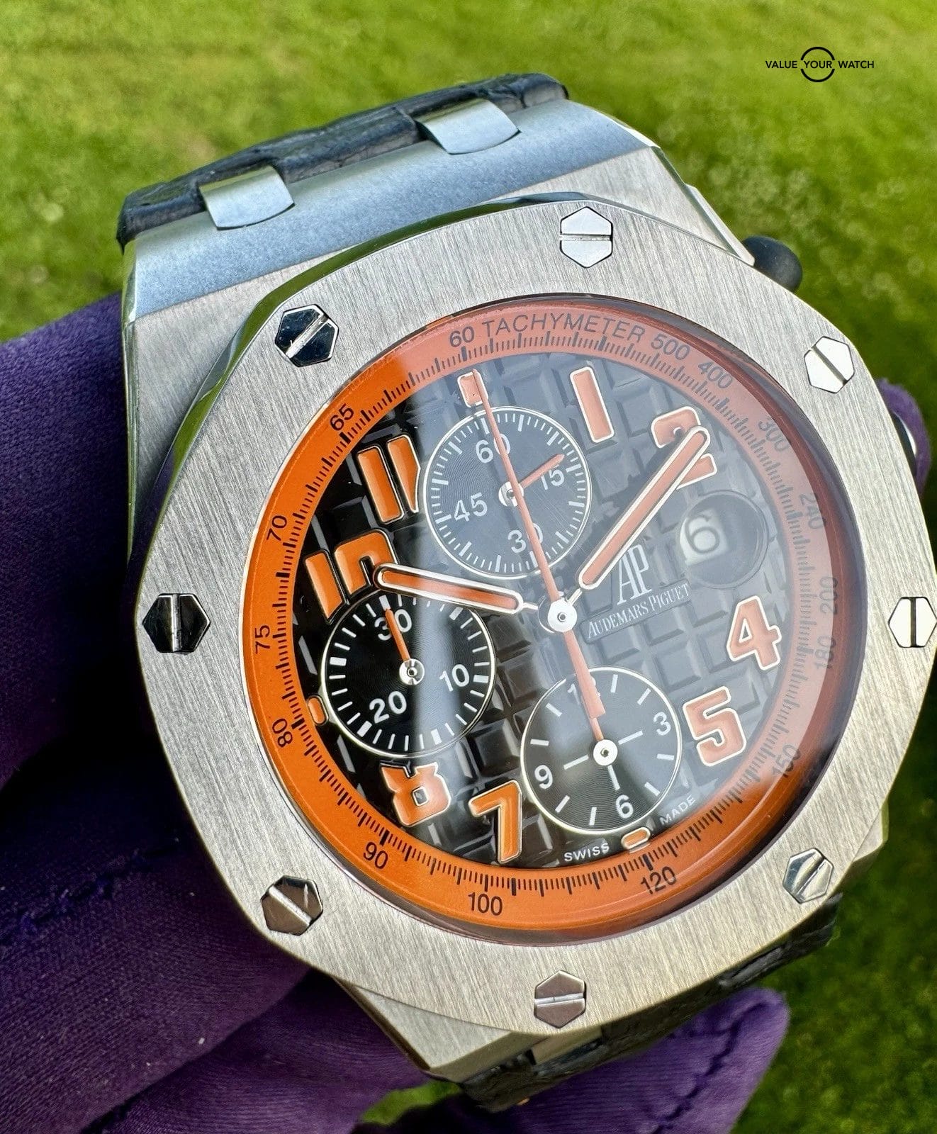 The Audemars Piguet Royal Oak Offshore “Volcano” (26170ST.OO.D101CR.01) features a 42mm steel case and a matching octagonal bezel, secured by exposed screws. Its black dial presents the AP “Méga Tapisserie” pattern, alongside an orange tachymeter scale surrounding orange-luminous hands and Arabic numerals, creating a fun aesthetic and giving easy readability. Three chronograph subdials and a magnified date window come as convenient additions. This model is secured by a leather strap. Don’t miss out, and bid on it!