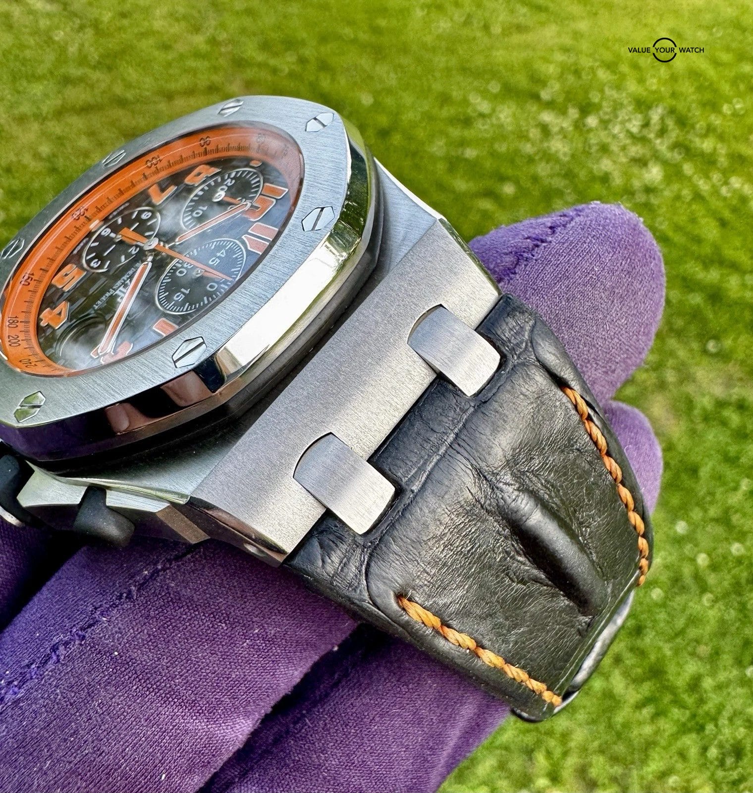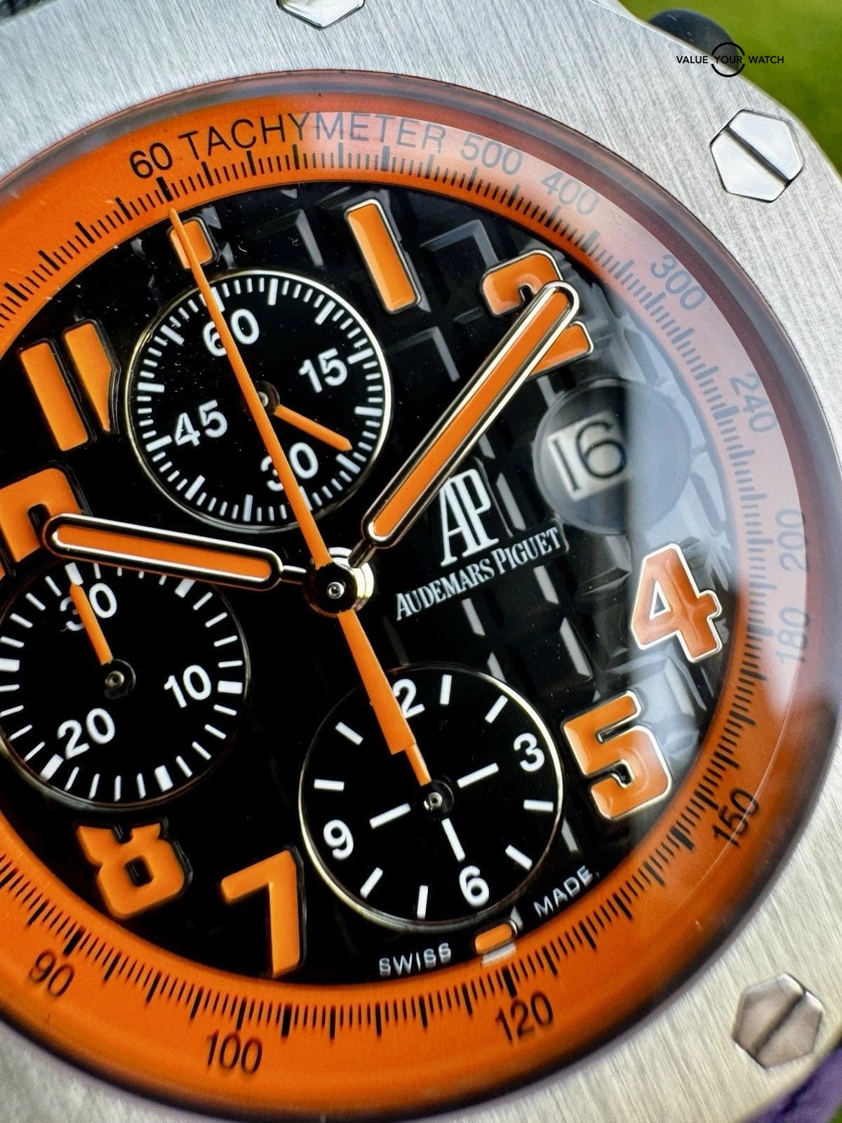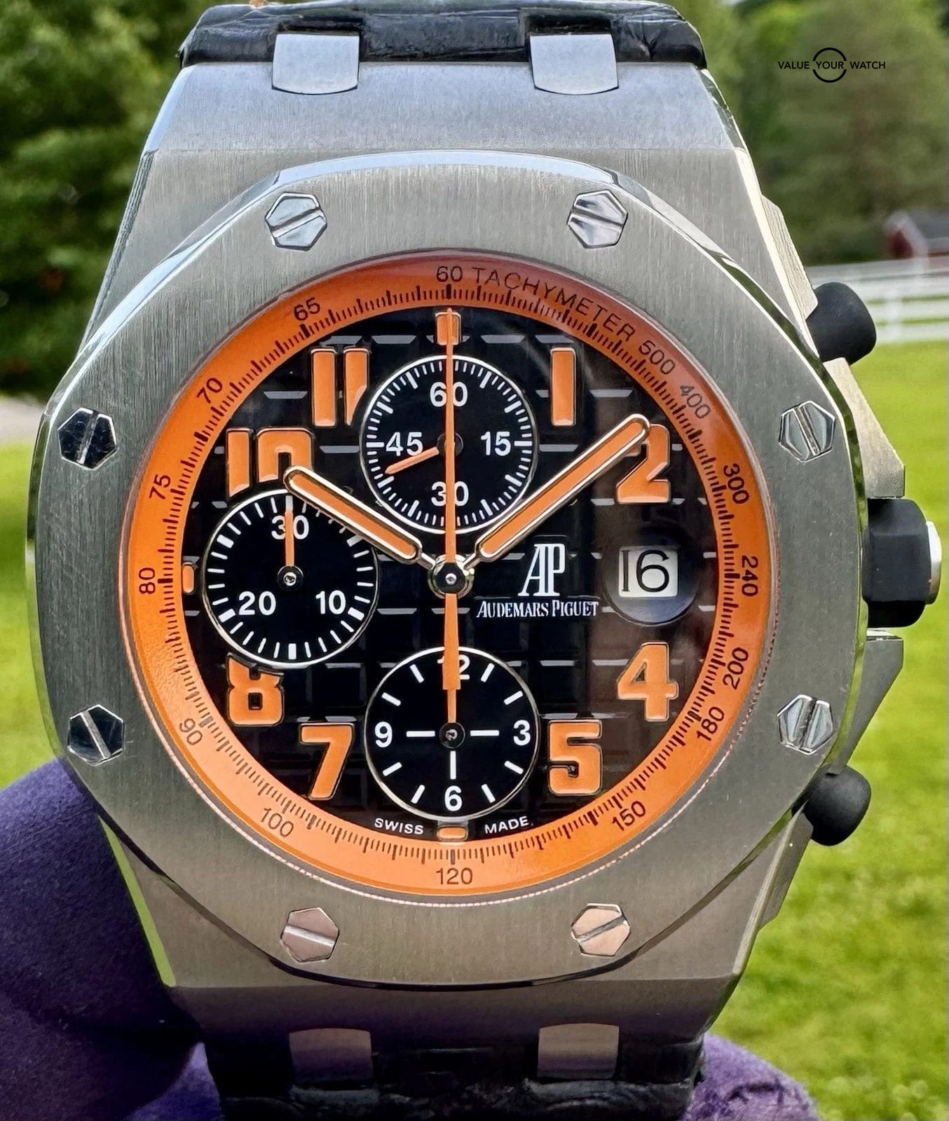 The Audemars Piguet Royal Oak Offshore “Volcano” (26170ST.OO.D101CR.01) features a 42mm steel case and a matching octagonal bezel, secured by exposed screws. Its black dial presents the AP “Méga Tapisserie” pattern, alongside an orange tachymeter scale surrounding orange-luminous hands and Arabic numerals, creating a fun aesthetic and giving easy readability. Three chronograph subdials and a magnified date window come as convenient additions. This model is secured by a leather strap. Don’t miss out, and bid on it!