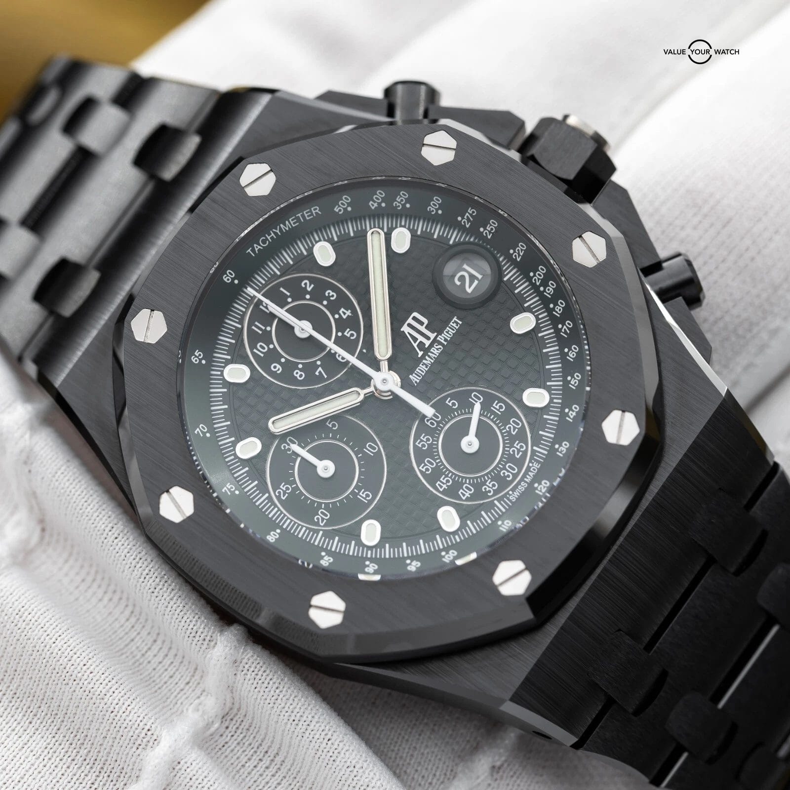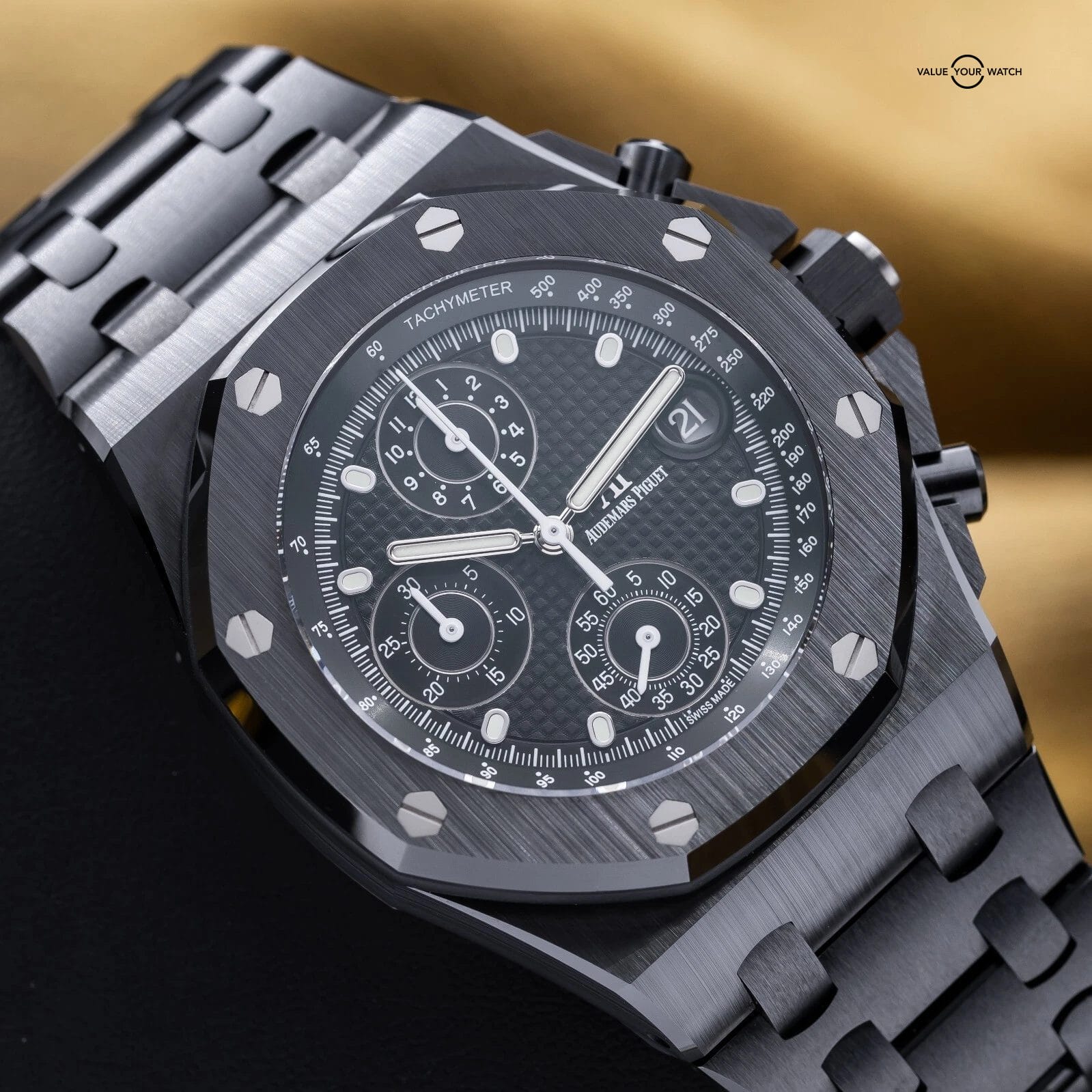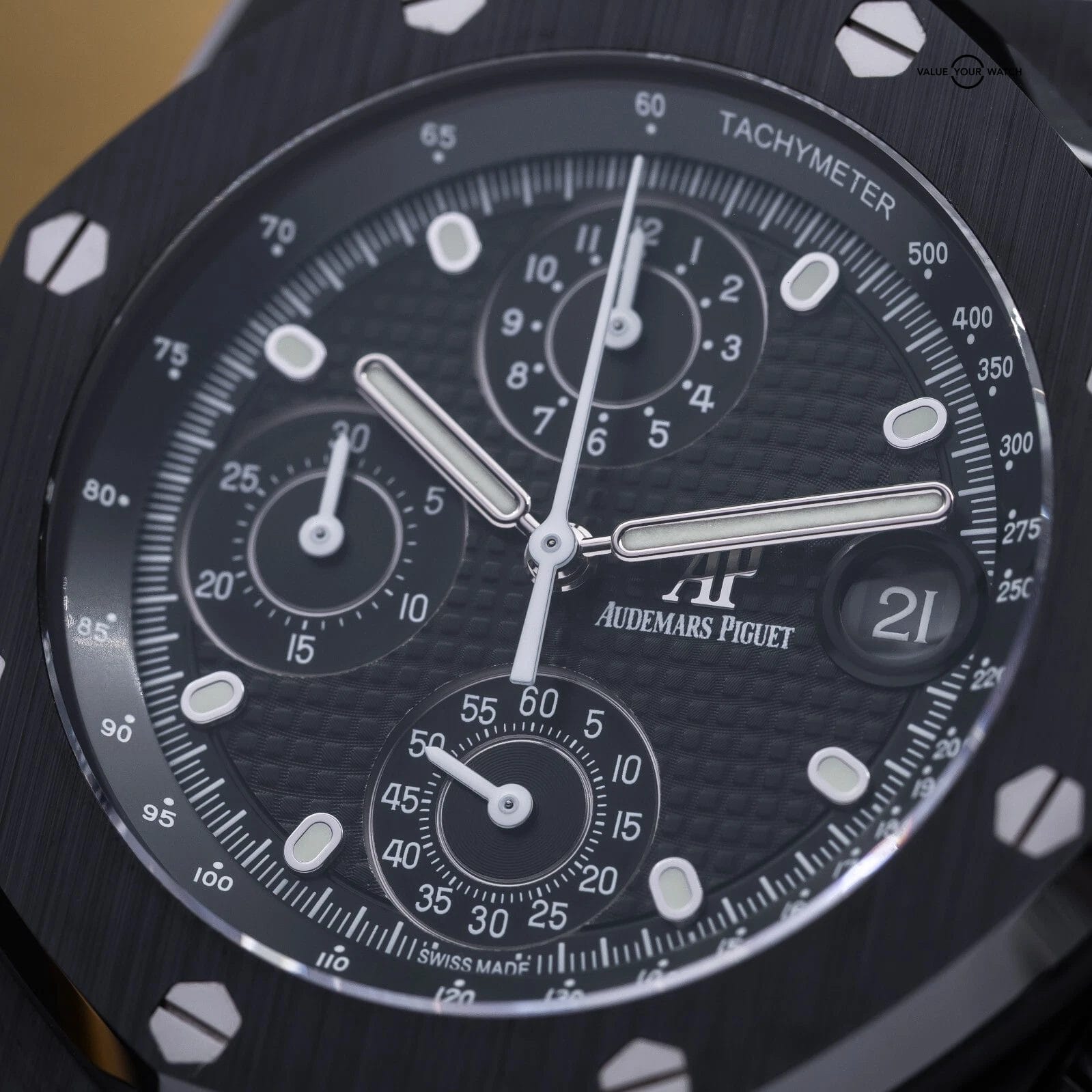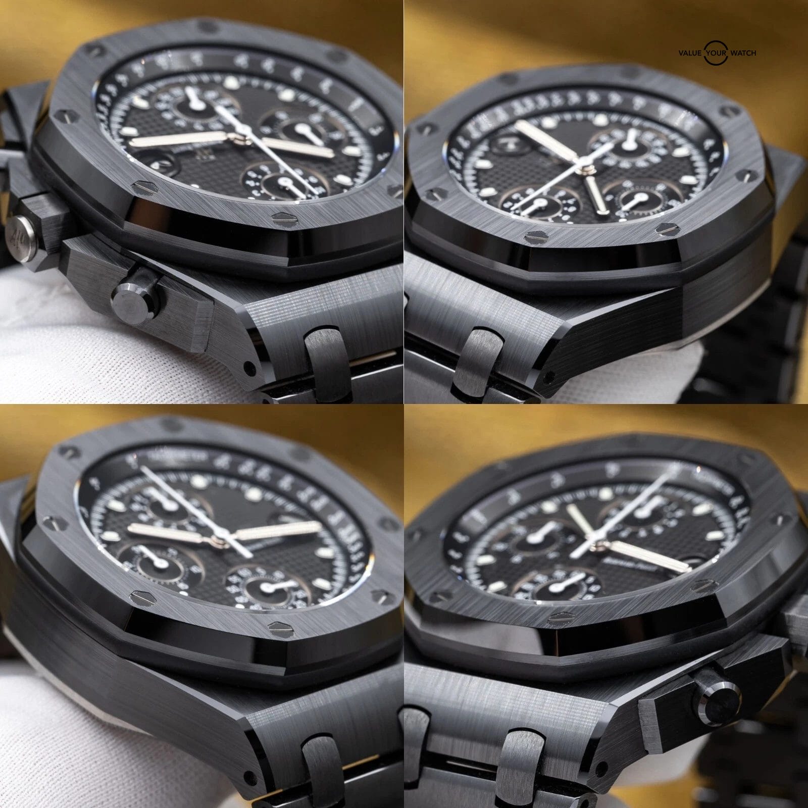 El Royal Oak Offshore Chronograph “Beast” en cerámica negra completa… ¡el niño grande en alta mar! Está hecho completamente en cerámica elegante, negra y a prueba de arañazos, lo que lo convierte en uno de los Offshores más ligeros y cómodos en una pulsera. Este modelo también cuenta con una esfera negra “Grande Tapisserie” que realza el icónico aspecto de Royal Oak. La estética negro sobre negro se eleva aún más por los acentos blancos, agregando un toque de elegancia y visibilidad al diseño. Este reloj es la combinación perfecta de estilo y durabilidad: ¡ven a agarrarlo mientras puedas!