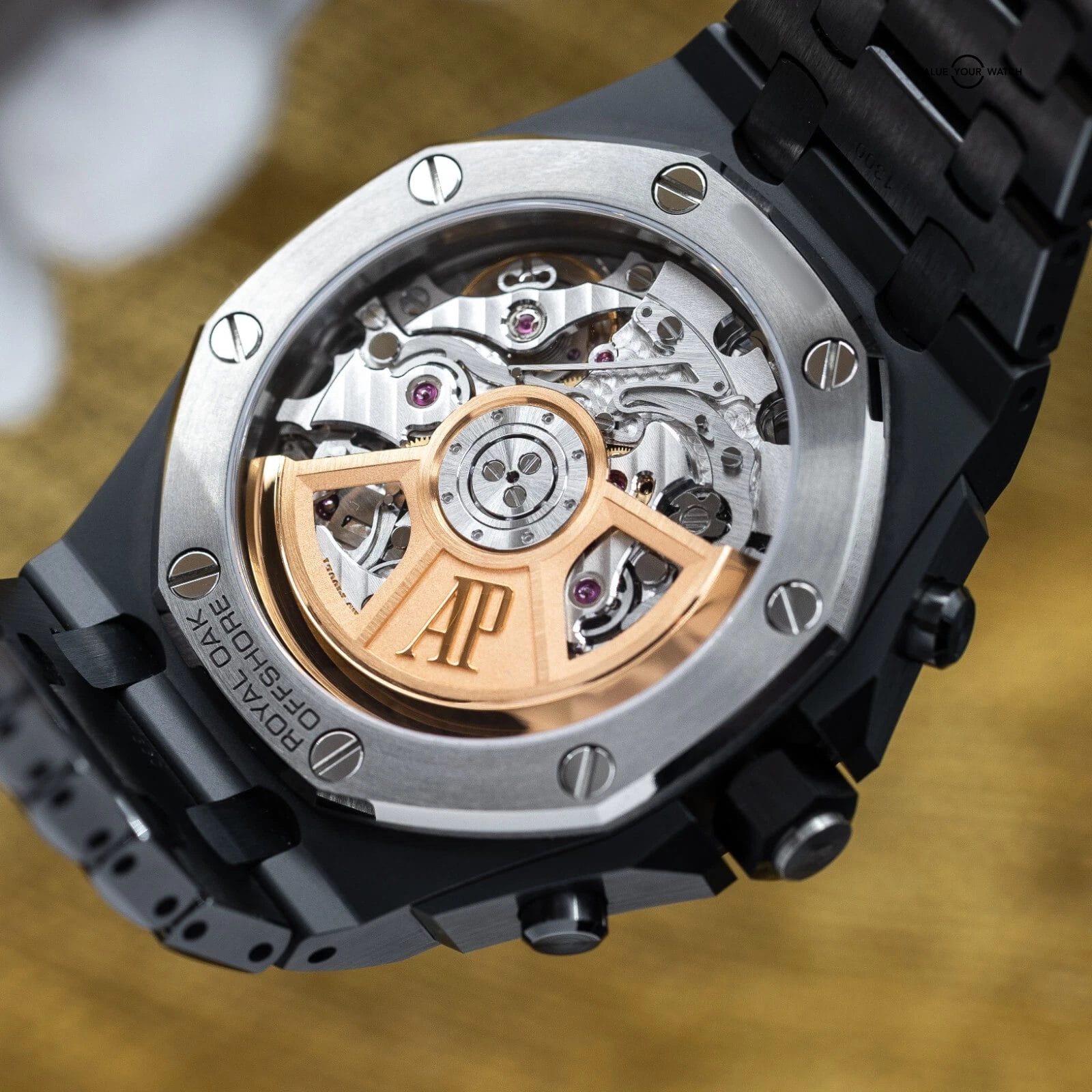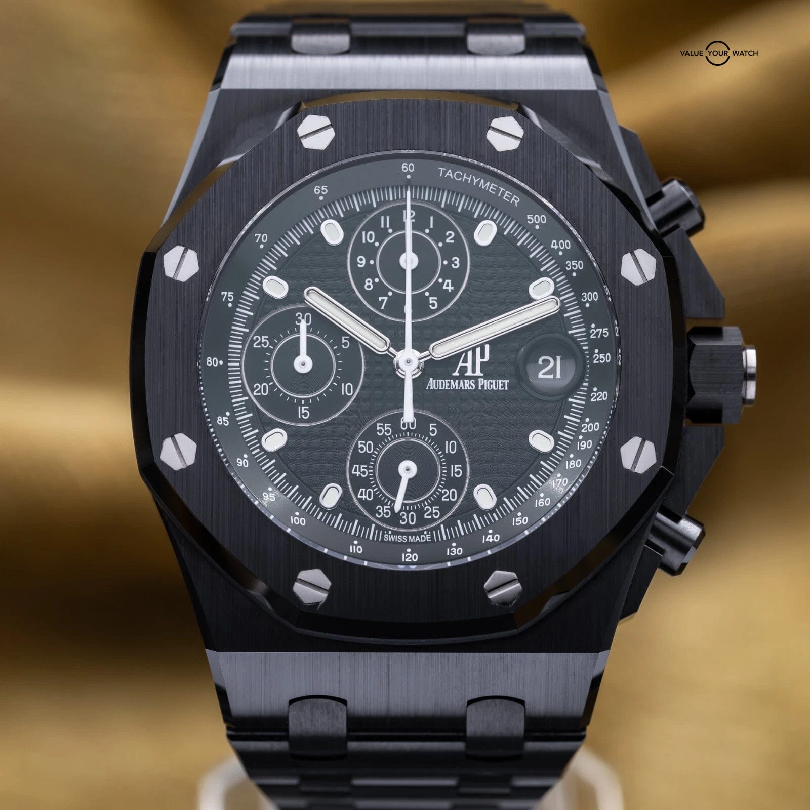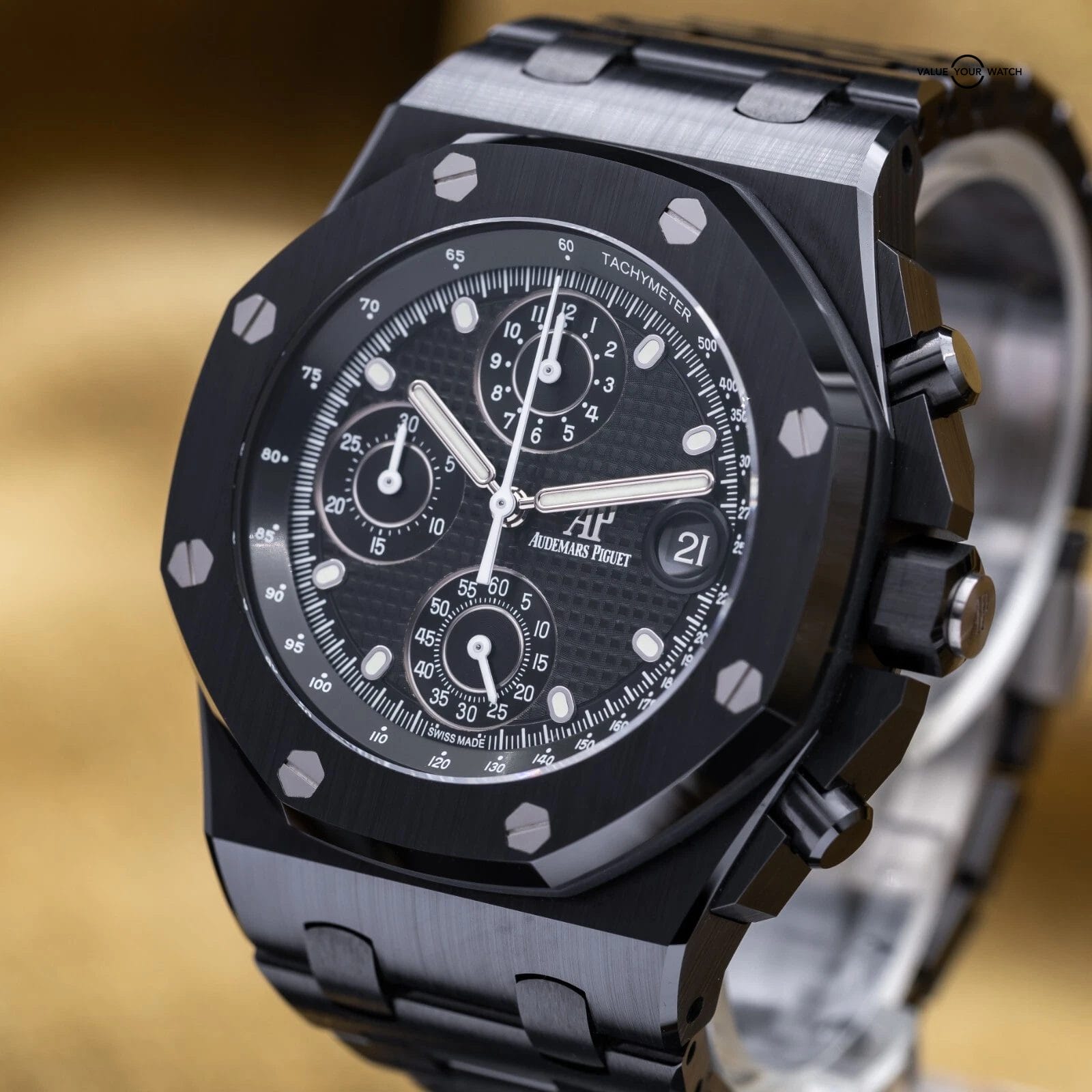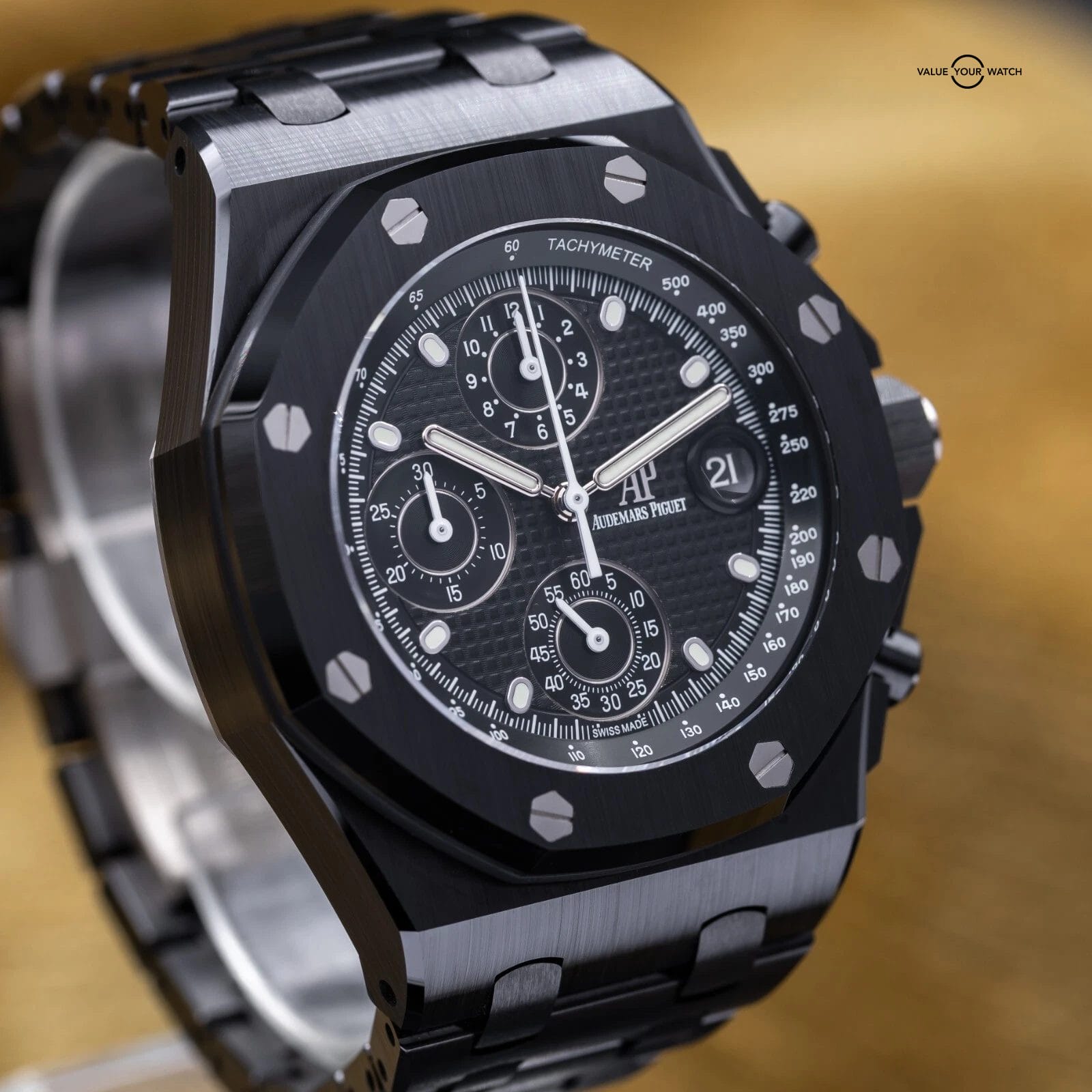 El Royal Oak Offshore Chronograph “Beast” en cerámica negra completa… ¡el niño grande en alta mar! Está hecho completamente en cerámica elegante, negra y a prueba de arañazos, lo que lo convierte en uno de los Offshores más ligeros y cómodos en una pulsera. Este modelo también cuenta con una esfera negra “Grande Tapisserie” que realza el icónico aspecto de Royal Oak. La estética negro sobre negro se eleva aún más por los acentos blancos, agregando un toque de elegancia y visibilidad al diseño. Este reloj es la combinación perfecta de estilo y durabilidad: ¡ven a agarrarlo mientras puedas!