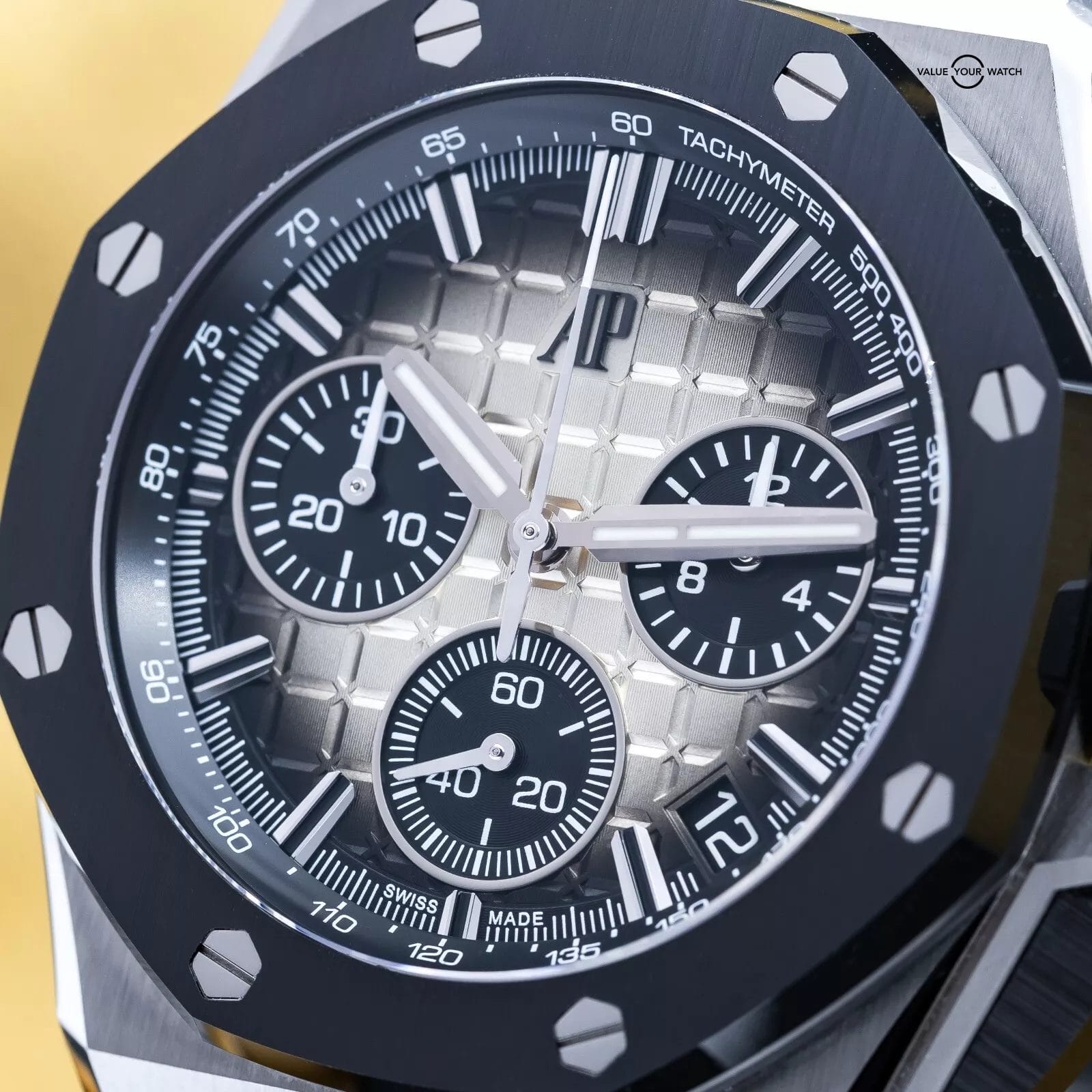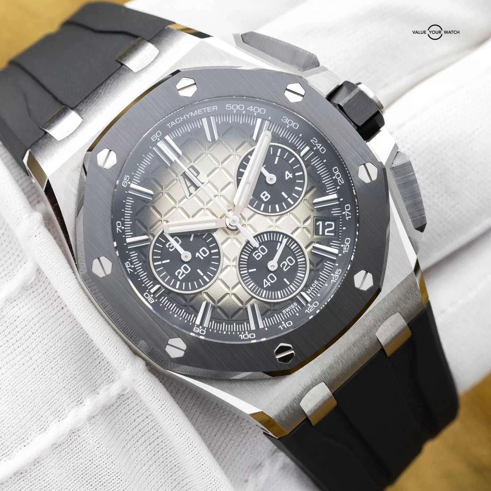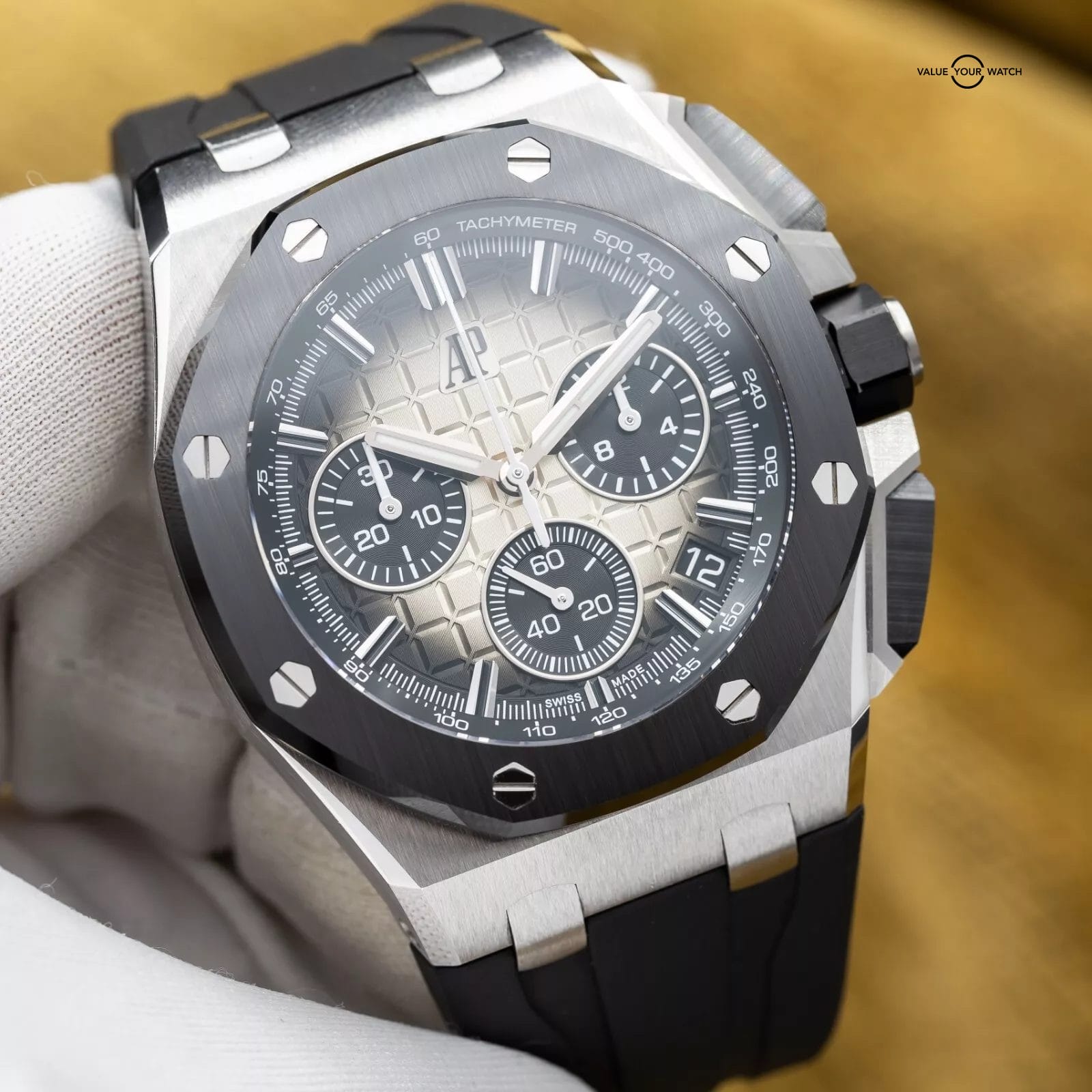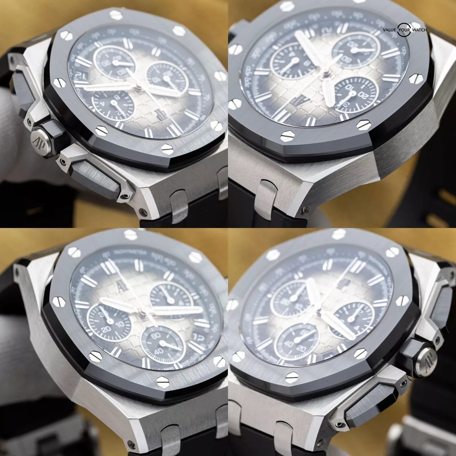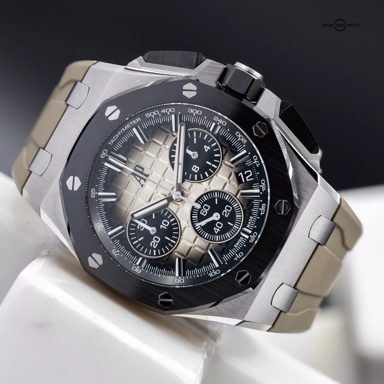 Up for sale is the highly desirable Taupe dial variant of the newer 43mm Royal Oak Offshore from AP. The smoke transition on this dial is absolutely insane in the flesh! This one with the ceramic bezel and full ceramic pushers! The case houses the calibre 4401 Flyback Chronograph movement, a more complicated version of the standard chronograph that allows on-the-fly resetting while it’s running. You can see the intricacies of this complicated movement through the open case back. This newer version also comes with AP’s new quick strap change system. You can literally change out the strap for another color or material, including the buckle, in less than 30 seconds…it’s a game changer!