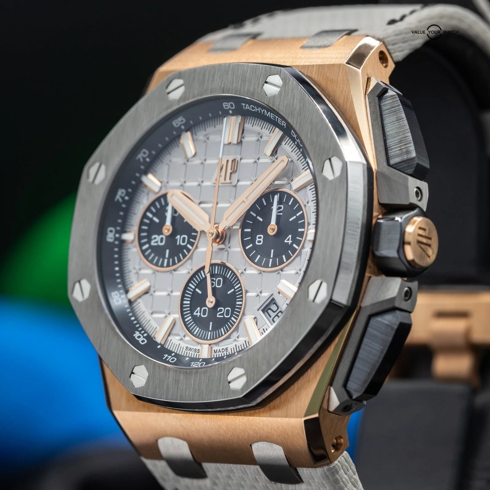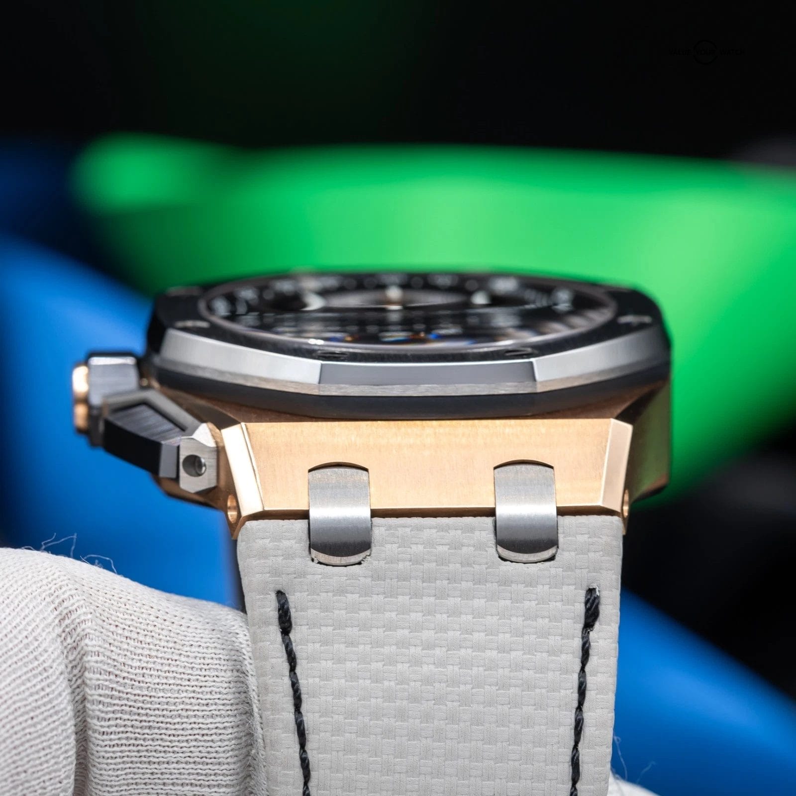 The Audemars Piguet Royal Oak Offshore 26420OI.OO.A015VE.01—nicknamed “The Lebron”—is a modern expression of refined strength. The warmth of 18-carat pink gold is beautifully balanced by the cool precision of a titanium bezel, creating a harmonious contrast that feels both contemporary and timeless. Its grey “Méga Tapisserie” dial, seamlessly paired with the matching strap, delivers a composed yet commanding aesthetic that speaks to those who appreciate bold design executed with elegance. Enhanced by Audemars Piguet’s quick-change strap system, this Offshore transitions effortlessly between its grey calfskin and black rubber straps, combining practical versatility with unmistakable presence. The result is a timepiece that embodies contemporary prestige—confident in design, versatile in execution, and unmistakably Royal Oak Offshore.
