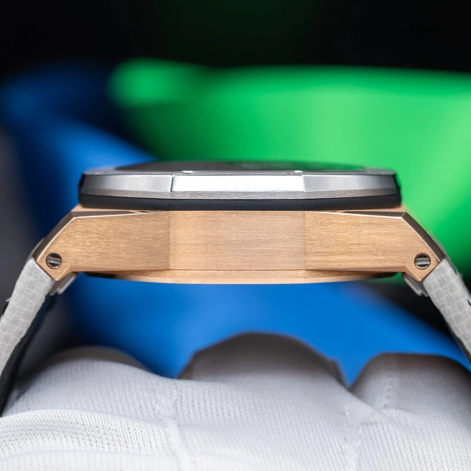 • Dial: Grey “Méga Tapisserie” pattern with black counters and black external zone, rose gold applied hour markers and Royal Oak hands with luminescent coating, black inner bezel