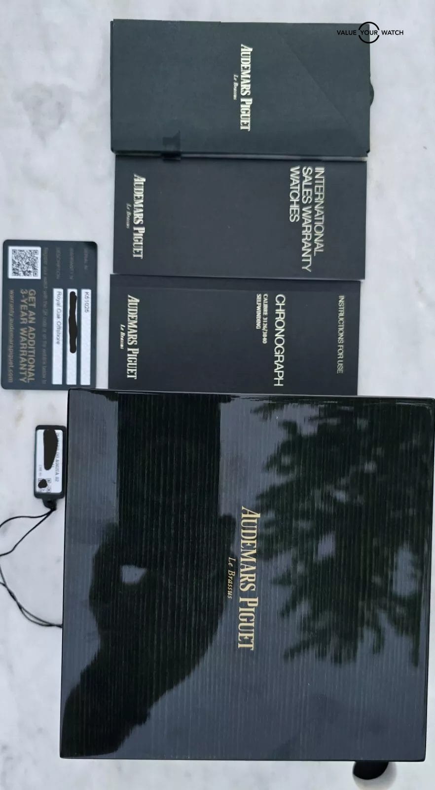This Audemars Piguet Royal Oak Offshore Men’s Watch in Black is a stunning timepiece that exudes elegance and style. The watch features a 44mm rose gold case with a screwed bezel and an exhibition caseback, showcasing the intricate mechanical (automatic) movement within. The black tapisserie dial pattern is accented with baton indexes and luminous hands and indexes, making it easy to read even in low light conditions.