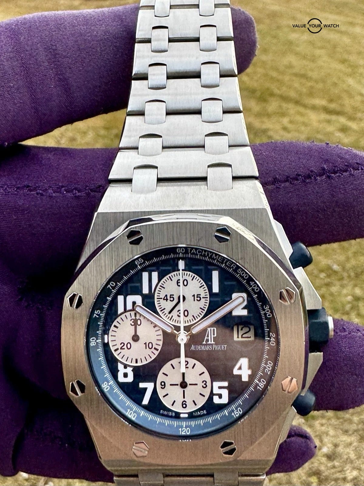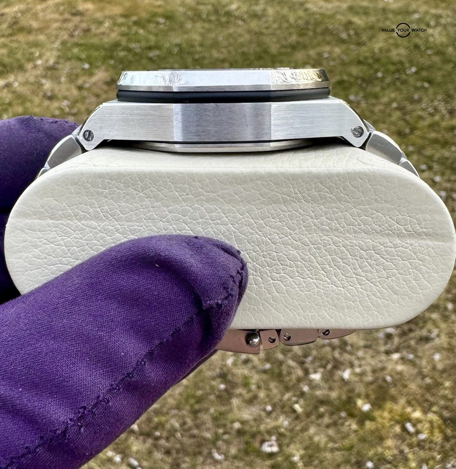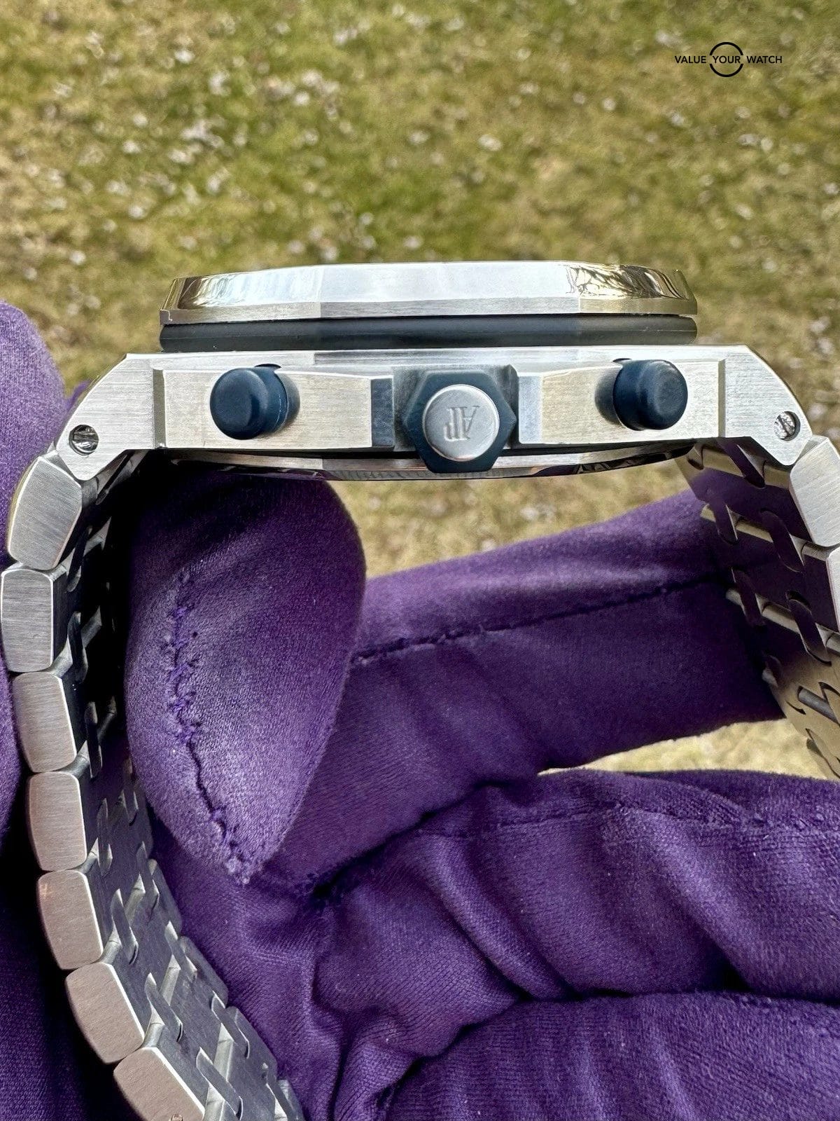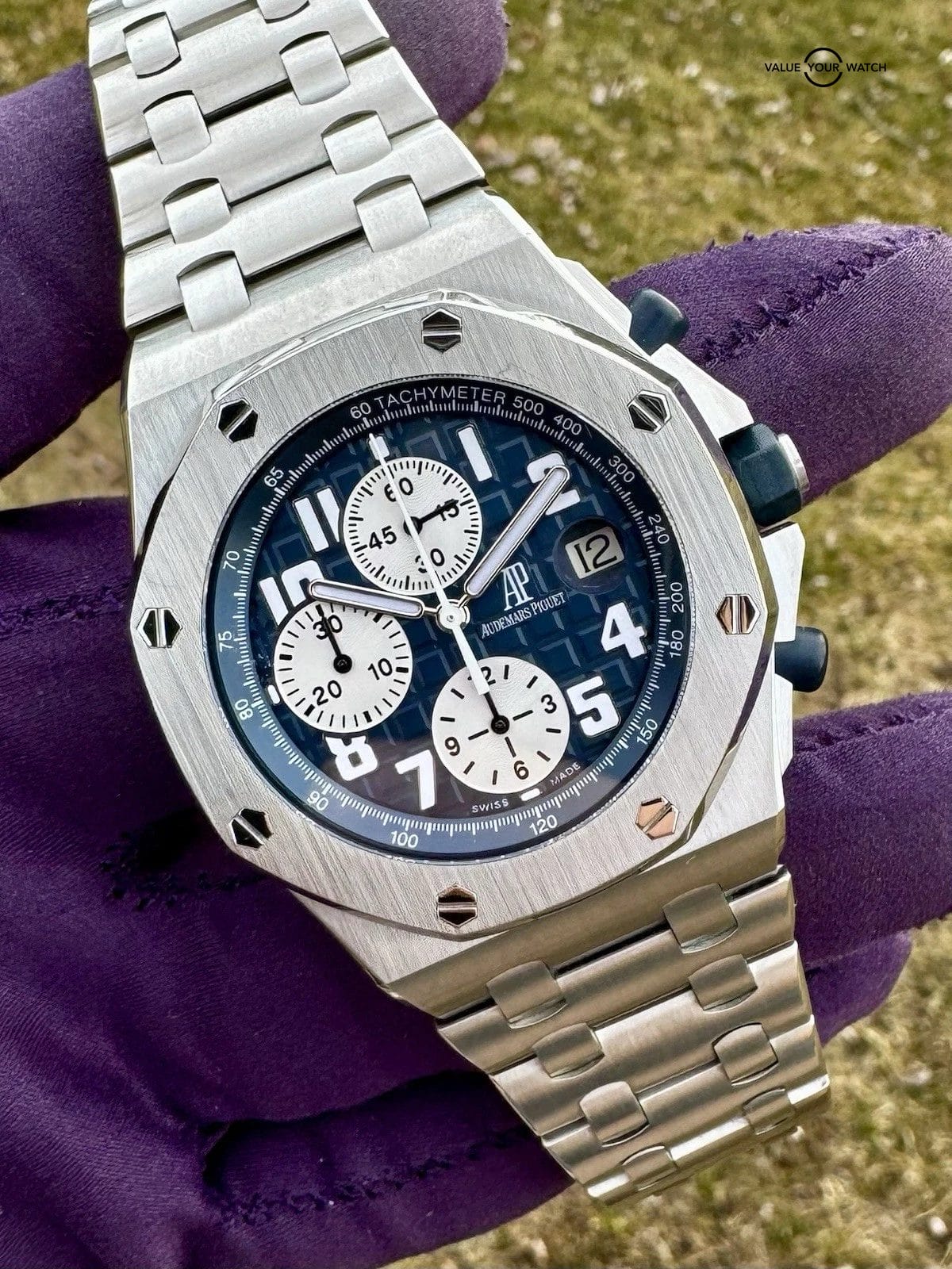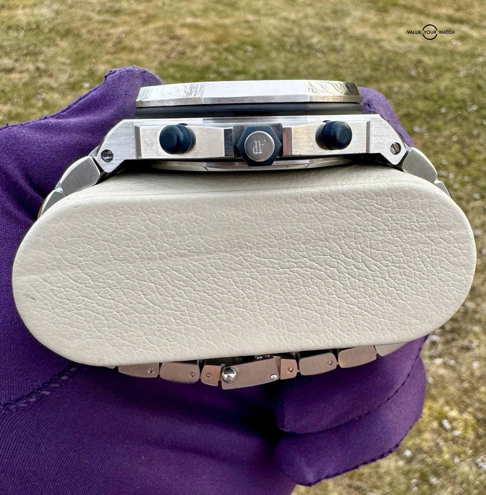 The Audemars Piguet Royal Oak Offshore Chronograph (25721ST.OO.1000ST.09.A) features a 42mm steel case and a matching bezel that houses a blue dial with the “Méga Tapisserie” pattern. It is complemented by a tachymeter scale, luminous hour markers, and hands. alongside three white contrasting subdials for a 30-minute counter, a 12-hour counter, and a small seconds counter. A small date window is located at 3 o’clock. The steel bracelet secures the piece with durability and provides a sleek aesthetic to the wrist. Don’t miss the chance to own this piece, and make an offer now!