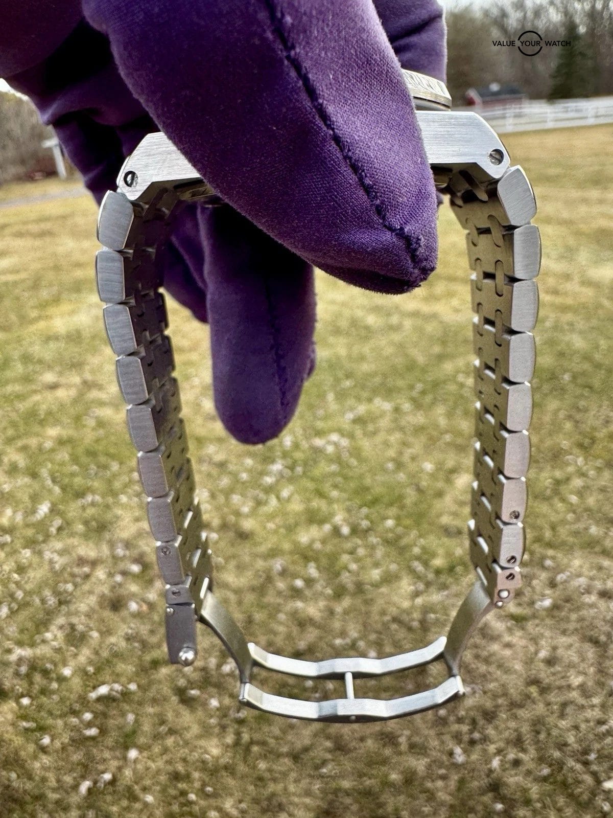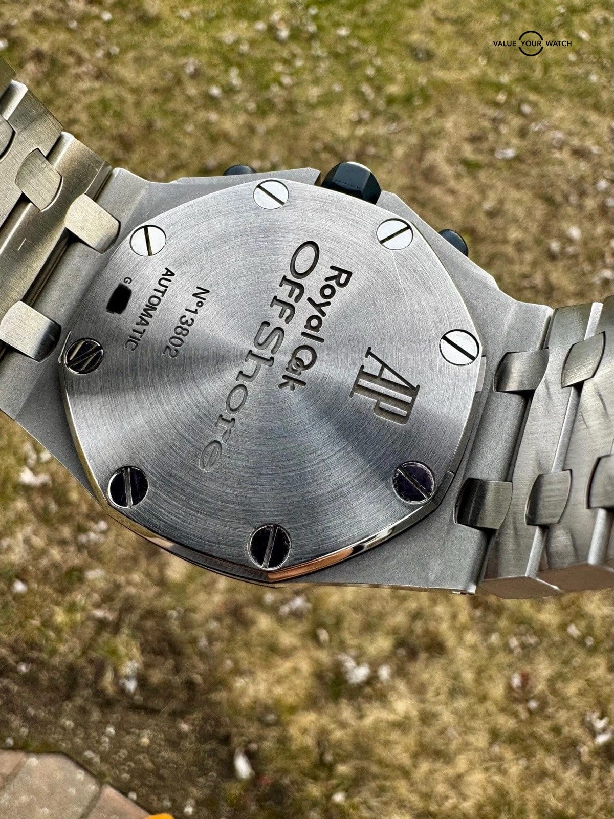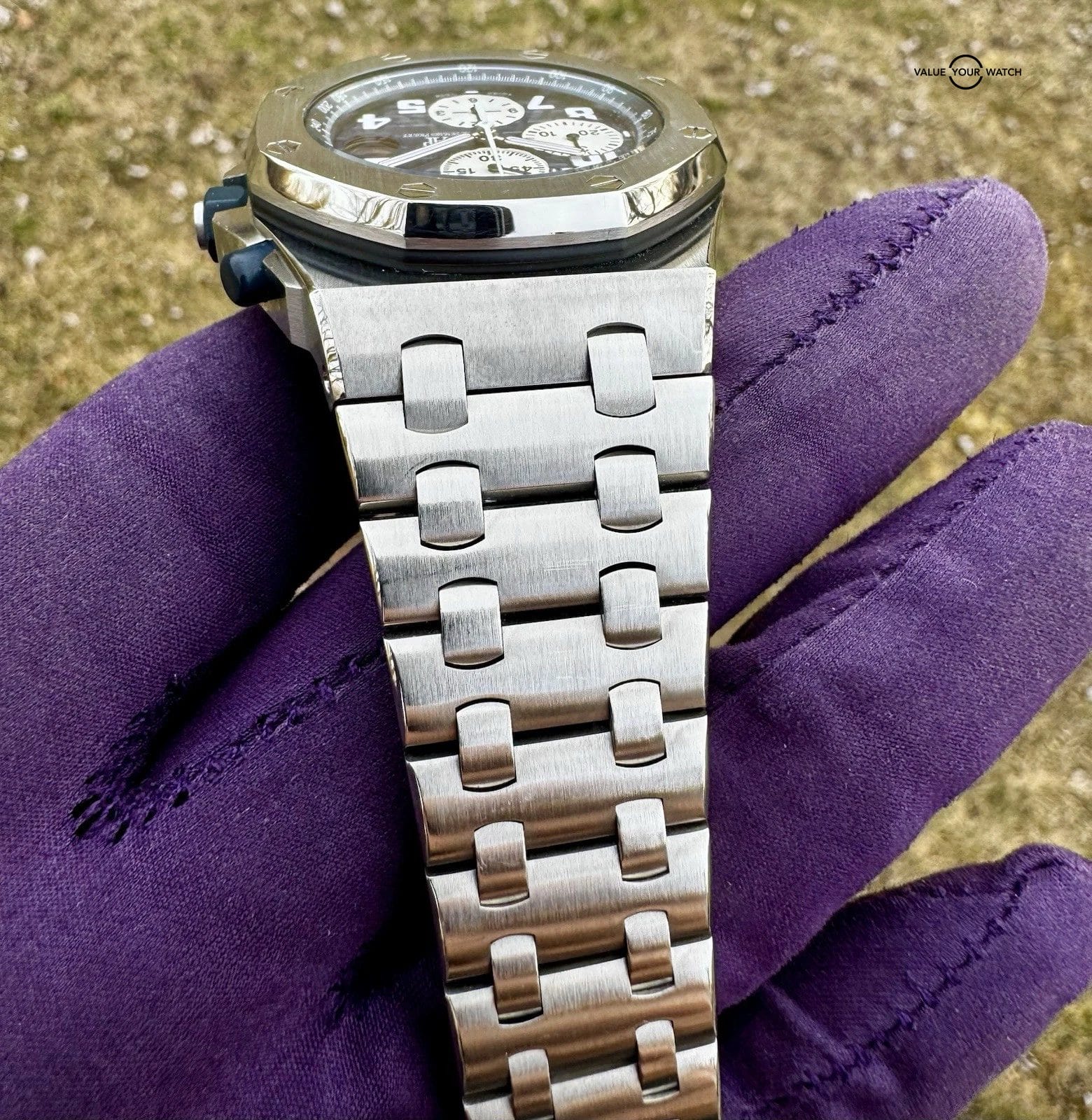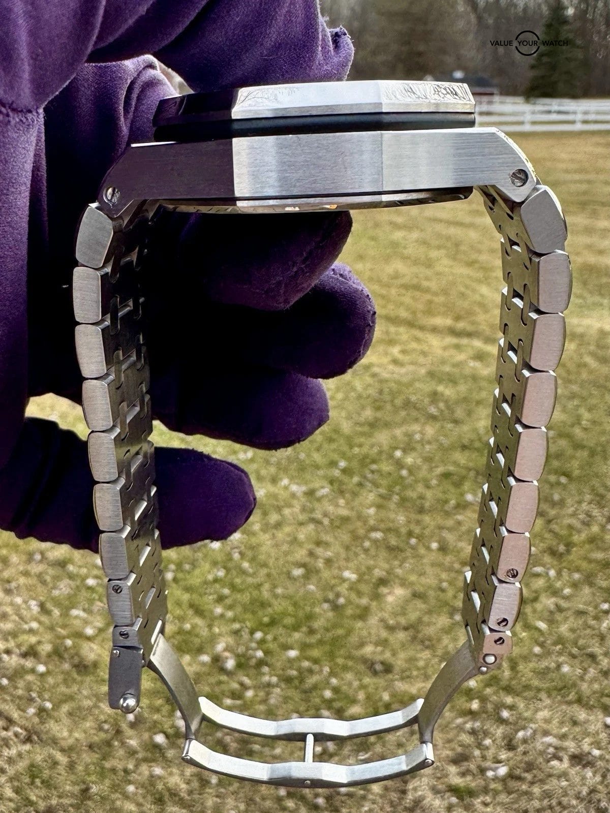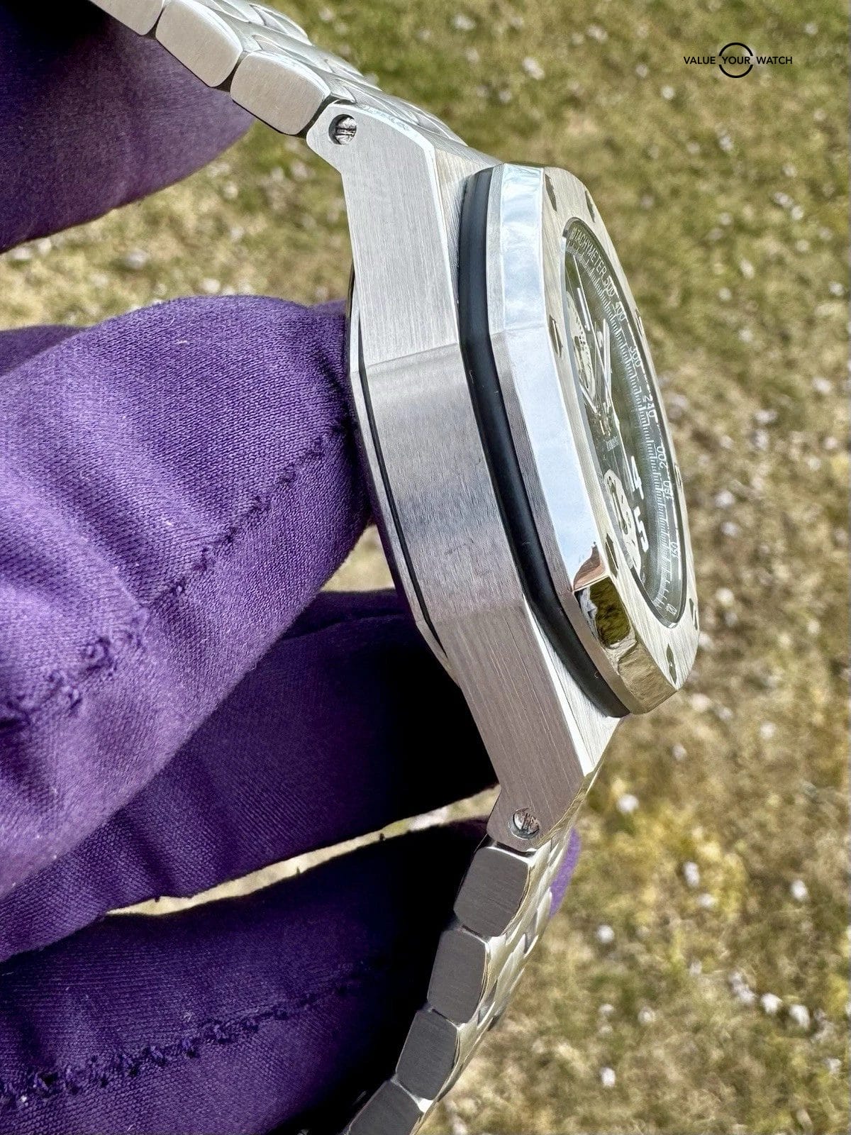 The Audemars Piguet Royal Oak Offshore Chronograph (25721ST.OO.1000ST.09.A) features a 42mm steel case and a matching bezel that houses a blue dial with the “Méga Tapisserie” pattern. It is complemented by a tachymeter scale, luminous hour markers, and hands. alongside three white contrasting subdials for a 30-minute counter, a 12-hour counter, and a small seconds counter. A small date window is located at 3 o’clock. The steel bracelet secures the piece with durability and provides a sleek aesthetic to the wrist. Don’t miss the chance to own this piece, and make an offer now!