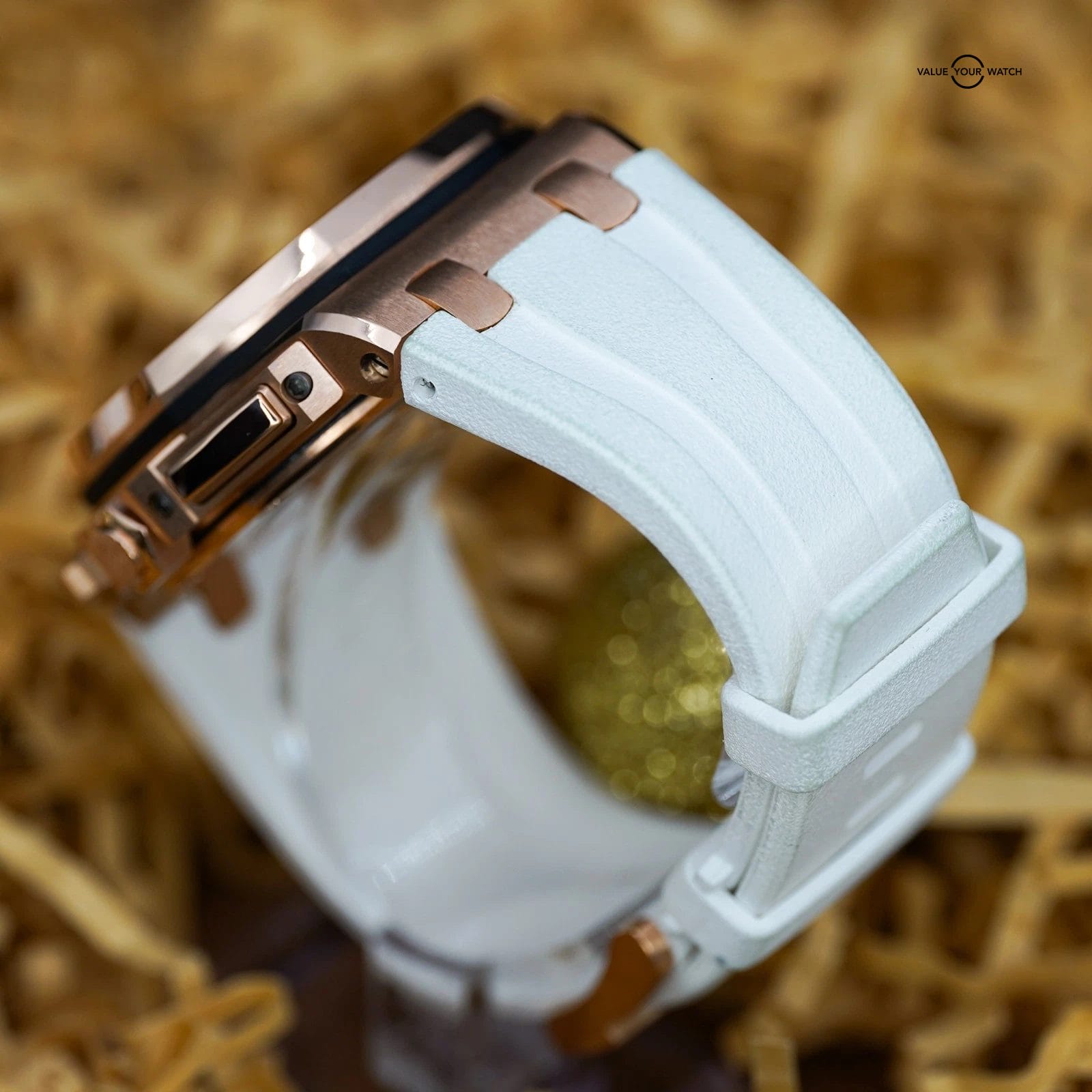 Encased in 18KT rose gold, the white “Méga Tapisserie” dial is beautifully balanced with blue accents on the chronograph features and red hands – a signal to heritage – and complemented with a white sport strap for absolute comfort.