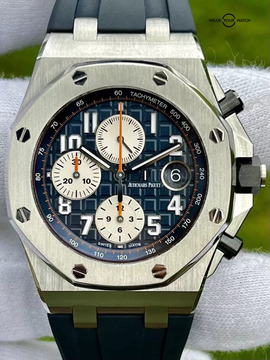The Audemars Piguet Royal Oak Offshore (26470ST.OO.A027CA.01) features a 42mm steel case and bezel, offering robustness and durability, while the recognized blue “Méga Tapisserie” pattern dial is complemented with three subdials at the 6, 9, and 12 o’clock positions while a date window at 3 o’clock adds further time measurement capabilities while it adds to its design. It is secured by a rubber strap fastened by a buckle adorned with Audemars Piguet’s initials. Don’t miss the chance to bid on this timepiece today!