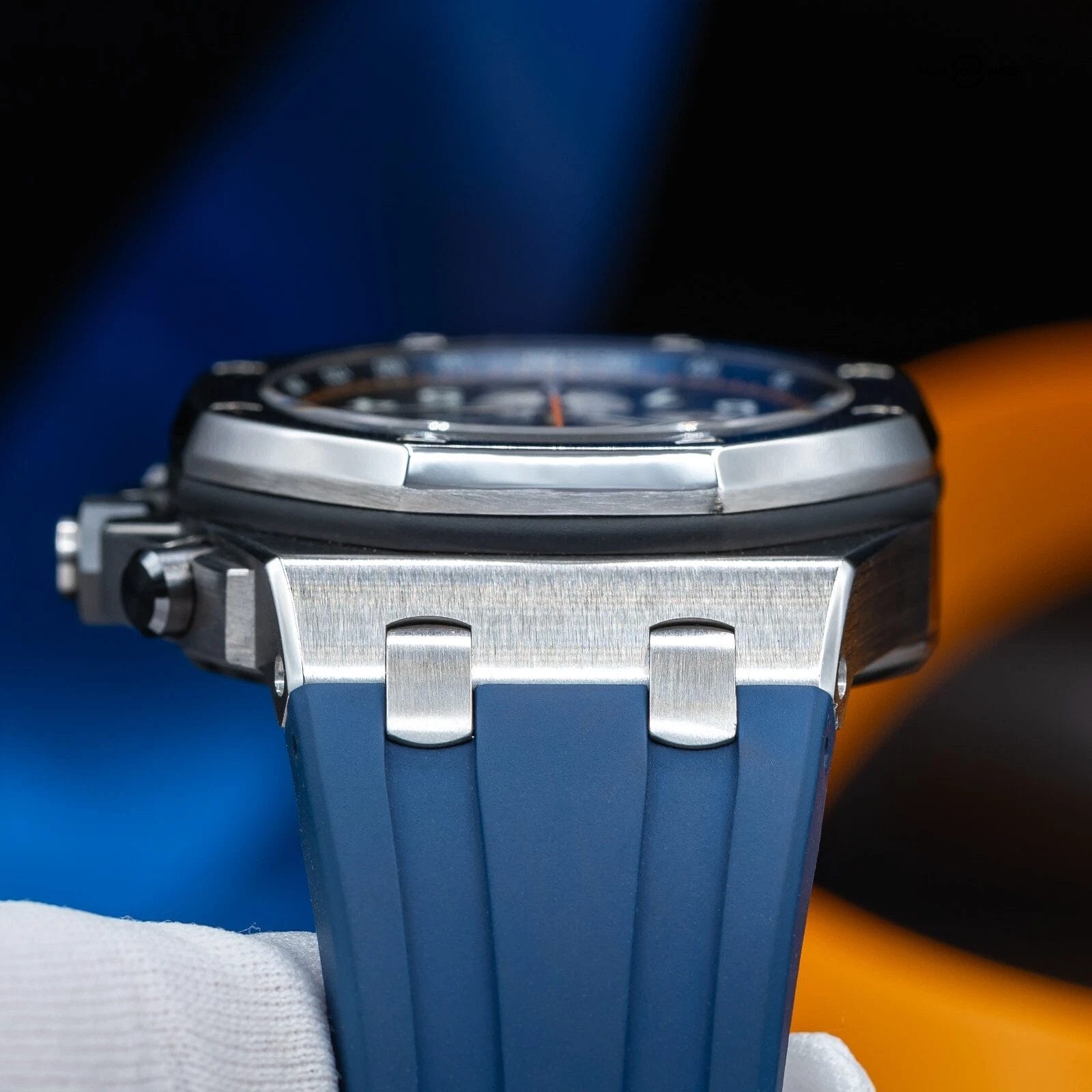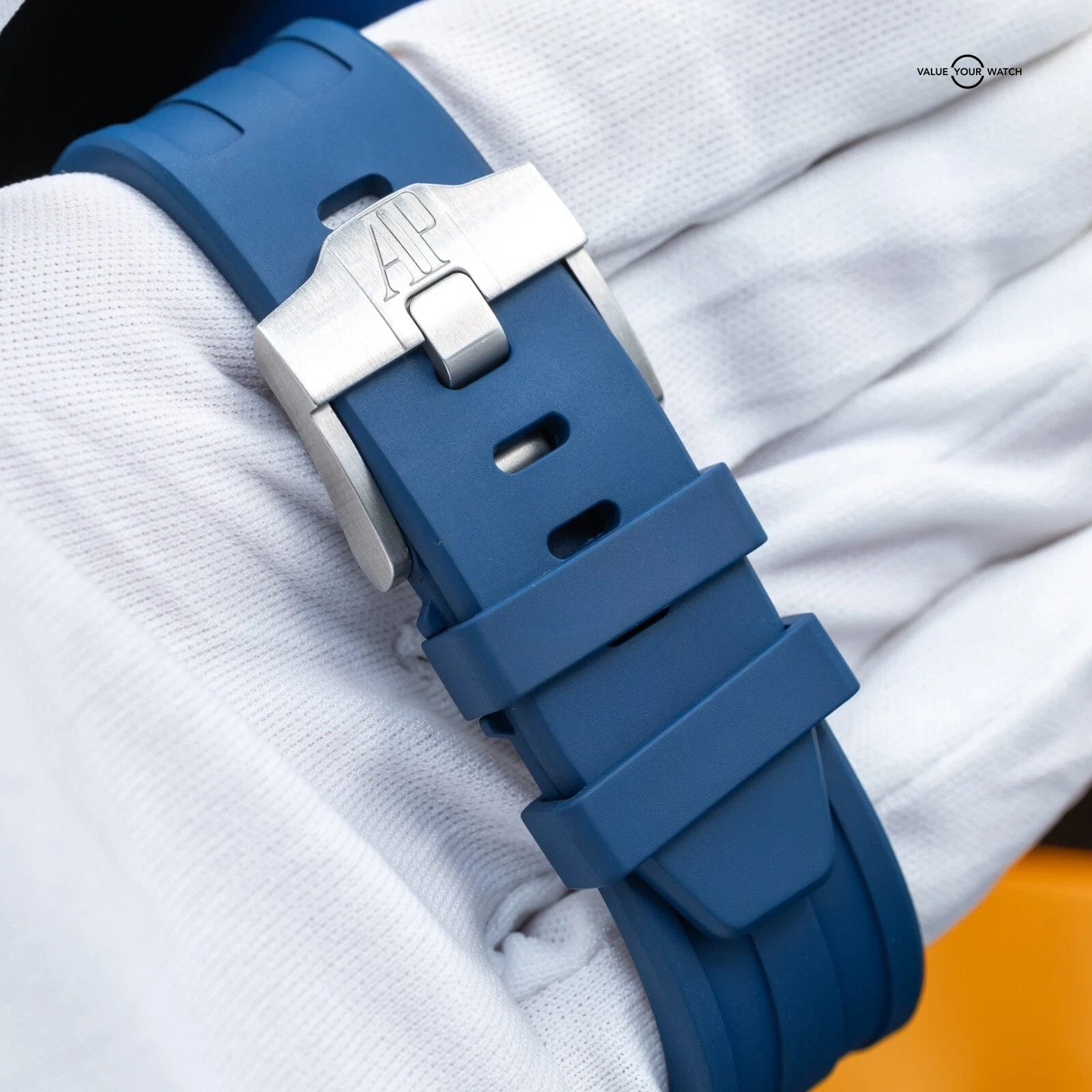 Nicknamed the “Navy” for its striking blue colorway, the Audemars Piguet Royal Oak Offshore Chronograph 26470ST.OO.A027CA.01 is a bold, nautical-inspired take on the legendary Offshore design. Its 42mm stainless steel case features the signature octagonal bezel with exposed screws, while the royal blue “Méga Tapisserie” dial and matching blue rubber strap offer a sporty, commanding presence on the wrist.