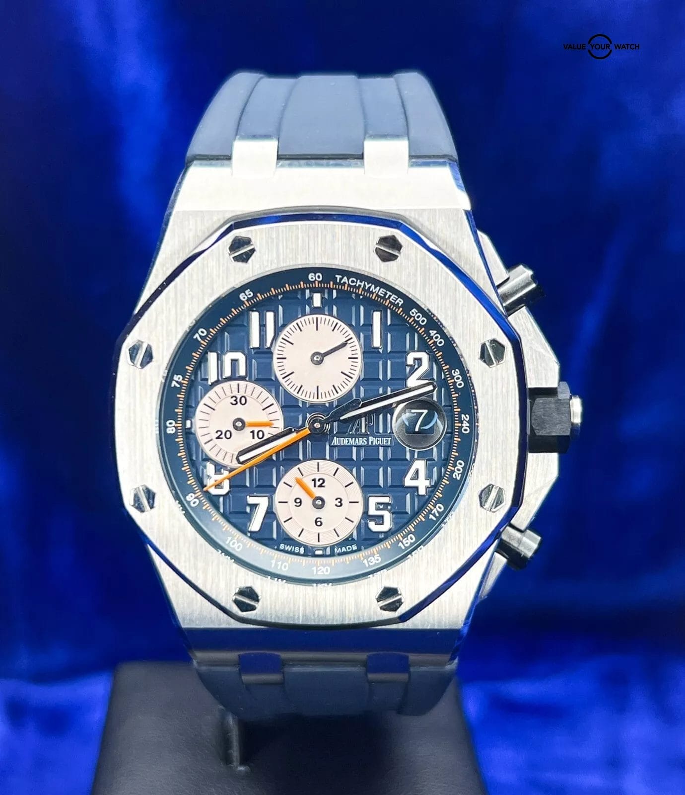 Like New!! Its sporty, casual and an eye-catcher for sure. The Audemars Piguet Royal Oak Offshore (26470ST) showcases the brand’s luxury watchmaking legacy in a 42 mm steel case, radiating strength and sophistication. Its unique design features the iconic “octagonal steel bezel” for that distinctive touch. It’s an eye catcher with its blue Méga Tapisserie dial, featuring an inner tachymeter scale ring, and three sub-dials that enhance its functionality. Positioned at 6 o’clock is a 12-hour counter, while at 9 o’clock resides a 30-minute counter, and at 12 o’clock, a small seconds-hand adds precision.