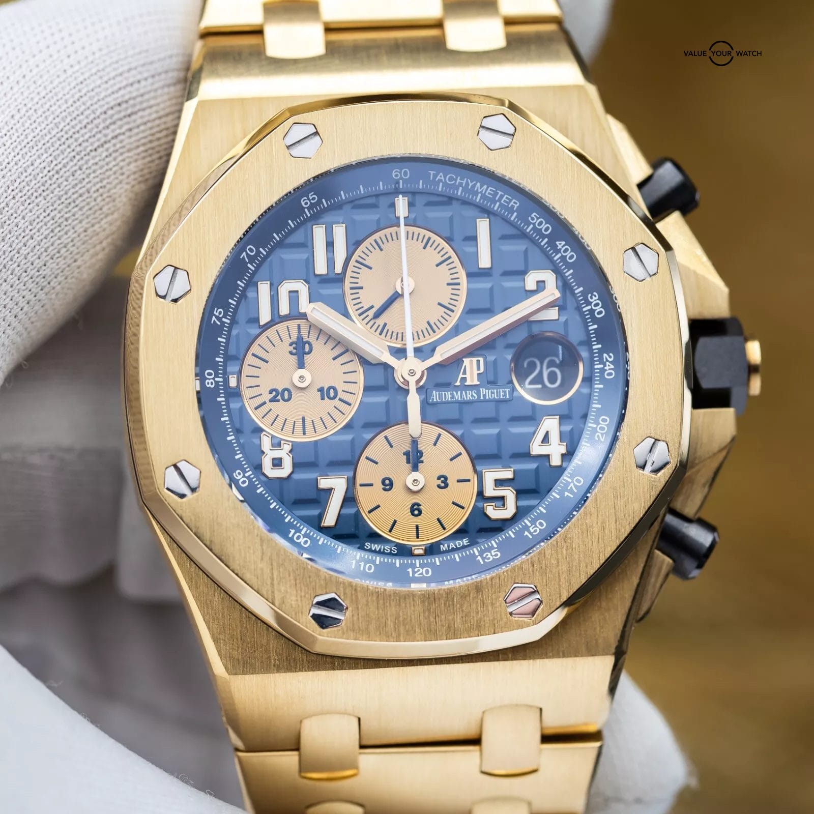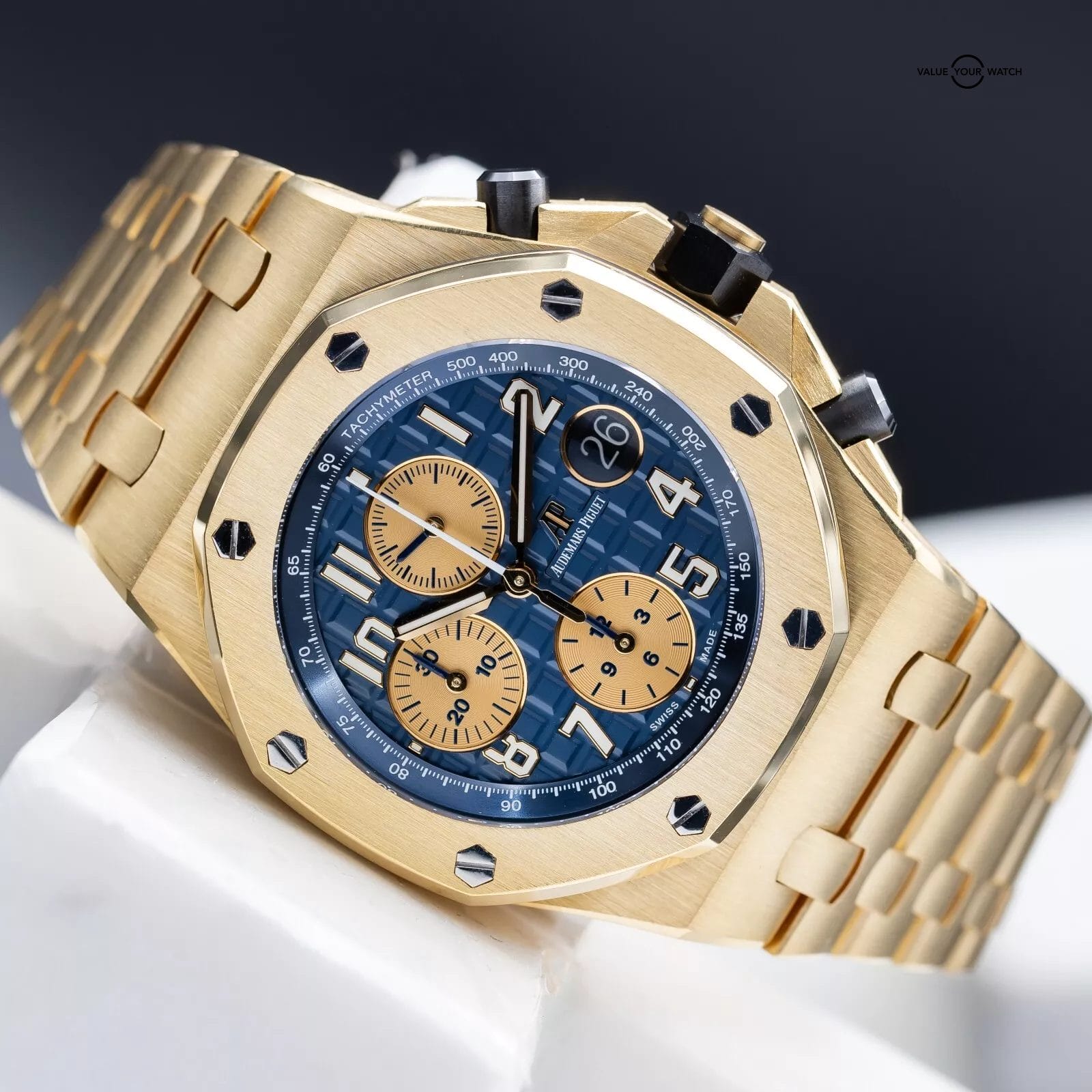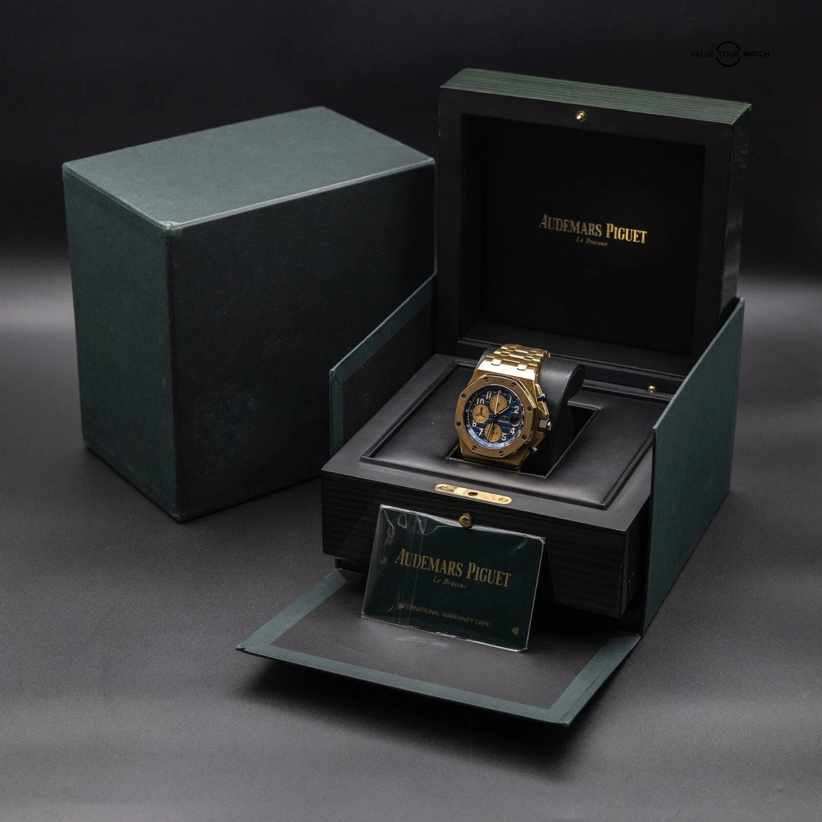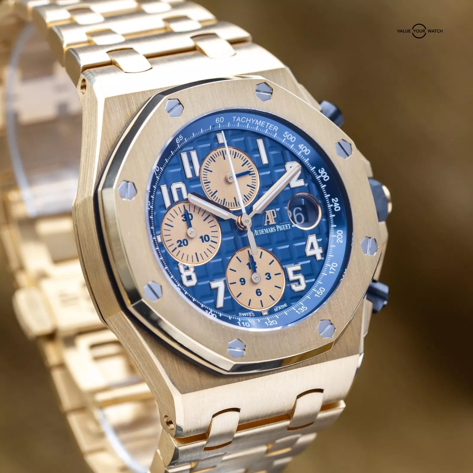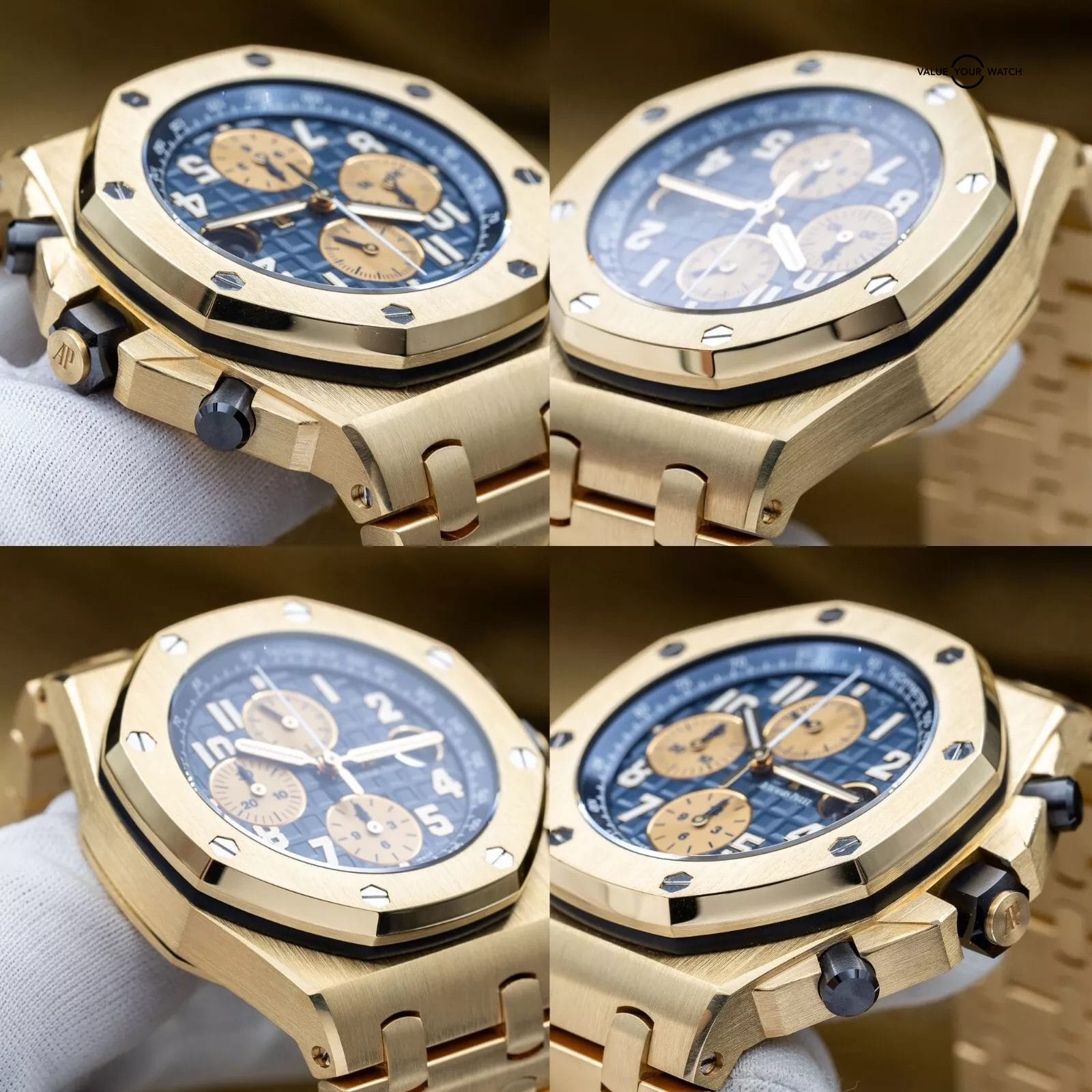 Up for sale or trade is a true stand-out piece – the rare yellow gold blue-dial “Brick”. You won’t see many of these listed on the market at all…especially a full set from 2019! Crafted from nearly 300g of solid gold, this one has immense wrist presence while still feeling refined. The beautiful brushing on the yellow gold case and bezel against the vibrant Mega Tapisserie blue dial are out of this world in the flesh! The 42mm case adds to its desirability due to it being the most wearable size for most wrists. This one is a serious addition to any collection, especially someone looking for an AP you won’t run into another of – don’t miss your chance to grab it before it’s gone!