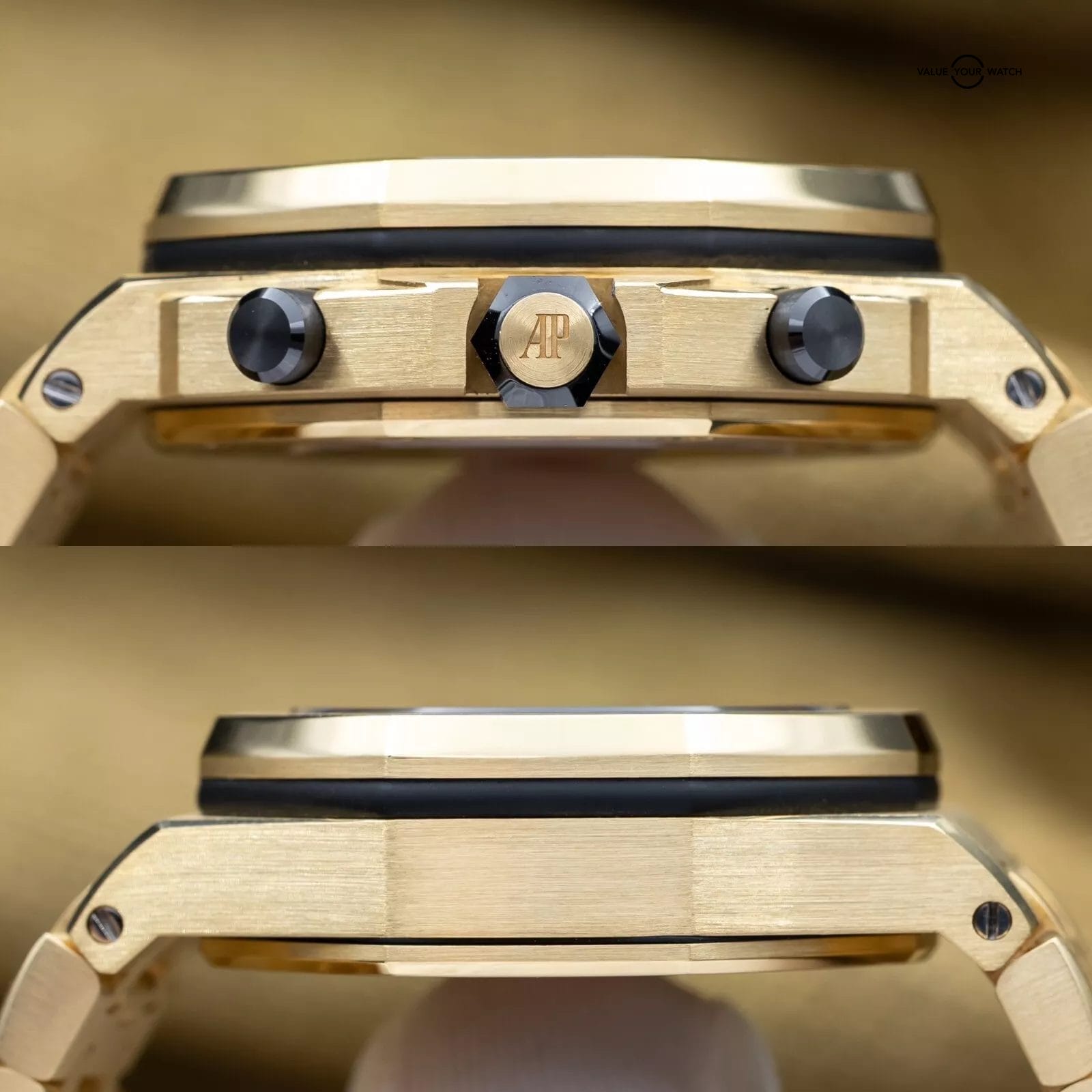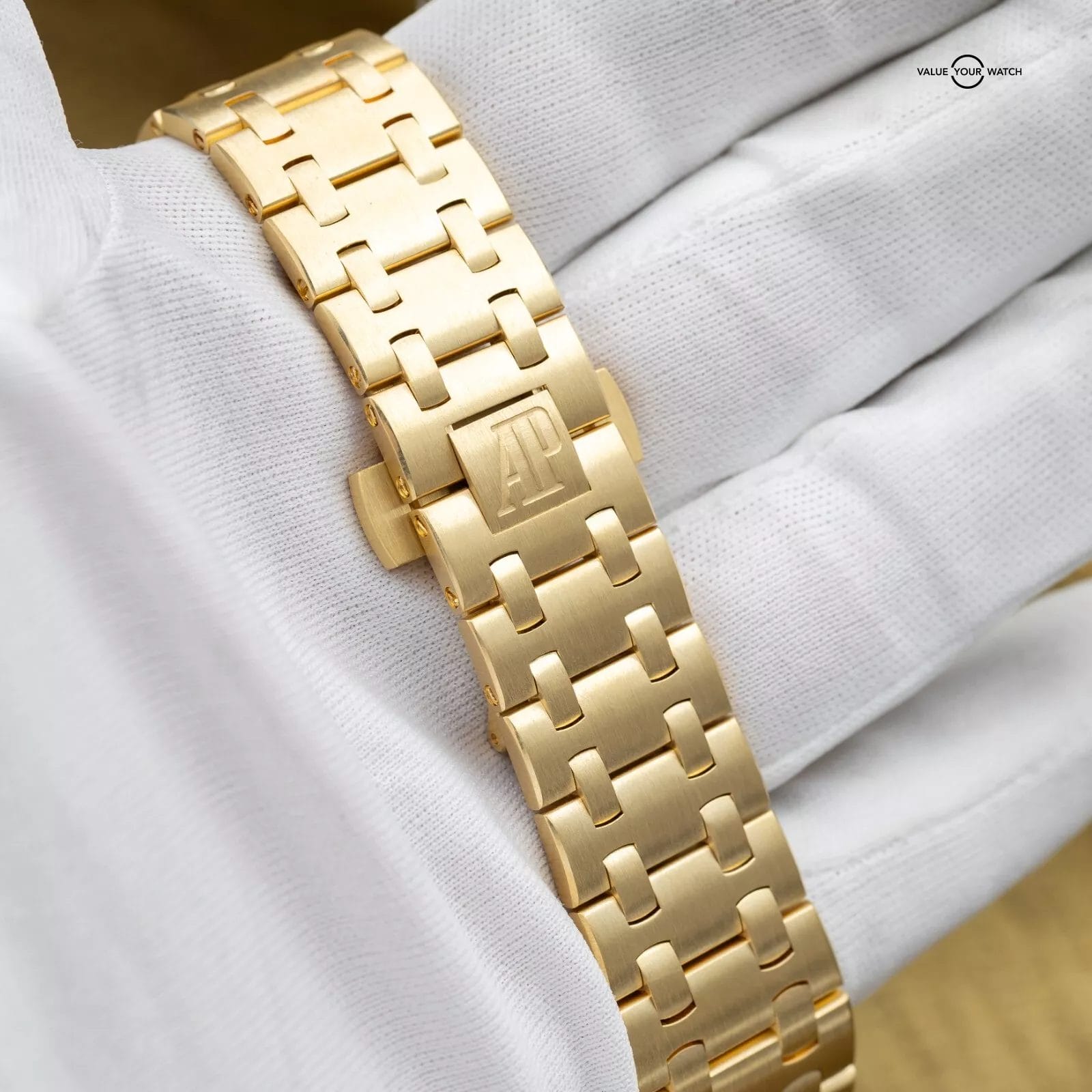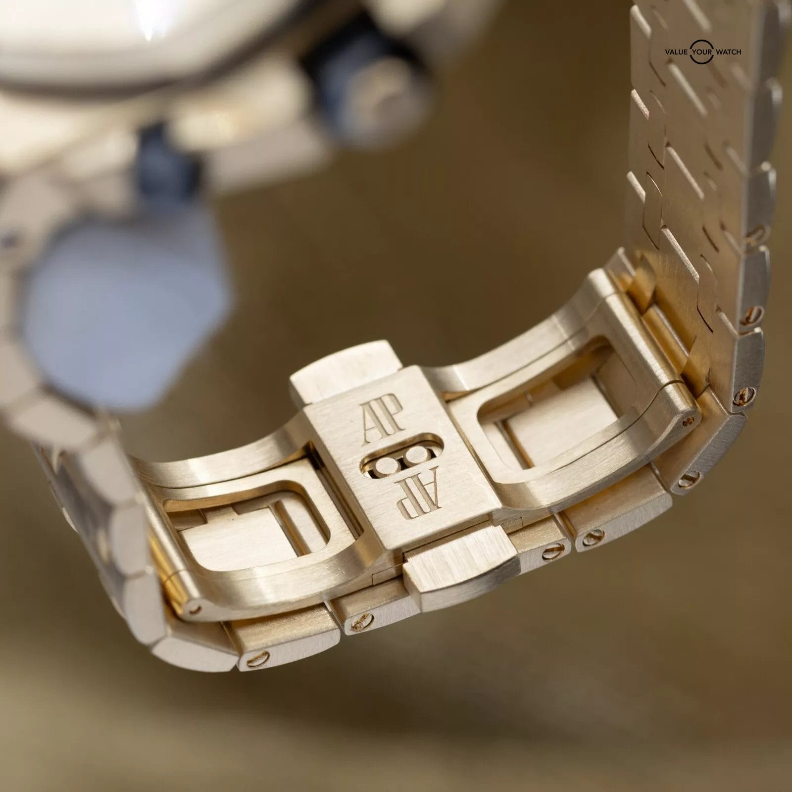 Included are full box and papers including the warranty card from 2019 and all original rose gold bracelet links. The case, crystal and bracelet are in outstanding condition. Watch is in complete working order and keeping great time, as you’d expect from the house of AP.