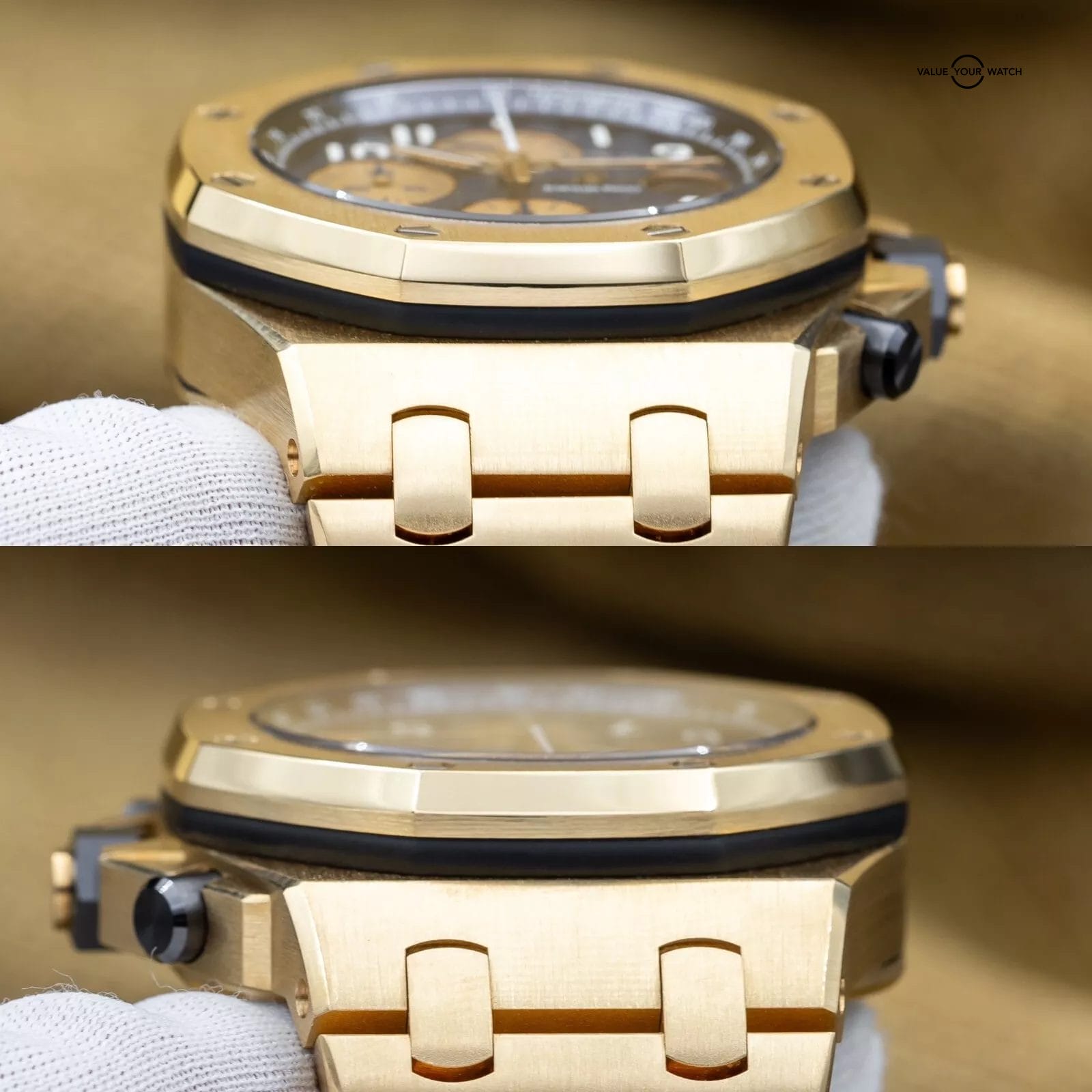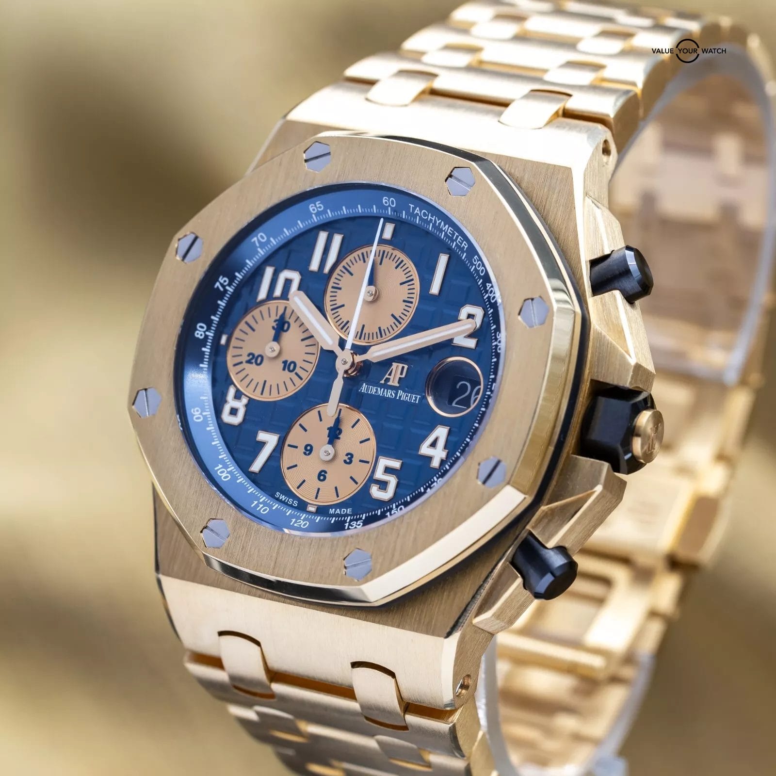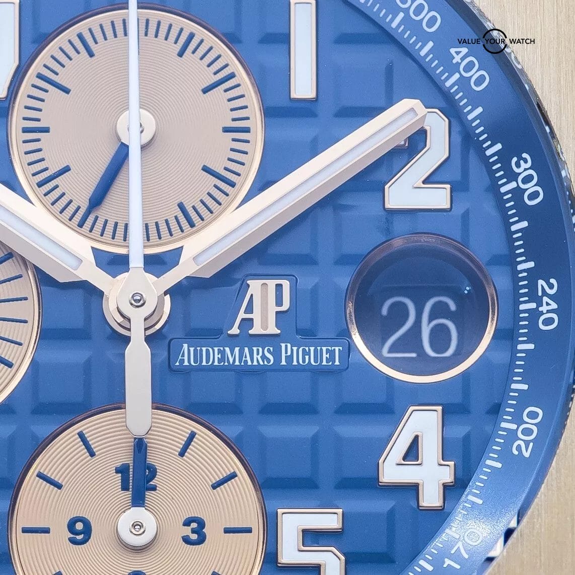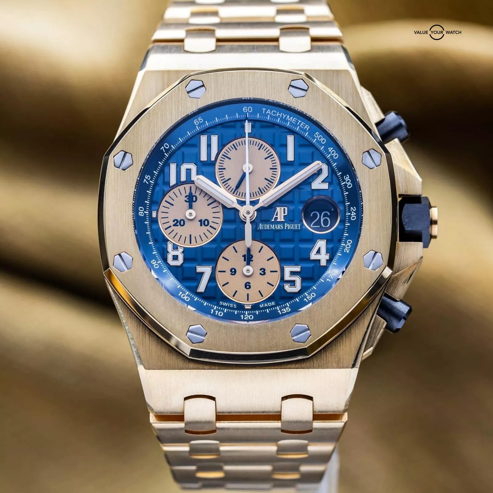 Included are full box and papers including the warranty card from 2019 and all original rose gold bracelet links. The case, crystal and bracelet are in outstanding condition. Watch is in complete working order and keeping great time, as you’d expect from the house of AP.