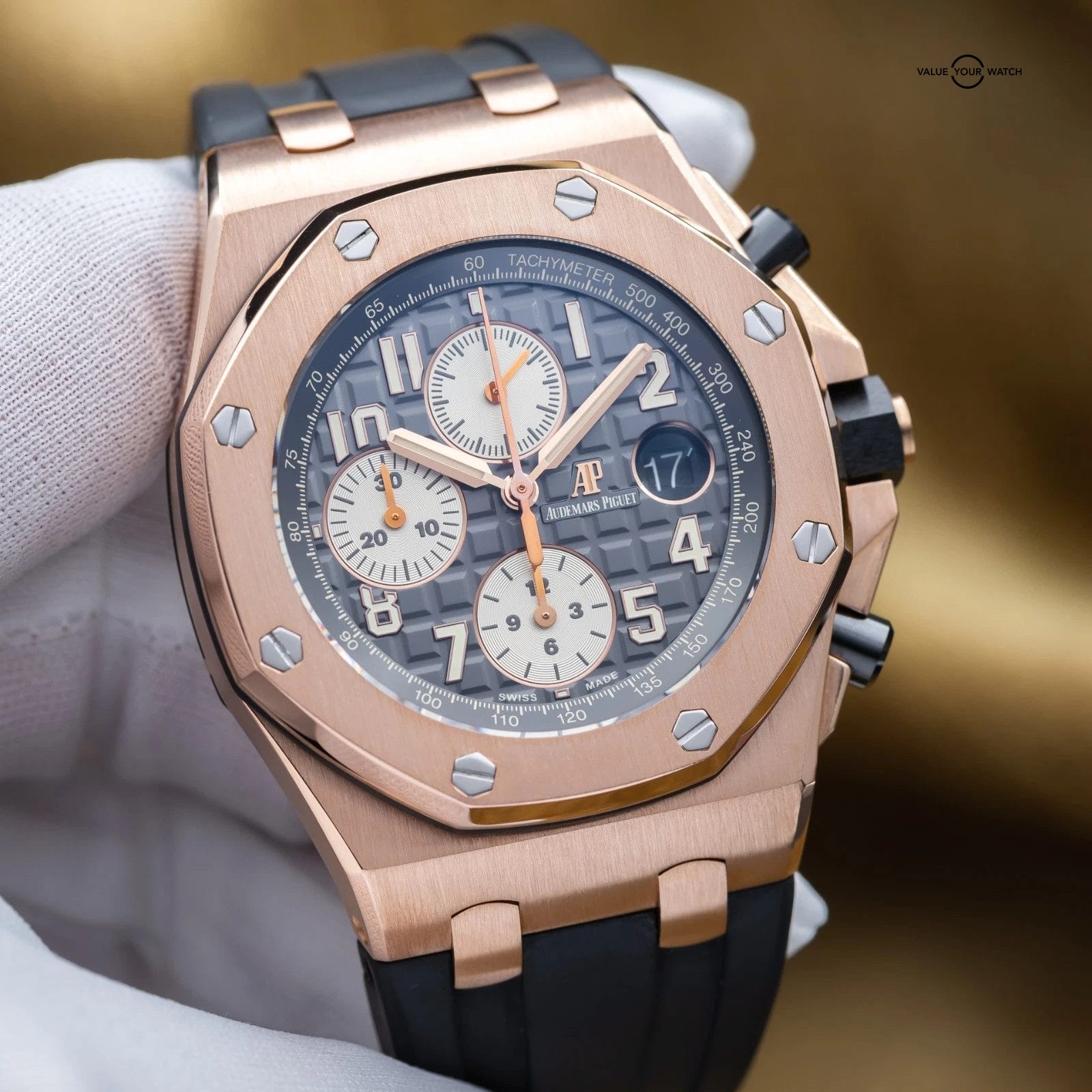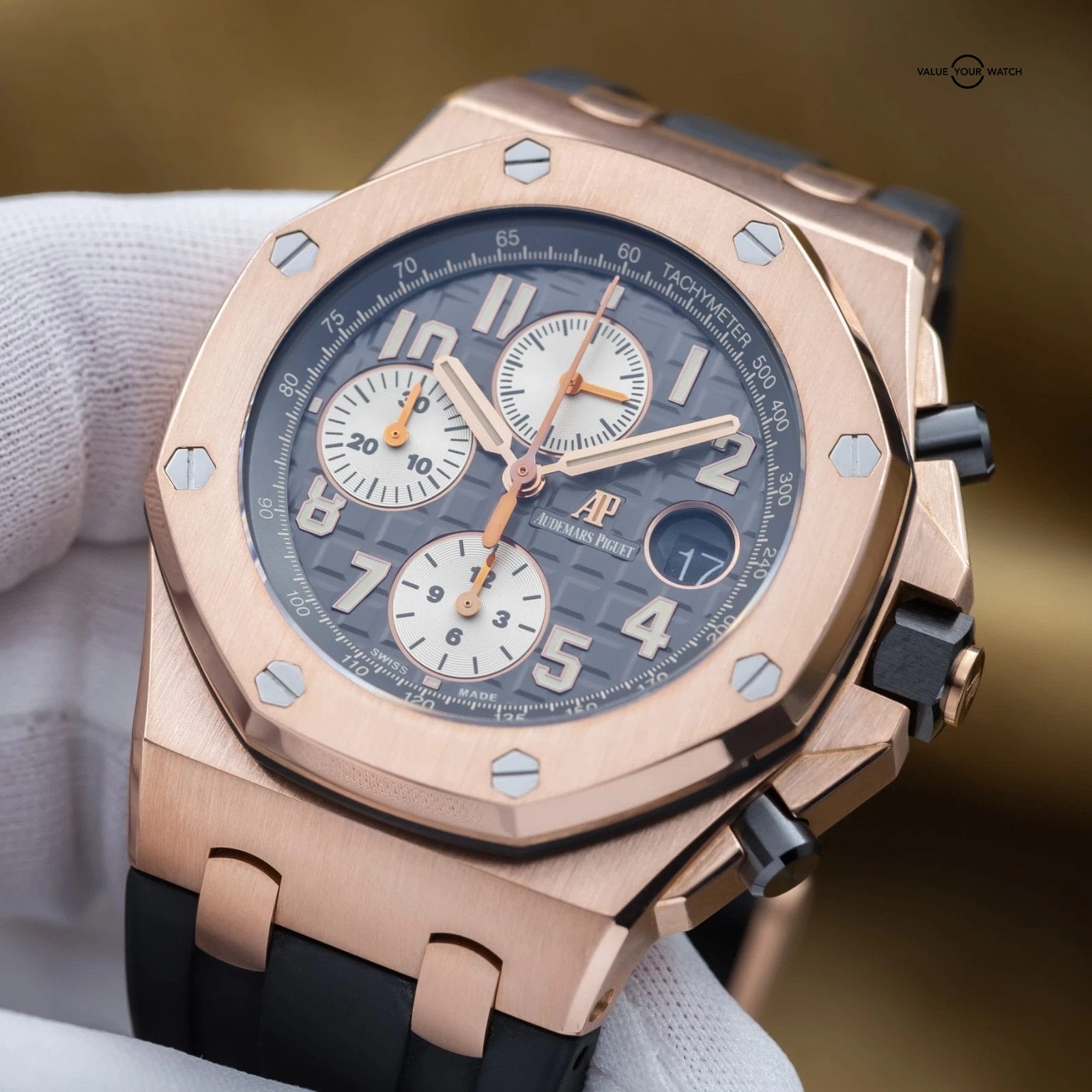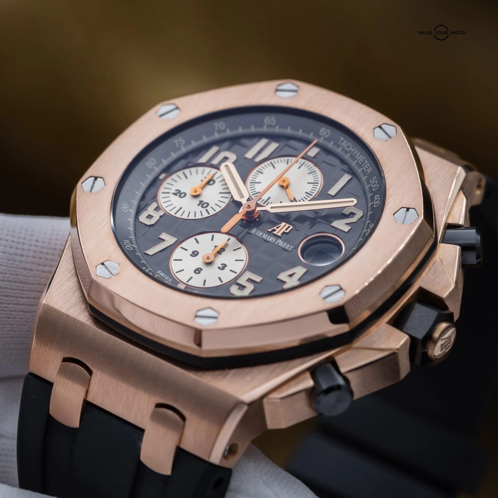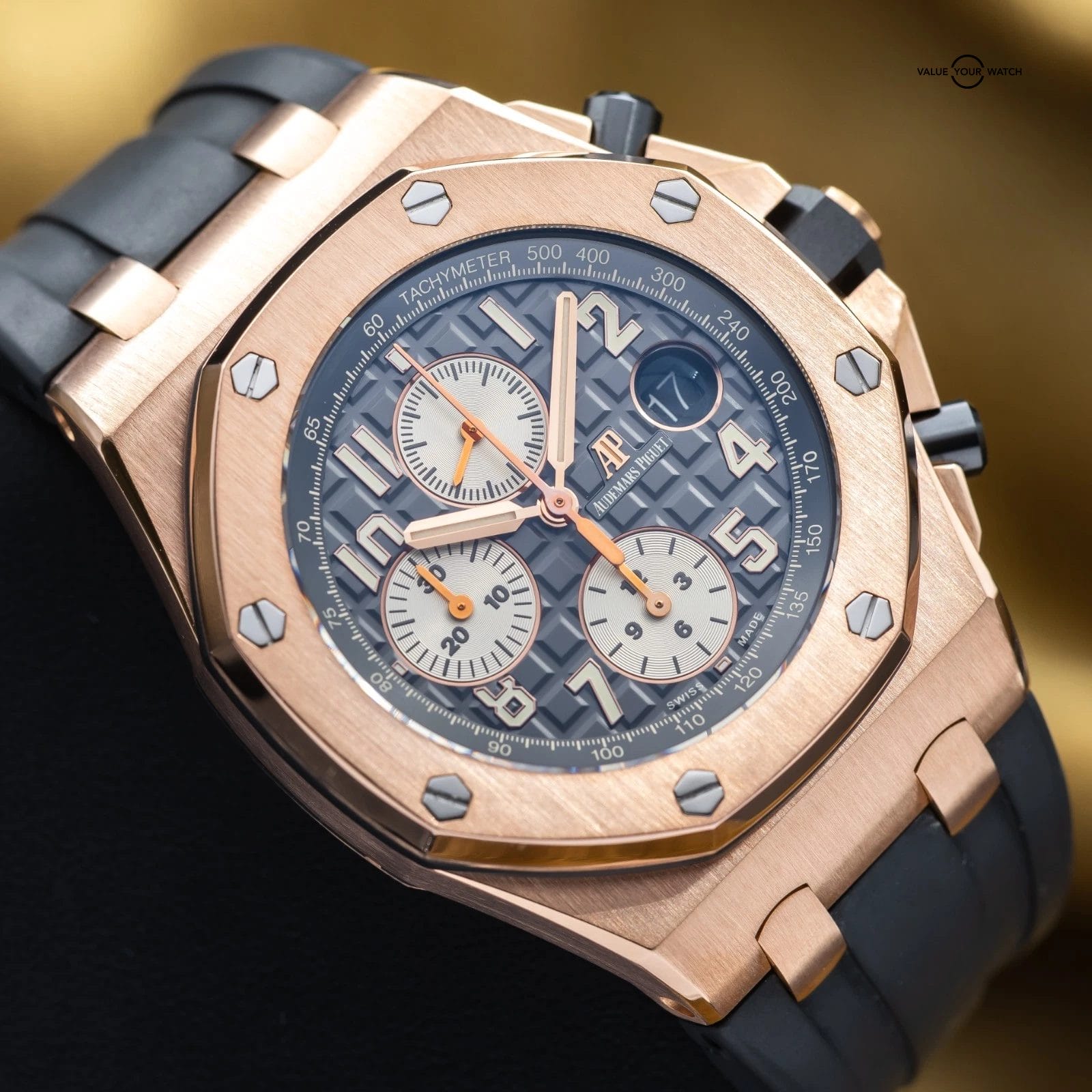 The Audemars Piguet Royal Oak Offshore sits apart within the modern luxury sports watch landscape, offering a more assertive and contemporary interpretation of the Royal Oak lineage. This 26470OR is executed in rose gold with a gray dial, paired with a rubber or leather strap, giving the Offshore a warmer and more refined presence than its steel counterparts. On the wrist, it delivers substantial feel and visual depth, functioning as a statement sports watch that remains grounded in daily wearability. Within a collection, it serves as a high-impact piece that introduces material contrast and modern design language. The combination of rose gold, gray dial, and leather or rubber strap creates a configuration that feels deliberate, balancing the Offshore’s inherent boldness with a more measured and versatile tone.