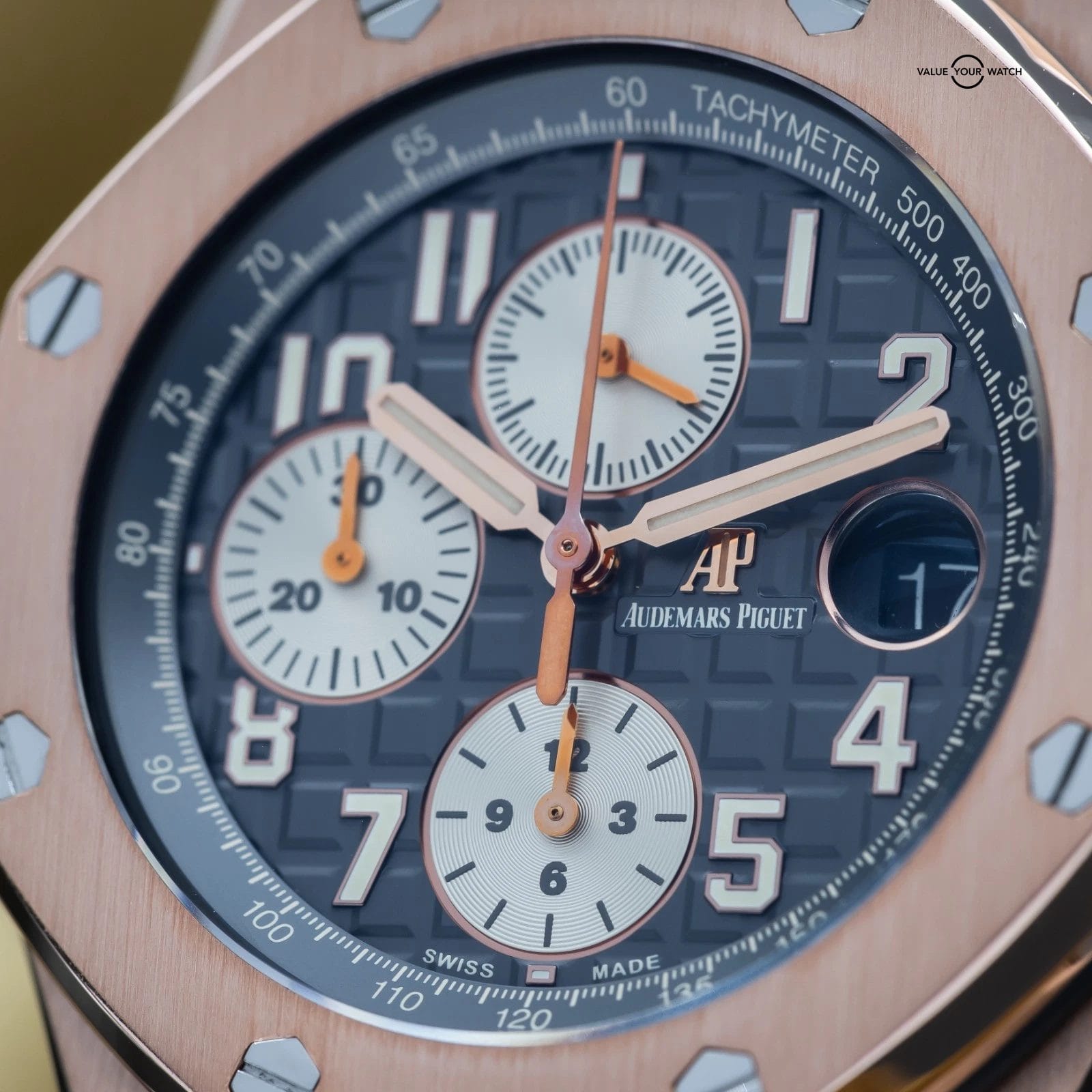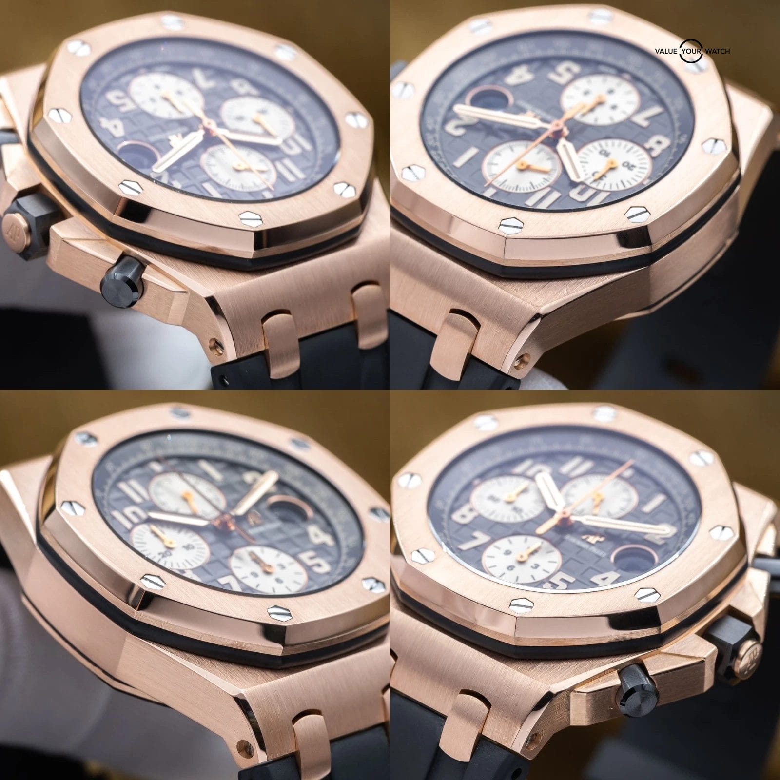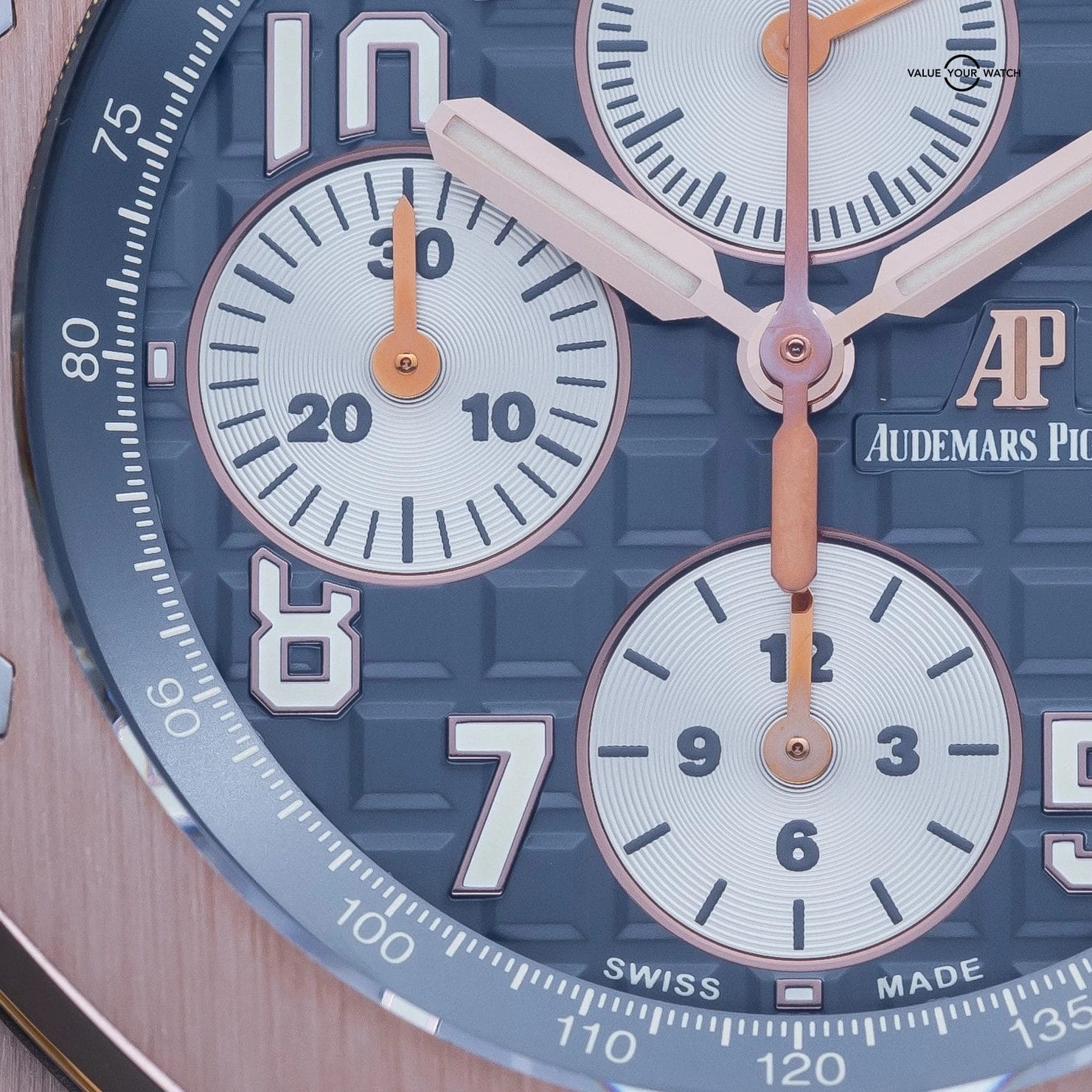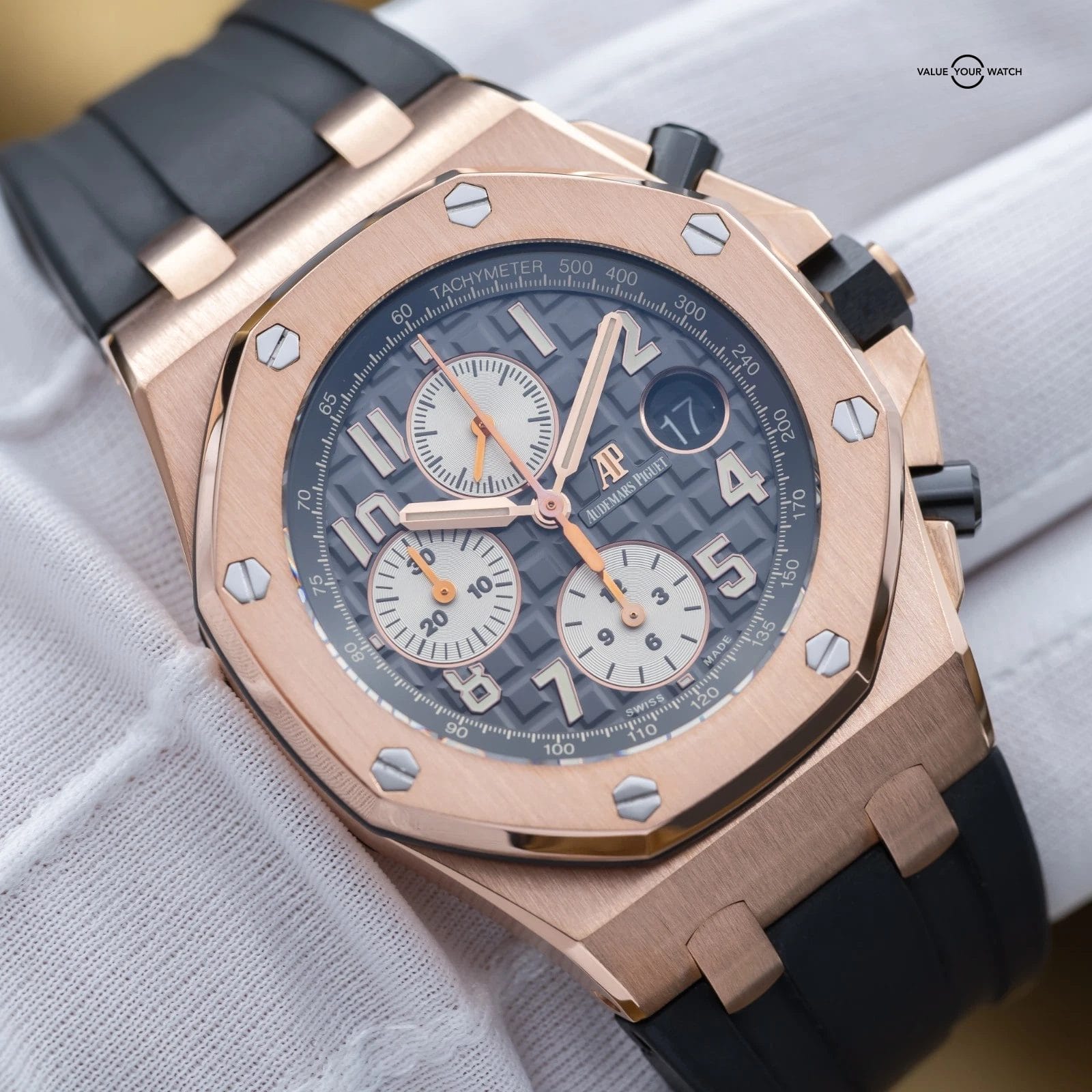 The Audemars Piguet Royal Oak Offshore sits apart within the modern luxury sports watch landscape, offering a more assertive and contemporary interpretation of the Royal Oak lineage. This 26470OR is executed in rose gold with a gray dial, paired with a rubber or leather strap, giving the Offshore a warmer and more refined presence than its steel counterparts. On the wrist, it delivers substantial feel and visual depth, functioning as a statement sports watch that remains grounded in daily wearability. Within a collection, it serves as a high-impact piece that introduces material contrast and modern design language. The combination of rose gold, gray dial, and leather or rubber strap creates a configuration that feels deliberate, balancing the Offshore’s inherent boldness with a more measured and versatile tone.
