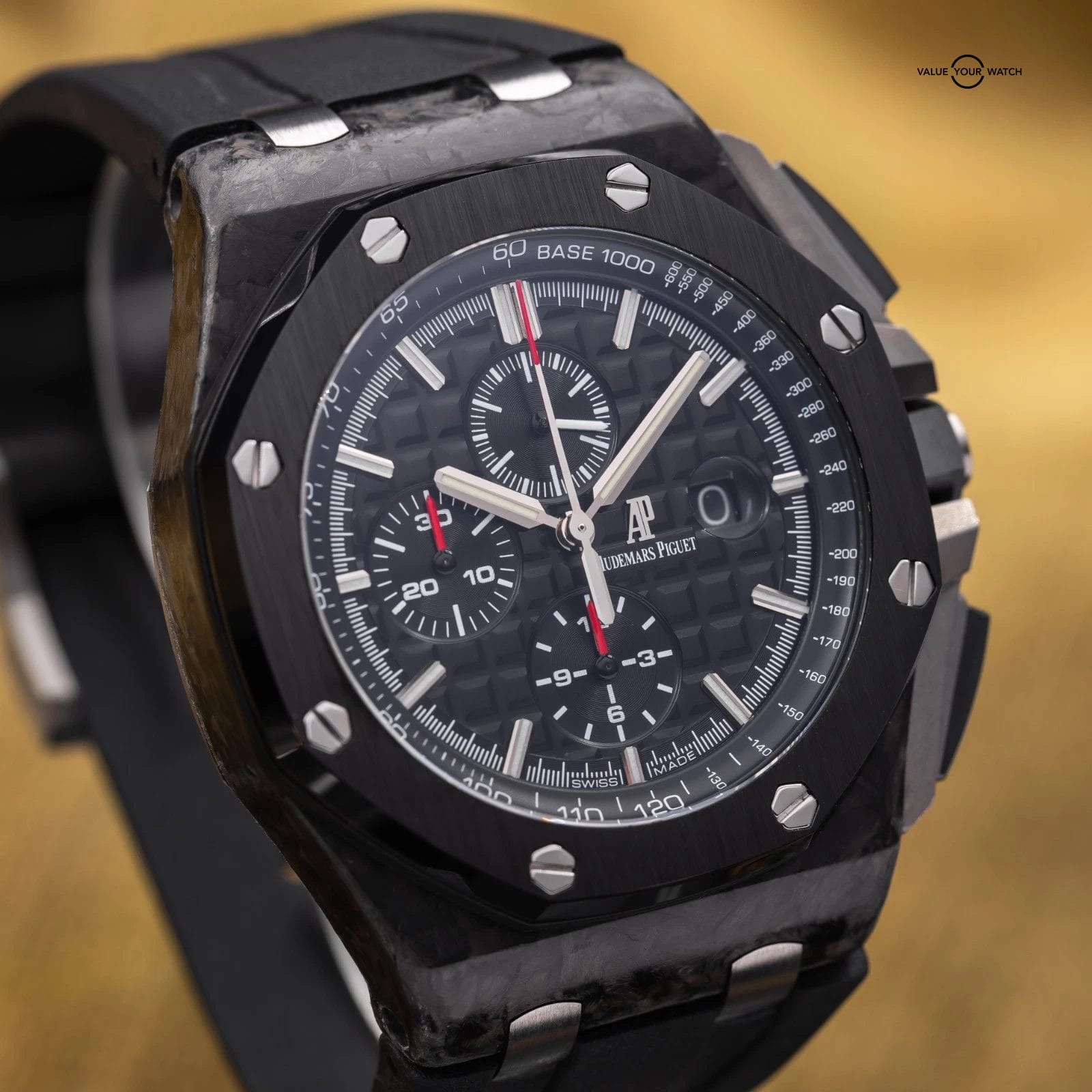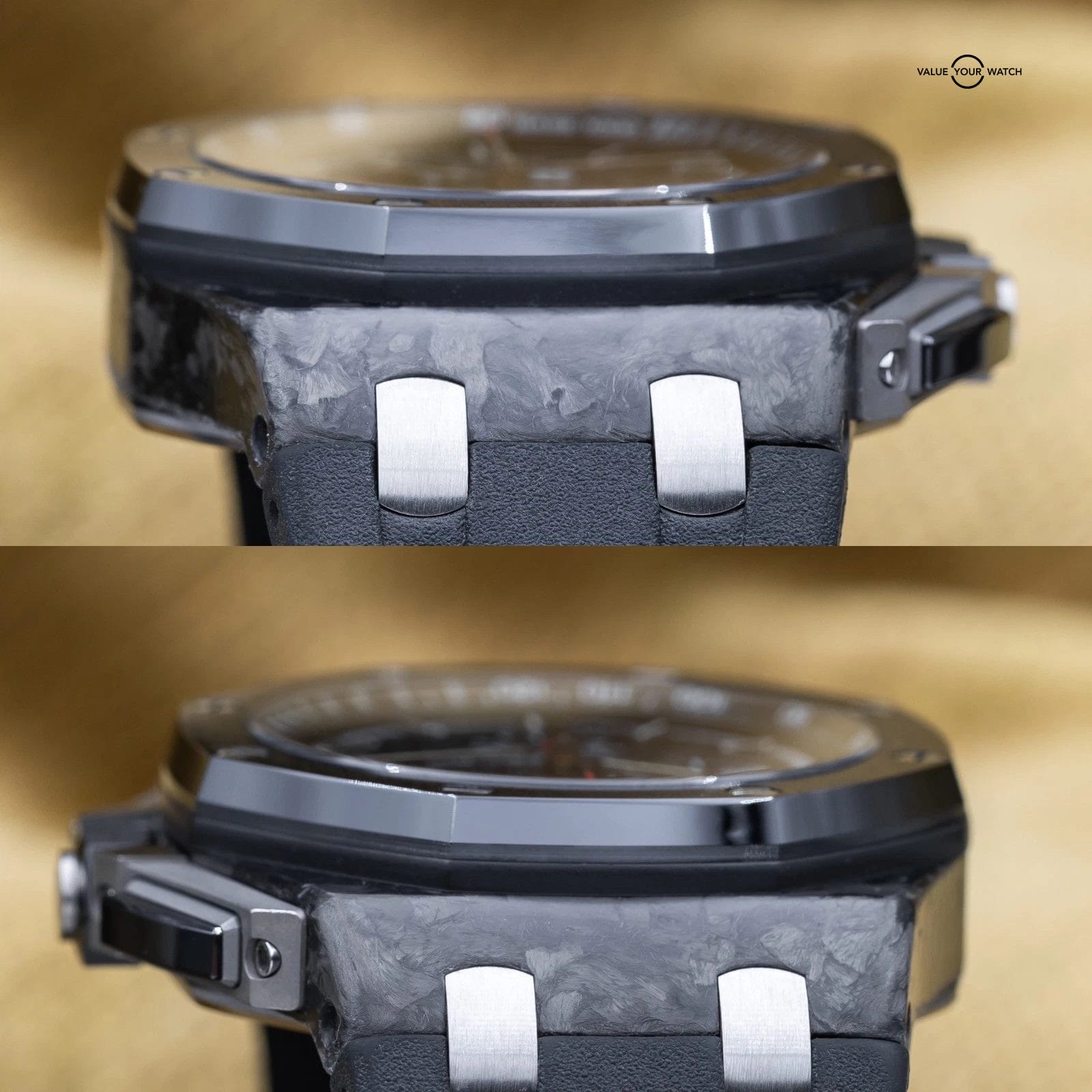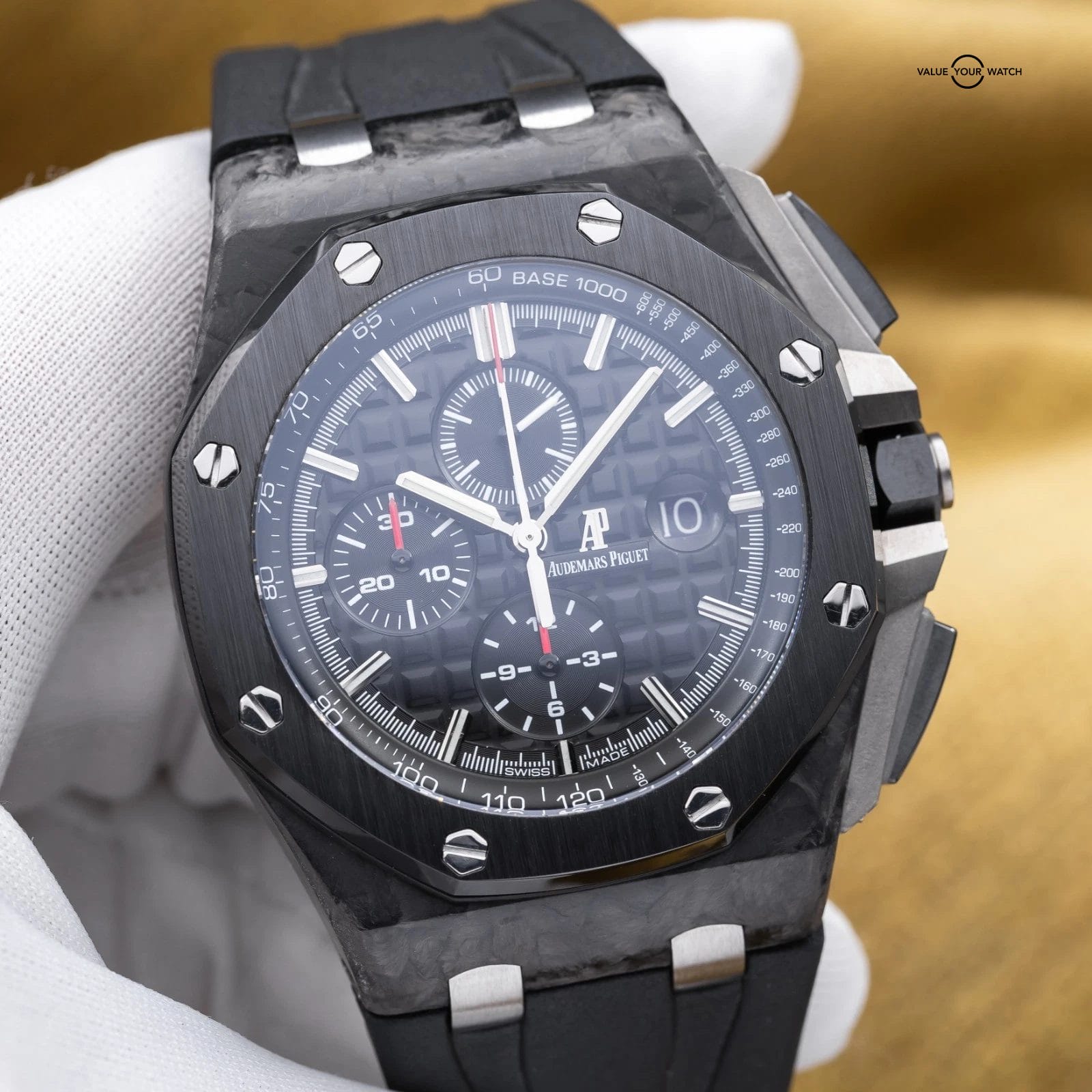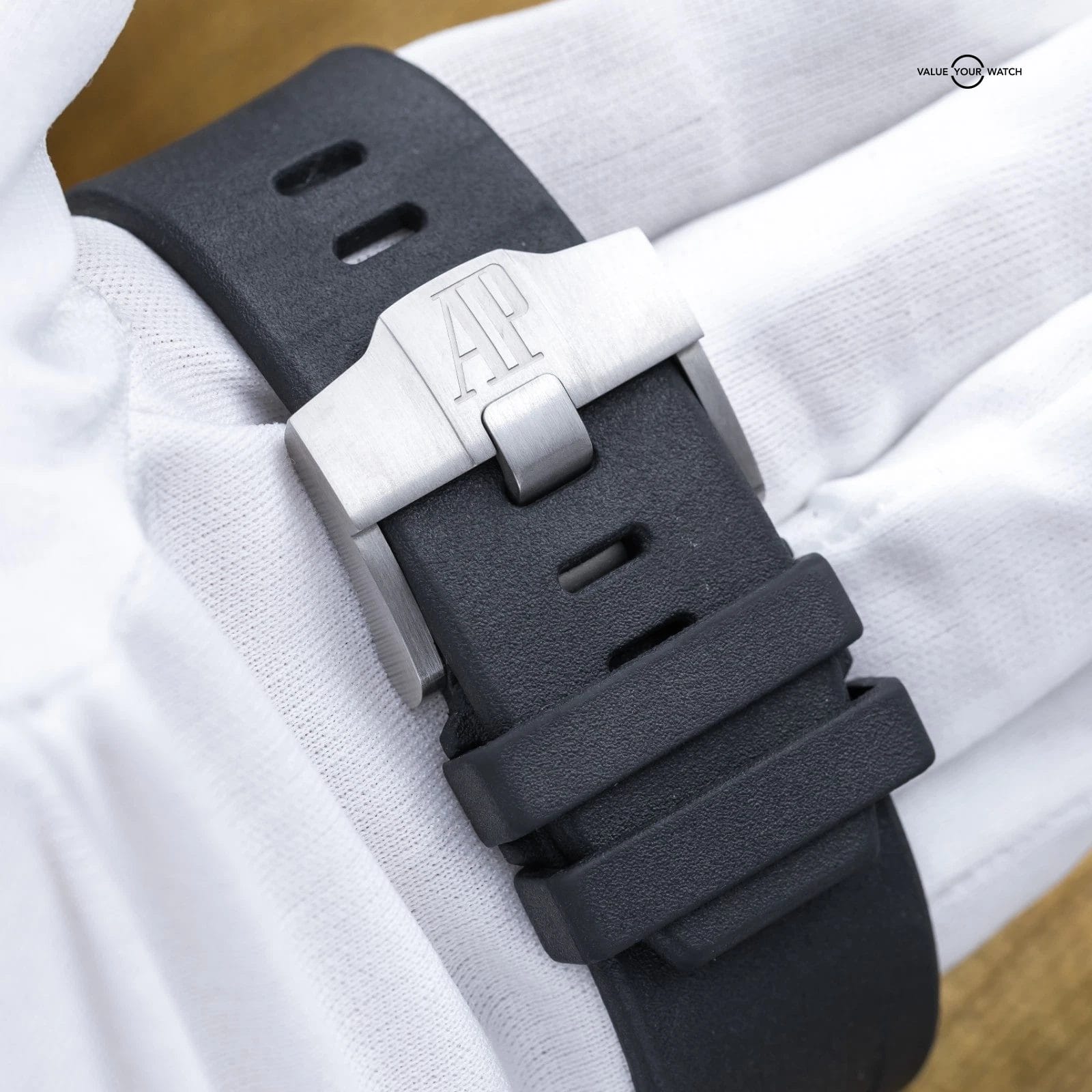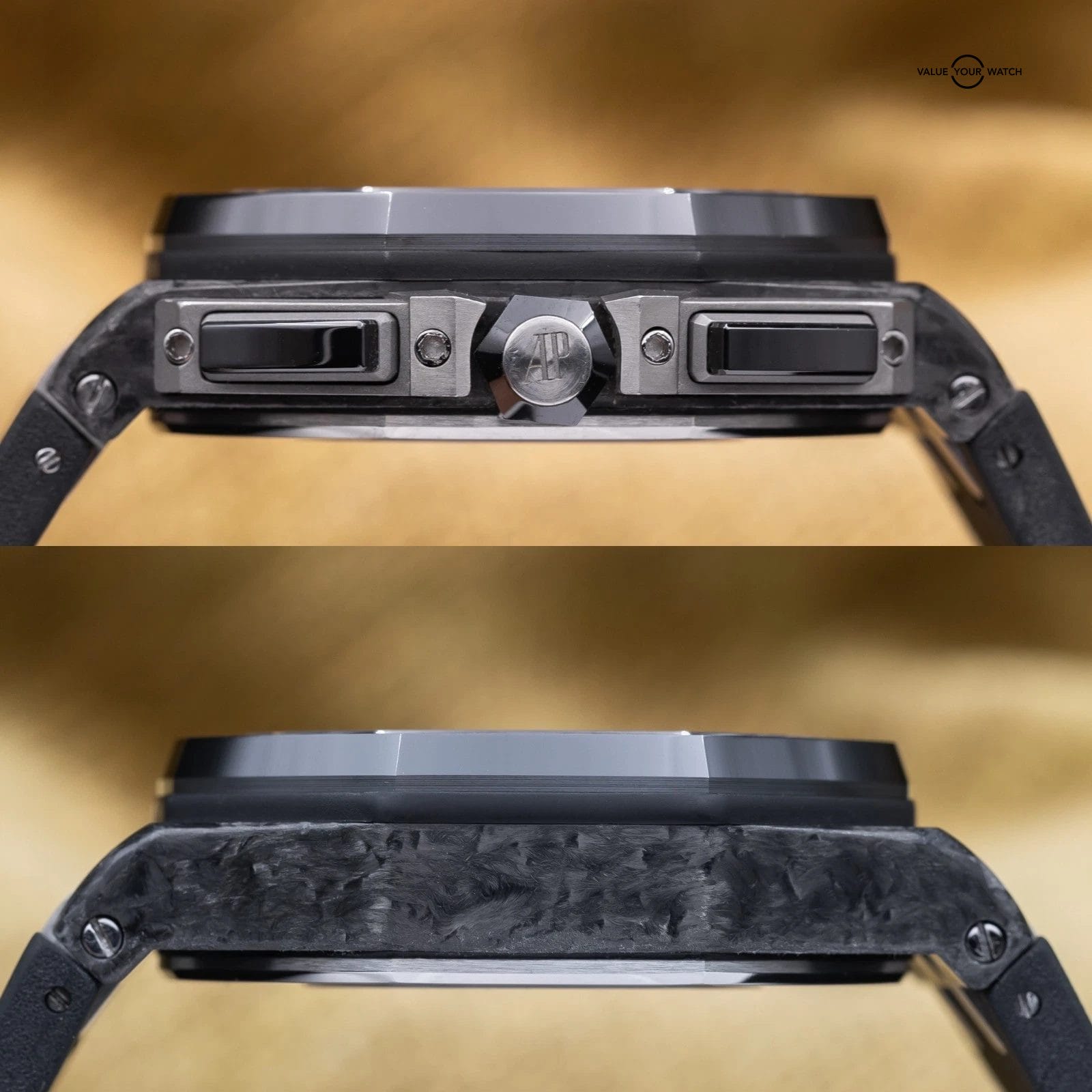 This 44mm AP Offshore has a carbon fiber case with the ceramic bezel…probably the coolest combo they’ve done! AP doesn’t make the carbon cases anymore, so these are getting harder and harder to find on the market. This one just looks badass, both up close and from a far…and even from the back with the open case back to view the gorgeous decorated movement that AP does best! The details in the carbon fiber against the all-black and the titanium just looks incredible! If you want a conversation piece, are a car guy, or just want to let it be known you’re a fan of the amazing watches AP makes, this piece is for you!