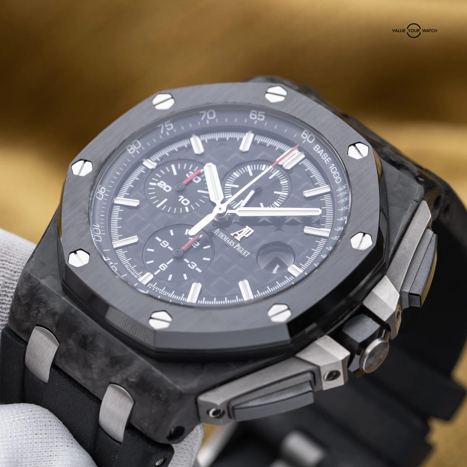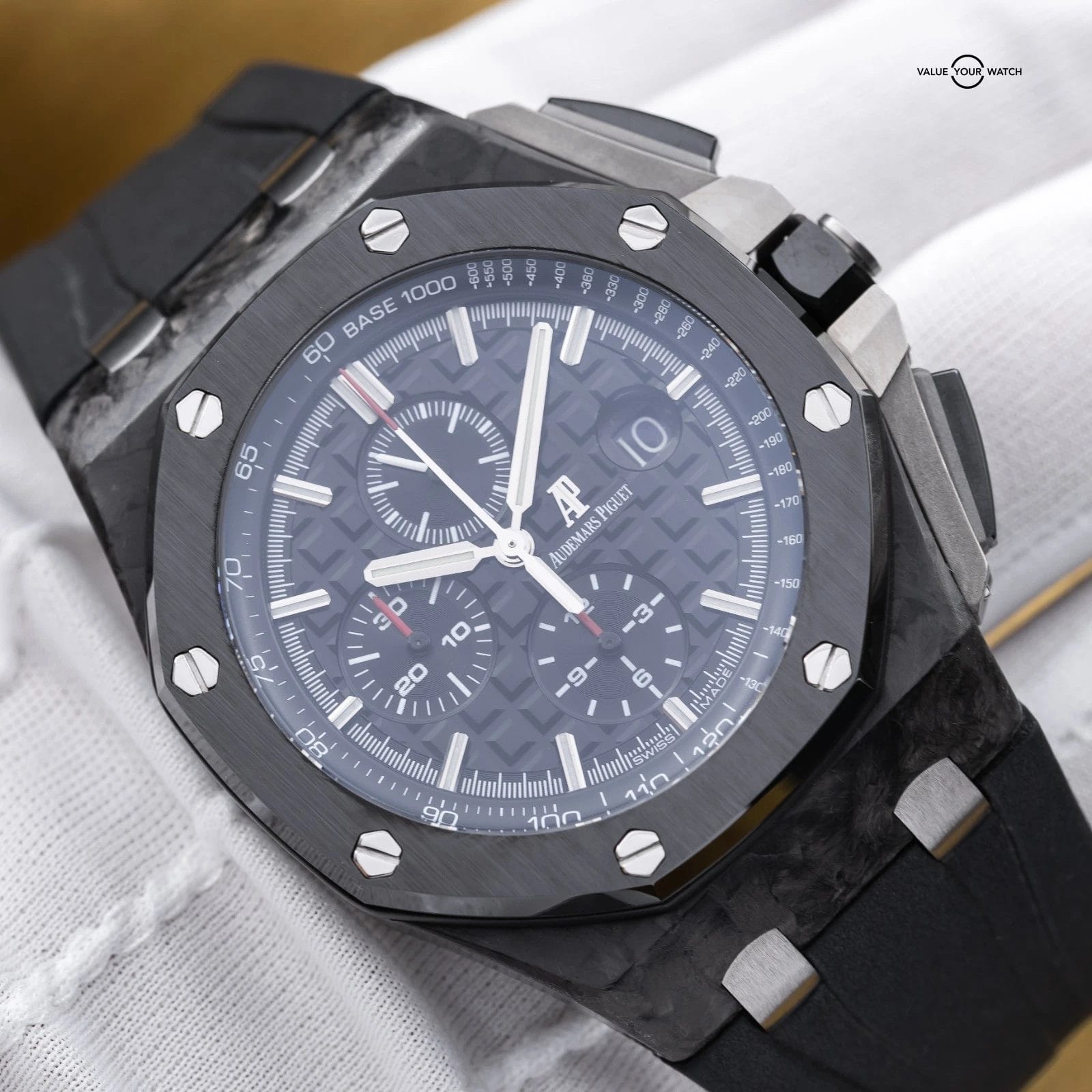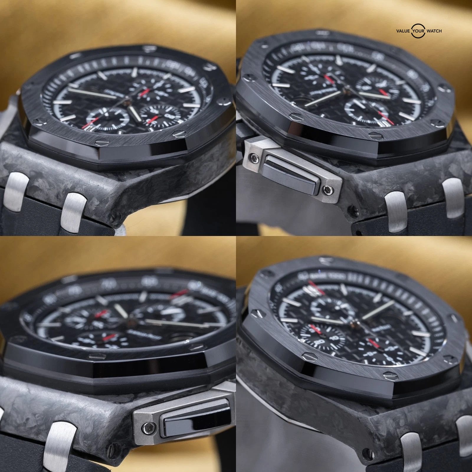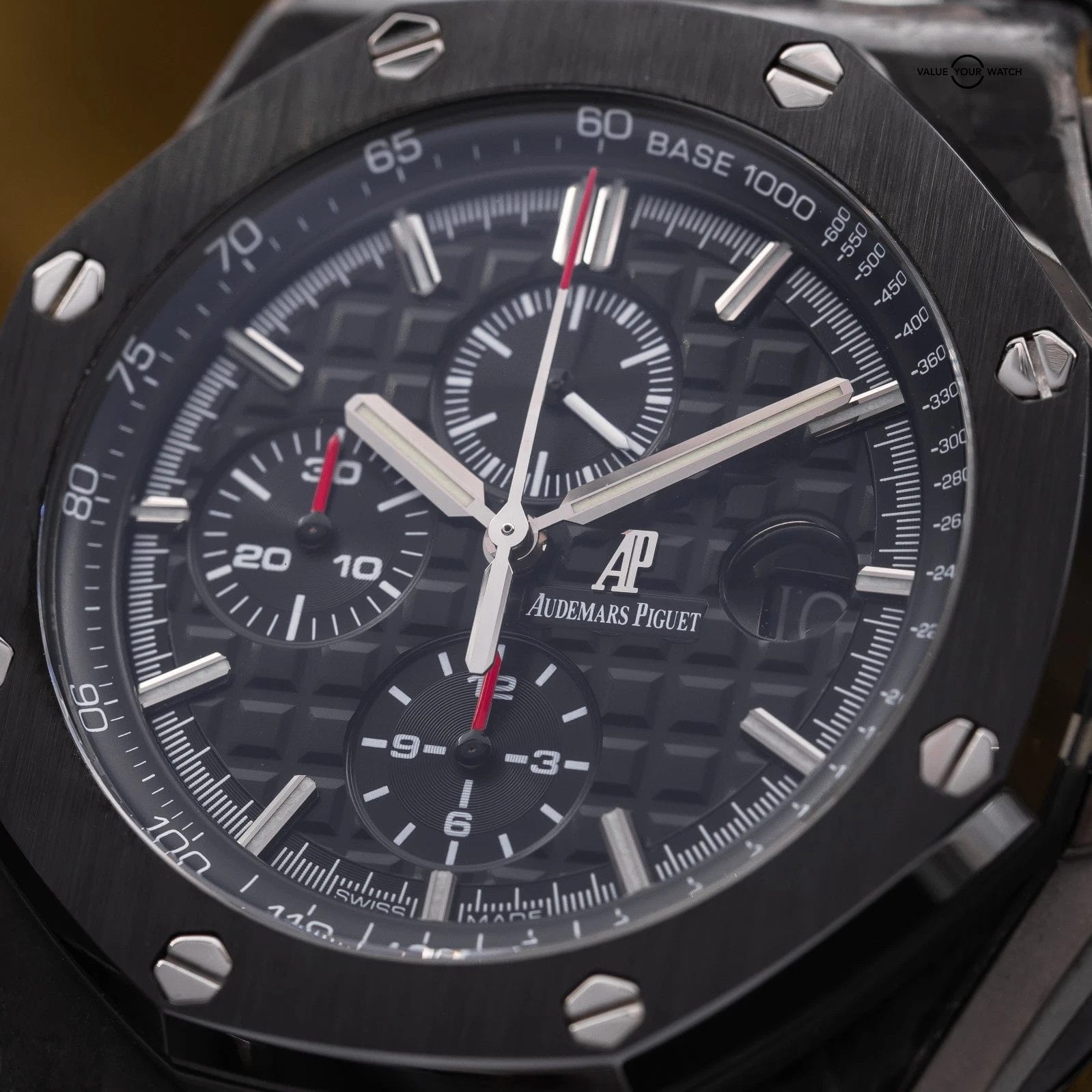 This 44mm AP Offshore has a carbon fiber case with the ceramic bezel…probably the coolest combo they’ve done! AP doesn’t make the carbon cases anymore, so these are getting harder and harder to find on the market. This one just looks badass, both up close and from a far…and even from the back with the open case back to view the gorgeous decorated movement that AP does best! The details in the carbon fiber against the all-black and the titanium just looks incredible! If you want a conversation piece, are a car guy, or just want to let it be known you’re a fan of the amazing watches AP makes, this piece is for you!
