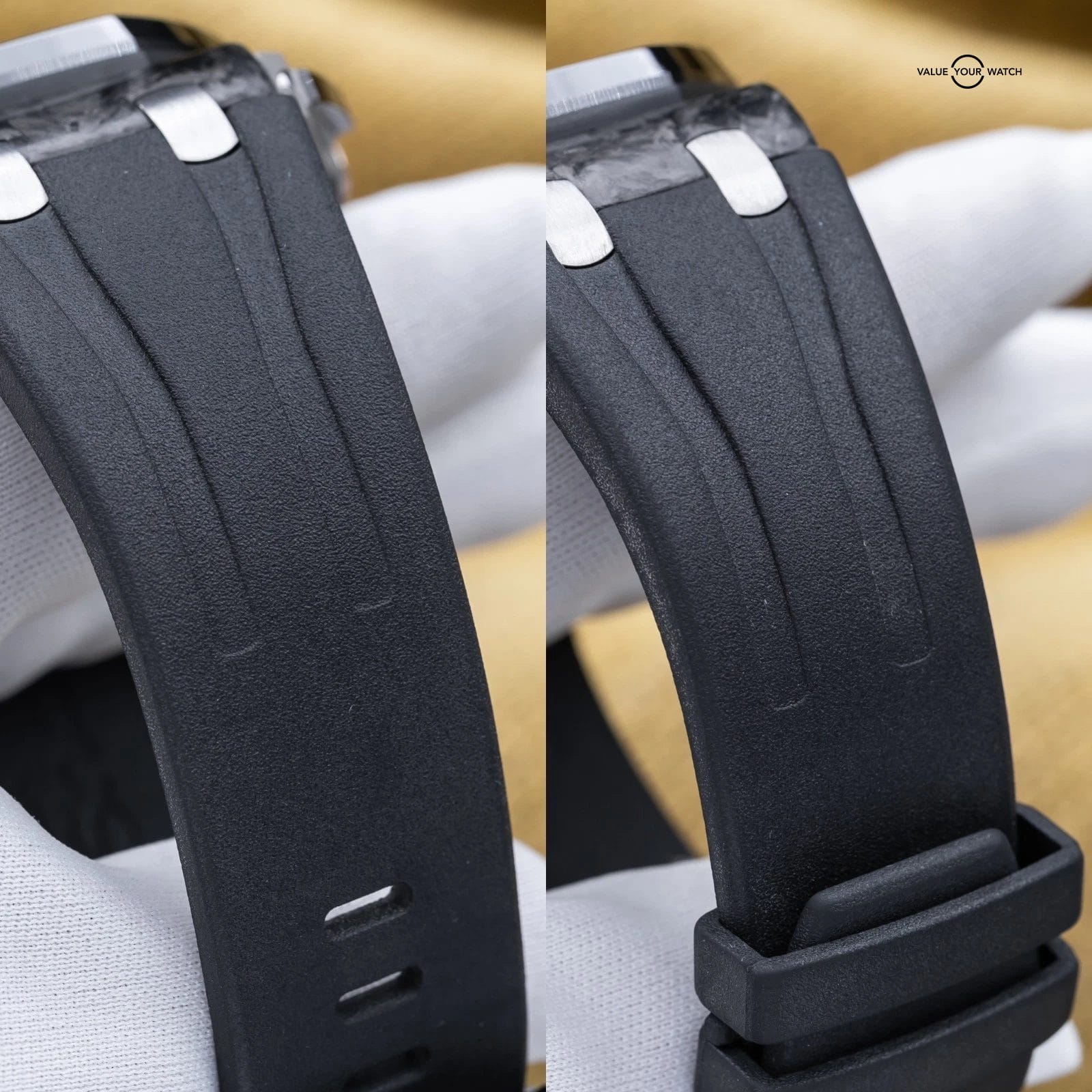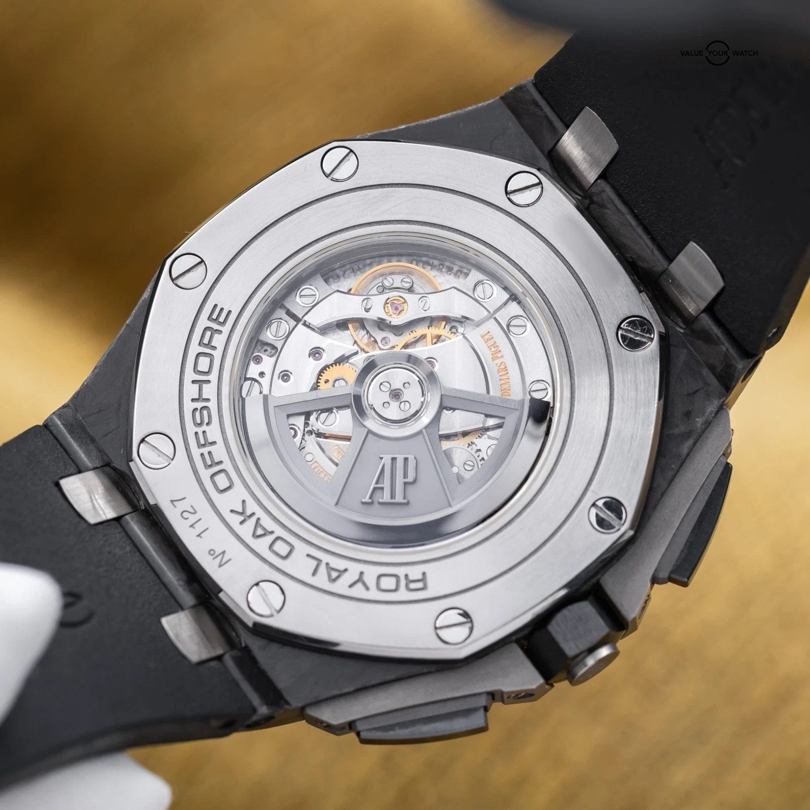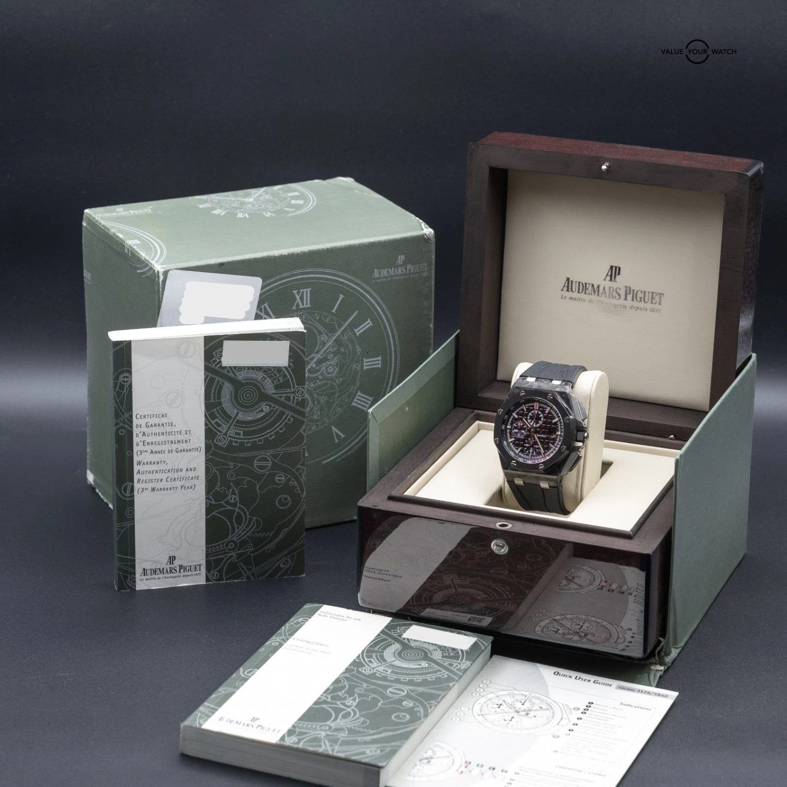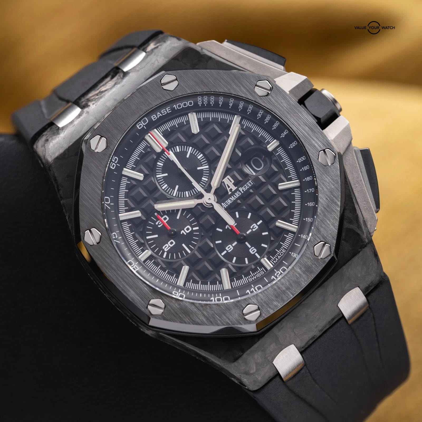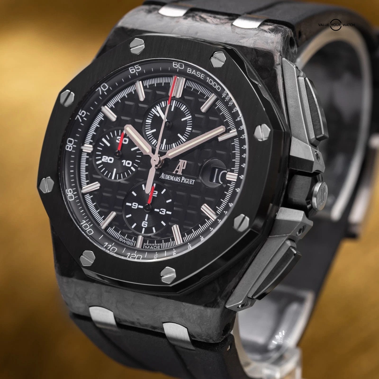 This 44mm AP Offshore has a carbon fiber case with the ceramic bezel…probably the coolest combo they’ve done! AP doesn’t make the carbon cases anymore, so these are getting harder and harder to find on the market. This one just looks badass, both up close and from a far…and even from the back with the open case back to view the gorgeous decorated movement that AP does best! The details in the carbon fiber against the all-black and the titanium just looks incredible! If you want a conversation piece, are a car guy, or just want to let it be known you’re a fan of the amazing watches AP makes, this piece is for you!