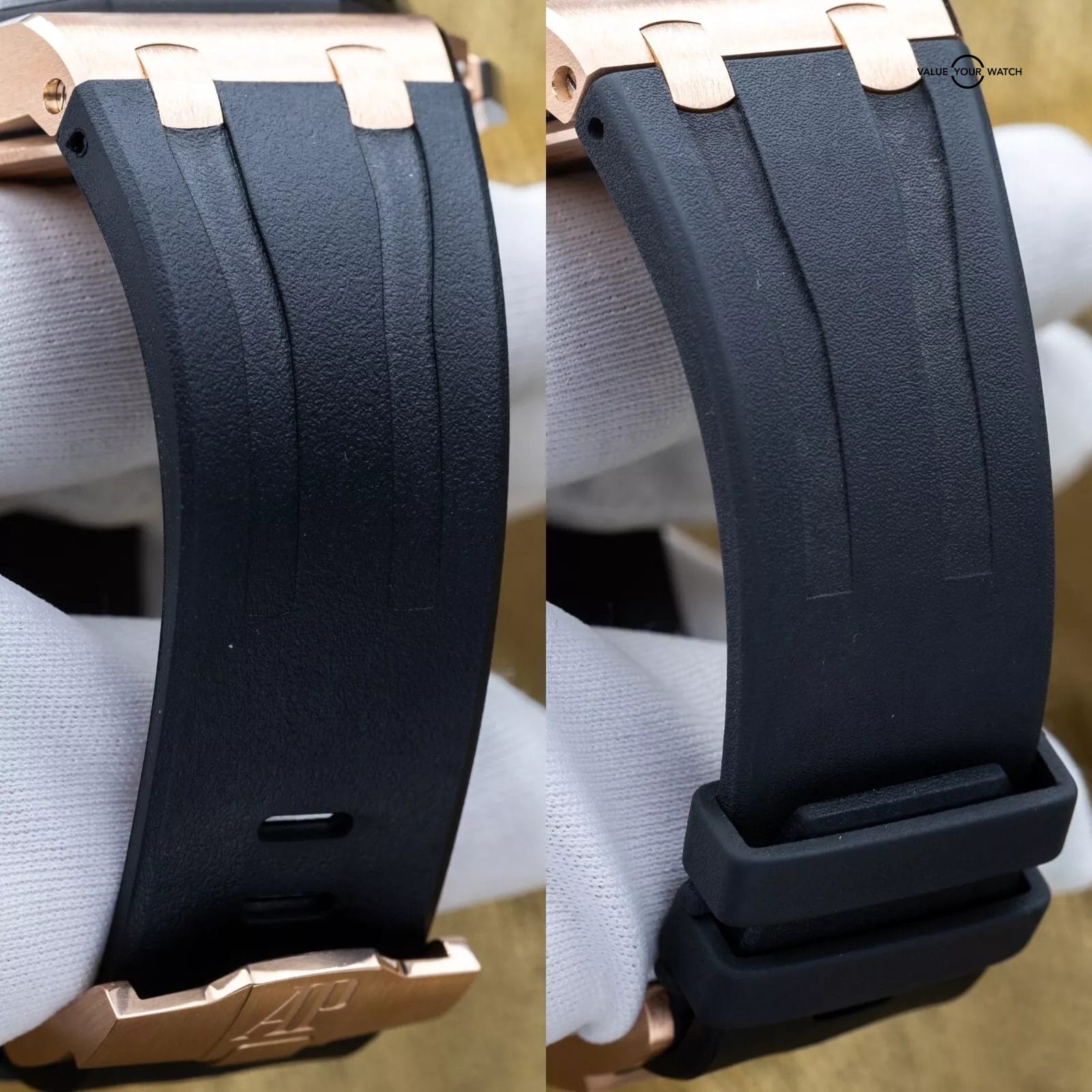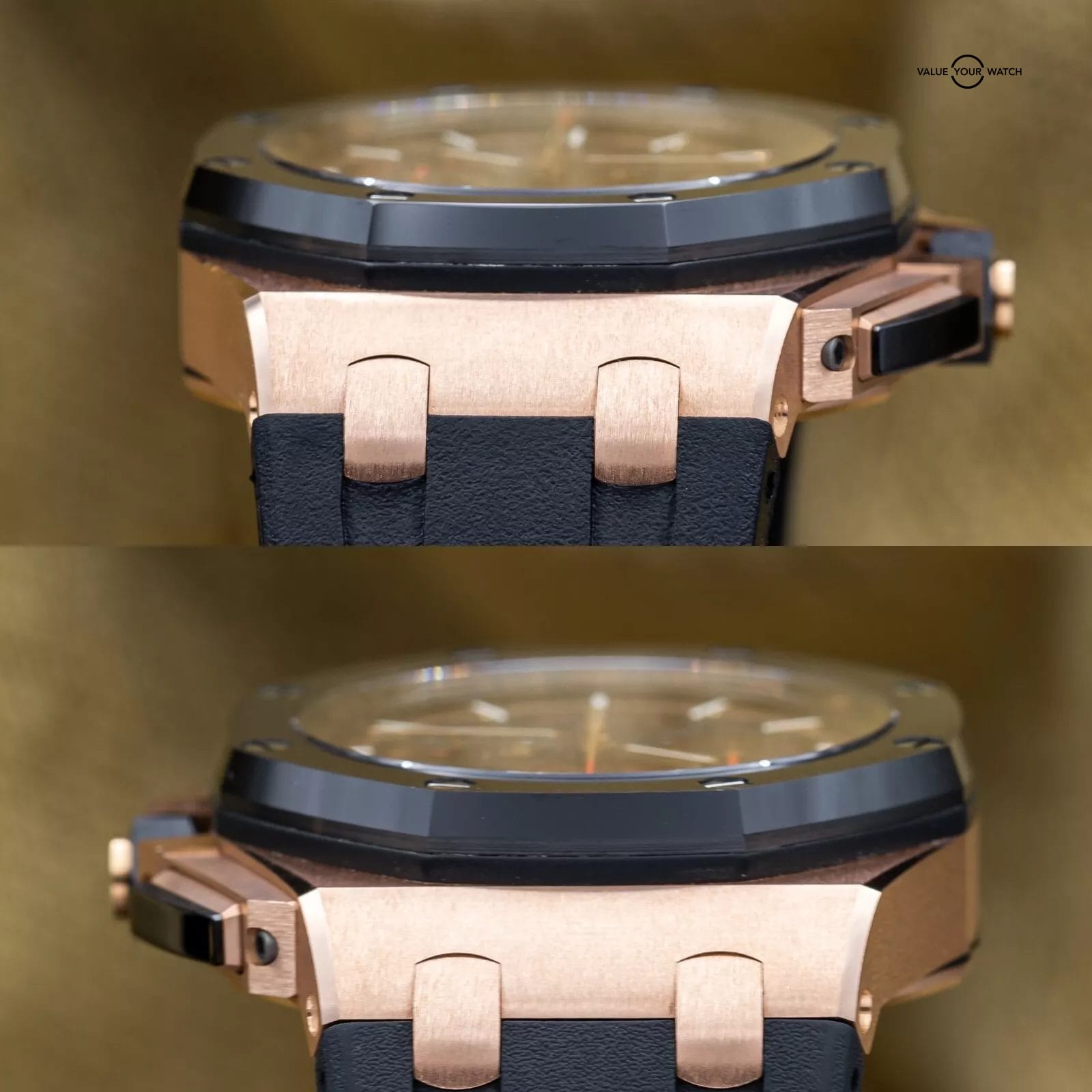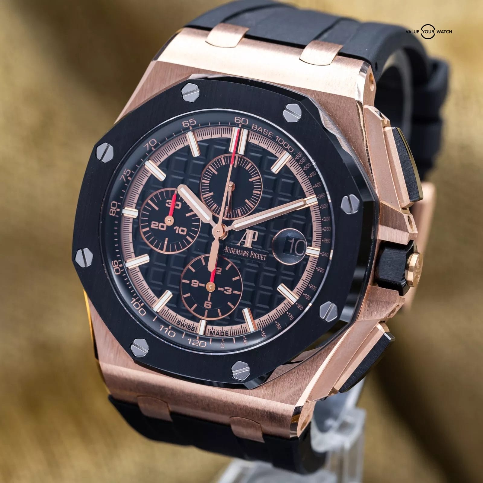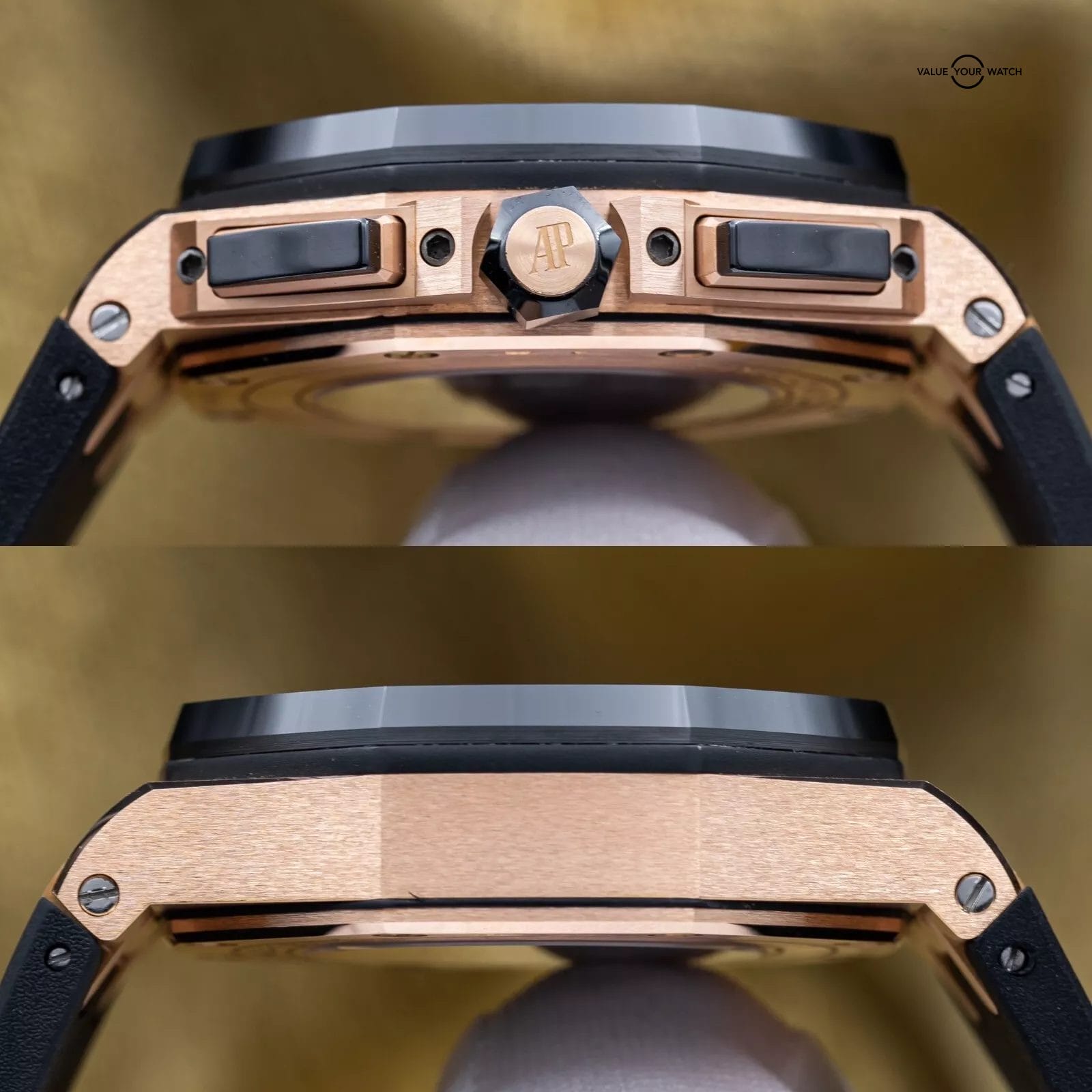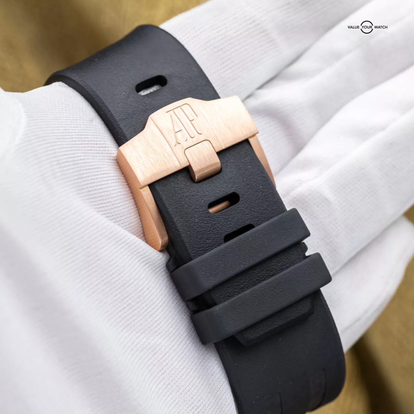 Up for sale is this AP Royal Oak Offshore chronograph 44mm. The combination of the rose gold case, ceramic bezel, rubber strap, and the Mega Tapisserie dial make for a masterpiece and grail offshore. If you don’t have a gold AP this is a great one to start with! And let’s not forget, all of this wraps around the beautiful AP 3126 movement that you can enjoy through the open case back…you can’t beat this one. Grab it while you can!