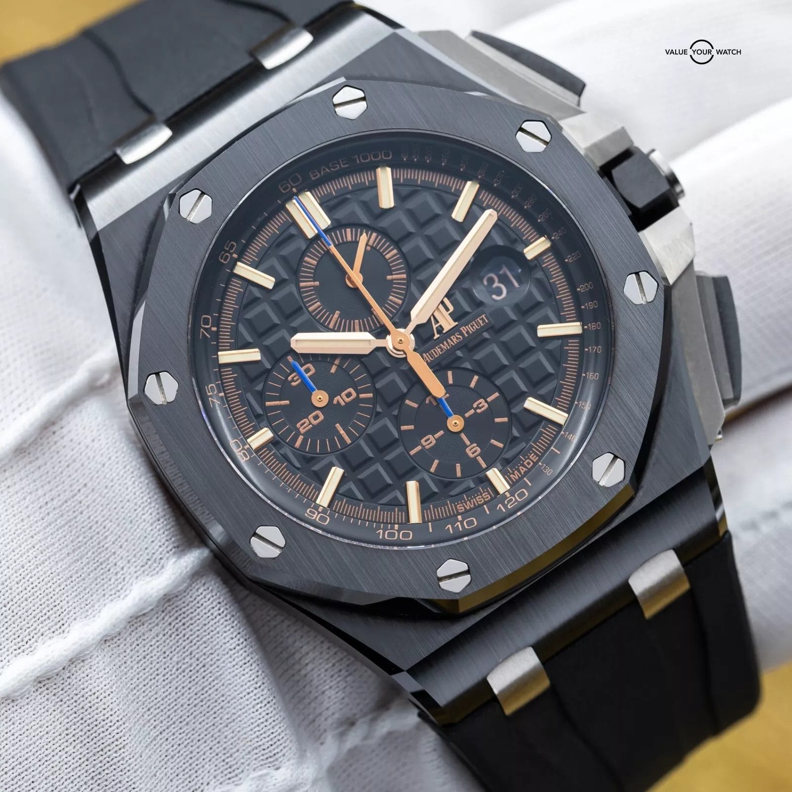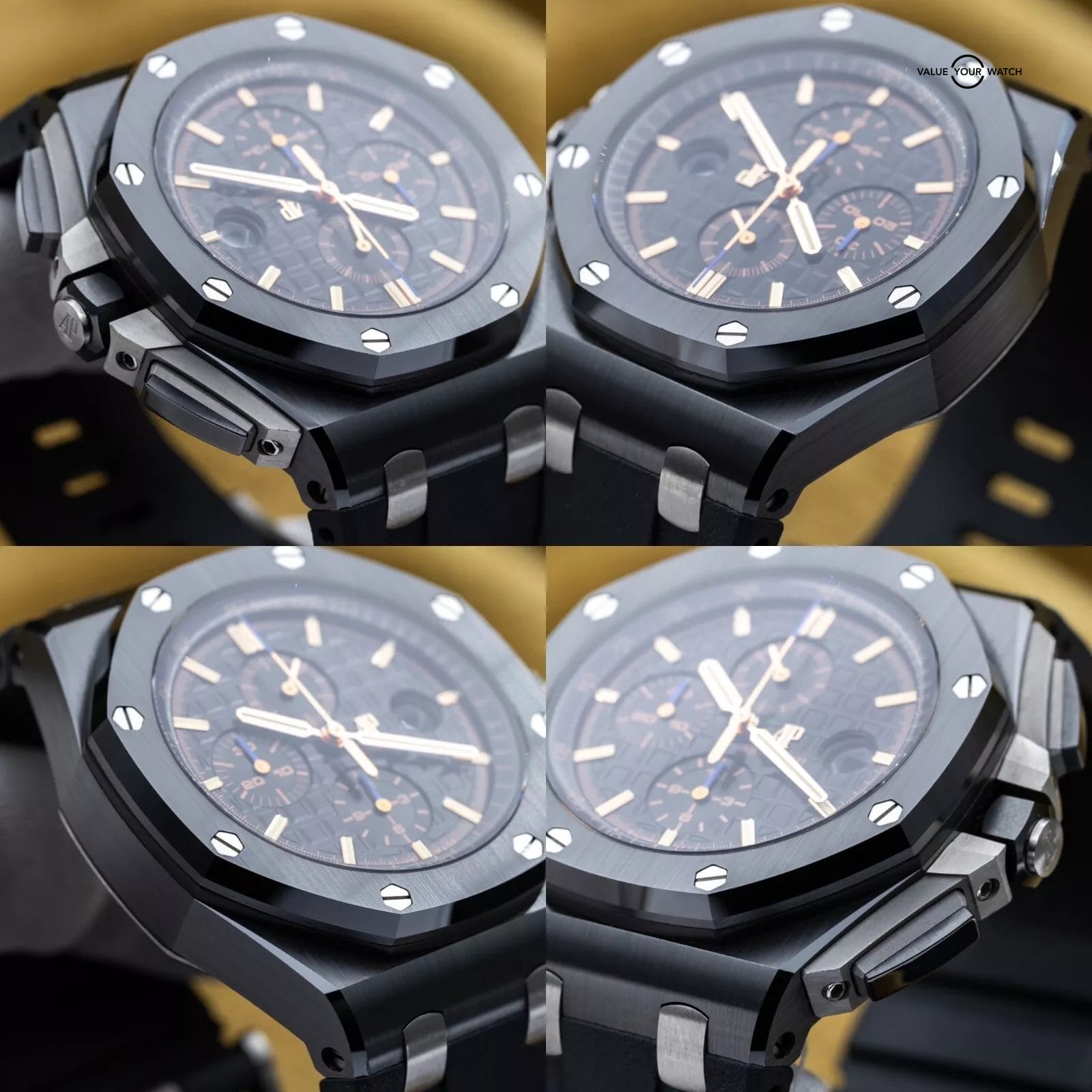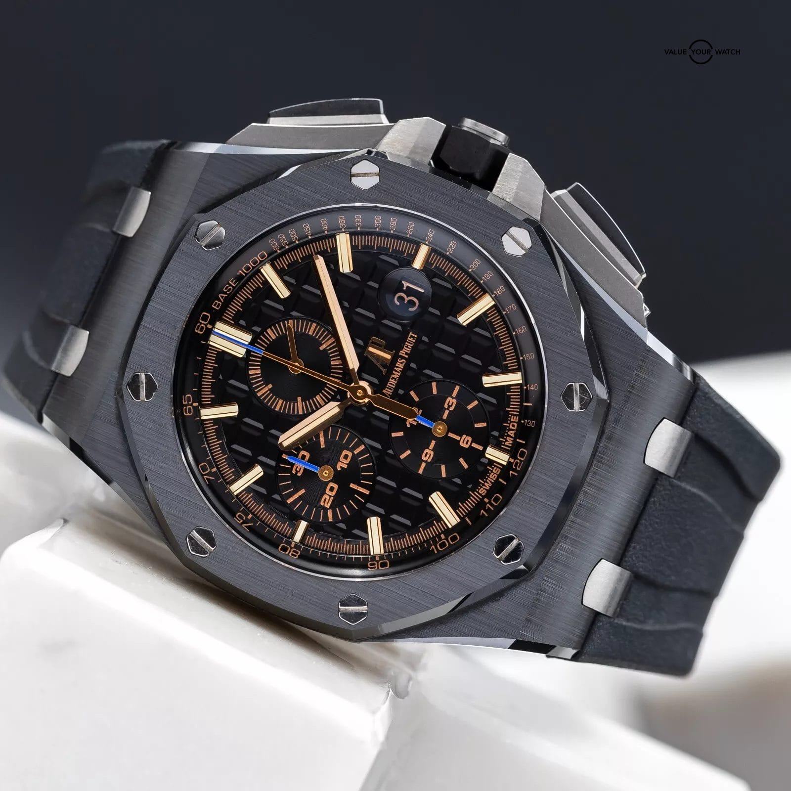 Up for sale is this beautiful AP Royal Oak Offshore in a full black ceramic case that AP does so well! The gold hour markers that contrast beautifully against the black Mega Tapisserie patterned dial. The dial also features royal blue contrasting accents on all the chronograph hands which really pop in the flesh. This piece blends sportiness with luxury and is a favorite of all watch enthusiasts. Grab it while you can!