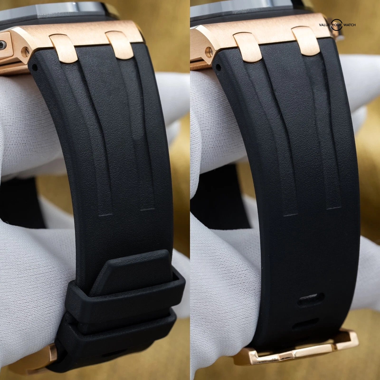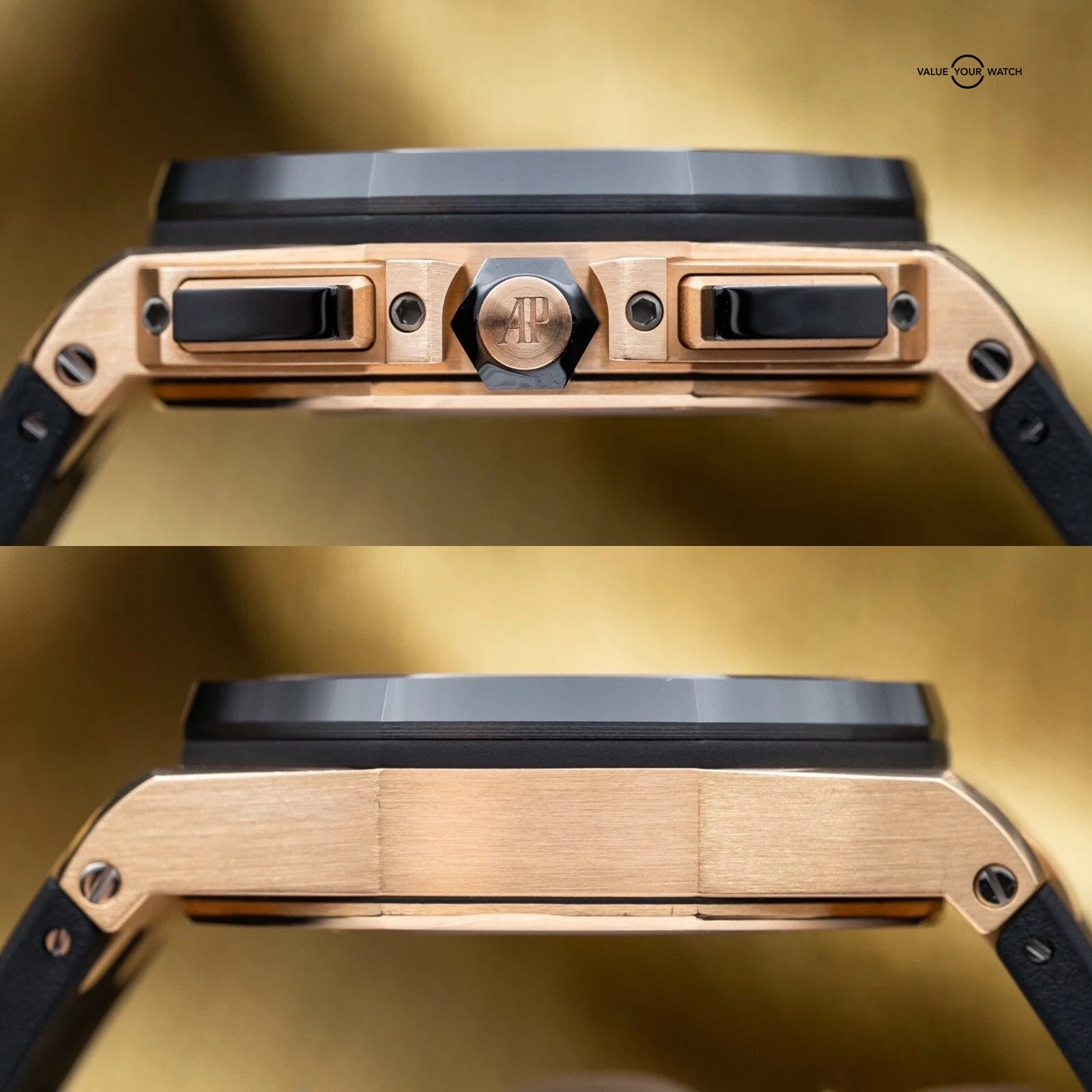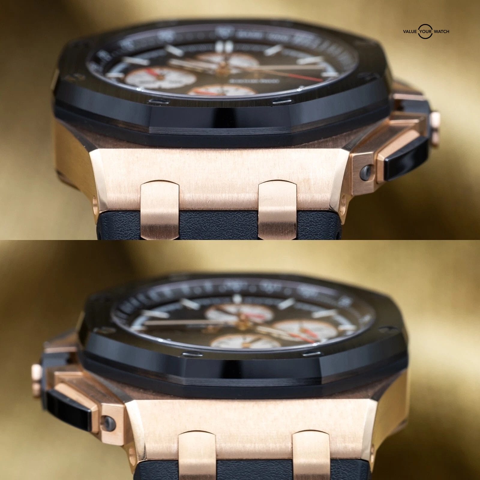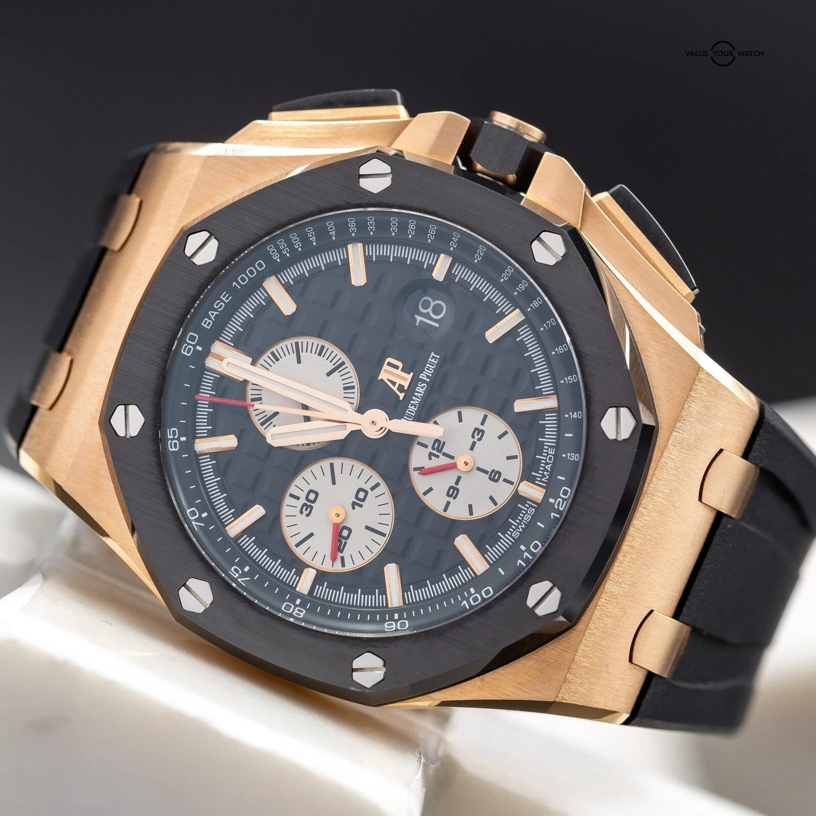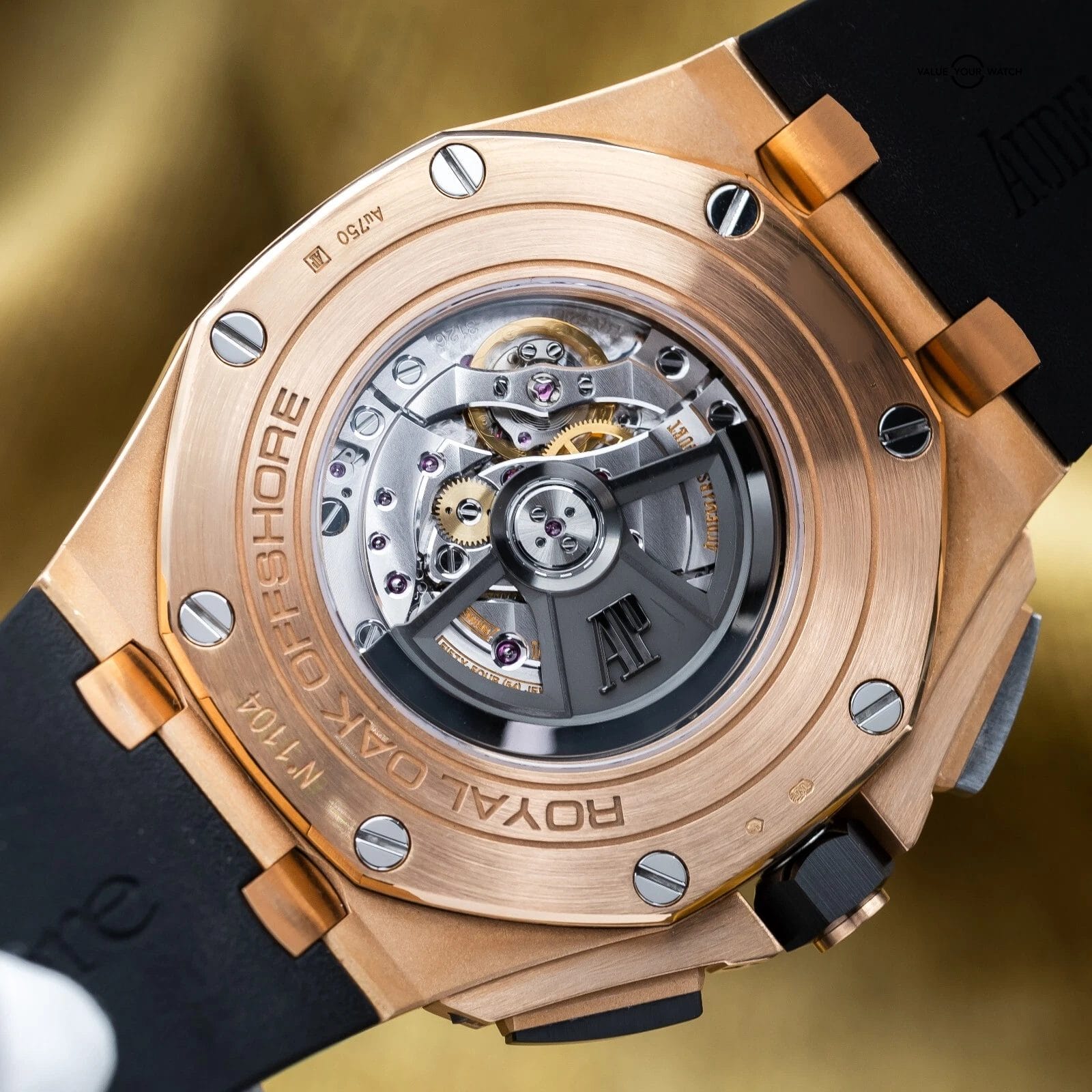 Up for sale is this AP Royal Oak Offshore chronograph 44mm. The combination of the rose gold case, ceramic bezel, rubber strap, and the Mega Tapisserie dial make for a masterpiece and grail offshore. If you don’t have a gold AP this is a great one to start with! And let’s not forget, all of this wraps around the beautiful AP 3126 movement that you can enjoy through the open case back…you can’t beat this one. Grab it while you can!